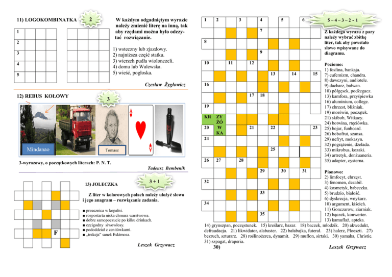 11) LOGOKOMBINATKA W każdym odgadniętym wyrazie należy zmienić literę na inną, tak aby rzędami można było odczytać rozwiązanie. 2 1 2 1) wsteczny lub zjazdowy. 2) najniższa część statku. 3) wierzch pudła wiolonczeli. 4) domu lub Walewska. 5) wieść, pogłoska. 3 4 5 Czesław Żygłowicz 12) REBUS KOŁOWY 1 2 3 4 5 5–4–3–2 6 7 Z każdego wyrazu z pary należy wybrać zbitkę liter, tak aby powstało słowo wpisywane do diagramu. 8 9 10 11 12 13 14 15 16 17 3 18 19 KR 20 ZY ŻÓ W KA 21 22 23 24 Mindanao 25 Tomasz 26 3-wyrazowy, o początkowych literach: P. N. T. Tadeusz Bembenik 13) JOLECZKA 3+1 Z liter w kolorowych polach należy ułożyć słowo i jego anagram – rozwiązanie zadania. F ■ przecznica w kopalni. ■ rozpostarta niska chmura warstwowa. ■ dobre samopoczucie po kilku drinkach. ■ czcigodny siwowłosy. ■ pododdział z zenitówkami. ■ „trakcja” sanek Eskimosa. Leszek Grzywacz 27 28 29 -1 30 Poziomo: 1) fosfina, banksja. 7) eufemizm, chandra. 8) dawczyni, audiotele. 9) dacharz, bałwan. 10) półgęsek, podżegacz. 13) kamfora, przyśpiewka 16) aluminium, college. 17) chrzest, bliźniak. 19) morświn, początek. 21) skibob, Witkacy. 24) botwina, rtęciówka. 25) bojar, funboard. 26) bobofrut, szansa. 29) nefryt, mokasyn. 32) pogrążenie, dżelada. 33) mikrobus, kozaki. 34) artretyk, donżuaneria. 35) adapter, cysterna. 31 Pionowo: 2) limfocyt, chrzęst. 32 3) fenomen, dezabil. 4) kosmetyk, babeczka. 33 5) brudzio, białość. 6) dyskrecja, wnykarz. 34 10) argument, kiścień. 11) Gonczarow, ziarniak. 35 12) bączek, konwerter. 13) kamuflaż, apteka. 14) grynszpan, poczęstunek. 15) kreślarz, bazar. 18) baczek, młodzik. 20) akwedukt, defraudacja. 21) likwidator, alabaster. 22) bałabajka, futerał. 23) halerz, Ploeszti. 27) bezruch, szturarz. 28) roślinożerca, dynamit. 29) muflon, sirtaki. 30) yamaha, Christie. 31) szpagat, draperia. 30) Leszek Grzywacz