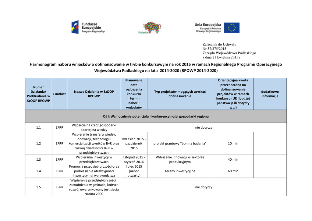Załącznik do Uchwały Nr 37/375/2015 Zarządu Województwa Podlaskiego z dnia 21 kwietnia 2015 r. Harmonogram naboru wniosków o dofinansowanie w trybie konkursowym na rok 2015 w ramach Regionalnego Programu Operacyjnego Województwa Podlaskiego na lata 2014-2020 (RPOWP 2014-2020) Numer Działania/ Fundusz Poddziałania w SzOOP RPOWP Nazwa Działania w SzOOP RPOWP Planowana data ogłoszenia konkursu i termin naboru wniosków Typ projektów mogących uzyskać dofinasowanie Orientacyjna kwota przeznaczona na dofinansowanie projektów w ramach konkursu (UE i budżet państwa jeśli dotyczy w zł) Oś I: Wzmocnienie potencjału i konkurencyjności gospodarki regionu 1.1 EFRR 1.2 EFRR 1.3 EFRR 1.4 EFRR 1.5 EFRR Wsparcie na rzecz gospodarki opartej na wiedzy Wspieranie transferu wiedzy, innowacji, technologii i wrzesień 2015 komercjalizacji wyników B+R oraz październik rozwój działalności B+R w 2015 przedsiębiorstwach Wspieranie inwestycji w listopad 2015 przedsiębiorstwach styczeń 2016 Promocja przedsiębiorczości oraz lipiec 2015 podniesienie atrakcyjności (nabór inwestycyjnej województwa otwarty) Wspieranie przedsiębiorczości i zatrudnienia w gminach, których rozwój uwarunkowany jest siecią Natura 2000 nie dotyczy projekt grantowy "bon na badania" 10 mln Wdrażanie innowacji w sektorze produkcyjnym 40 mln Tereny inwestycyjne 60 mln nie dotyczy dodatkowe informacje Numer Działania/ Fundusz Poddziałania w SzOOP RPOWP Nazwa Działania w SzOOP RPOWP Planowana data ogłoszenia konkursu i termin naboru wniosków Typ projektów mogących uzyskać dofinasowanie Orientacyjna kwota przeznaczona na dofinansowanie projektów w ramach konkursu (UE i budżet państwa jeśli dotyczy w zł) OŚ II: Przedsiębiorczość i aktywność zawodowa Programy podnoszące aktywność zawodową i zdolność do zatrudnienia, obejmujące m.in. następujące działania aktywizujące: 2.1 EFS Zwiększanie zdolności zatrudnieniowej osób pozostających bez zatrudnienia oraz osób poszukujących pracy przy wykorzystaniu aktywnej polityki rynku pracy oraz wspieranie mobilności zasobów pracy 2.2 EFS Działania na rzecz równowagi praca – życie lipiec 2015 sierpień 2015 Udostępnienie usług w zakresie opieki nad dziećmi w wieku do 3 lat poprzez tworzenie nowych miejsc opieki 21 mln 2.3 EFS Wspieranie powstawania i rozwoju podmiotów gospodarczych wrzesień 2015 październik 2015 Bezzwrotne wsparcie dla osób zamierzających rozpocząć prowadzenie działalności gospodarczej 13 mln 2.4 EFS Adaptacja pracowników, przedsiębiorstw i przedsiębiorców do zmian 2.5 EFS Aktywne i zdrowe starzenie się lipiec 2015 sierpień 2015 − − − − wsparcie psychologiczno – doradcze, pośrednictwo pracy, poradnictwo zawodowe, warsztaty oraz szkolenia, w tym z zakresu technik aktywnego poszukiwania pracy i ich praktycznego zastosowania, − subsydiowanie zatrudnienia, − staże, praktyki zawodowe. Wsparcie dla osób zwolnionych, przewidzianych do zwolnienia lub zagrożonych zwolnieniem z pracy z listopad 2015 przyczyn dotyczących zakładu pracy, grudzień 2015 realizowane w formie tworzenia i wdrażania programów typu outplacement nie dotyczy 12 mln 4,8 mln dodatkowe informacje Numer Działania/ Fundusz Poddziałania w SzOOP RPOWP 3.1/ 3.1.1 3.1/3.1.2 3.2/3.2.1 EFS EFS EFS Nazwa Działania w SzOOP RPOWP Kształcenie i edukacja/ Zapewnienie równego dostępu do wysokiej jakości edukacji przedszkolnej. Kształcenie i edukacja / Wzmocnienie atrakcyjności i podniesienie jakości oferty edukacyjnej w zakresie kształcenia ogólnego, ukierunkowanej na rozwój kompetencji kluczowych. Kształtowanie i rozwój kompetencji kadr regionu / Rozwój kompetencji językowych i TIK oraz wsparcie wybranych form kształcenia ustawicznego zgodnie z potrzebami regionalnej gospodarki 3.2/3.2.2 EFS Kształtowanie i rozwój kompetencji kadr regionu / Pozaszkolne formy kształcenia dorosłych 3.3 EFS Kształcenie zawodowe młodzieży na rzecz konkurencyjności Planowana data ogłoszenia Typ projektów mogących uzyskać konkursu dofinasowanie i termin naboru wniosków OŚ III: Kompetencje i kwalifikacje Orientacyjna kwota przeznaczona na dofinansowanie projektów w ramach konkursu (UE i budżet państwa jeśli dotyczy w zł) październik 2015 - listopad 2015 Upowszechnianie wysokiej jakości wychowania przedszkolnego 15 mln wrzesień 2015 październik 2015 Rozwój kompetencji kluczowych oraz rozwijanie indywidualnego podejścia do ucznia Uzupełnienie kompetencji kadry pedagogicznej na rzecz poprawy jakości kształcenia ogólnego 16 mln Projekty grantowe (tzw. „bon na szkolenie”) obejmujące: 1. szkolenia i kursy skierowane do osób dorosłych, które z własnej inicjatywy są zainteresowane rozwijaniem kompetencji w zakresie TIK i języków obcych oraz nabyciem, uzupełnieniem lub podwyższeniem umiejętności poprzez kursy kompetencji ogólnych 2. rozwijanie kompetencji i umiejętności osób dorosłych istotnych z punktu widzenia funkcjonowania na rynku pracy, w celu nabycia lub zmiany posiadanych kwalifikacji i poziomu wykształcenia, poprzez studia podyplomowe 3. poradnictwo edukacyjno-zawodowe skierowane do osób dorosłych, które z własnej inicjatywy są zainteresowane uzyskaniem pomocy w zakresie diagnozy potrzeb oraz wyboru i znalezienia odpowiedniej oferty edukacyjnej. 10 mln Projekty grantowe (tzw. bon na szkolenie) dotyczące pozaszkolnych formy kształcenia dorosłych, takie jak: kwalifikacyjne kursy zawodowe i kursy umiejętności zawodowych 5 mln staże zawodowe i praktyki 20 mln listopad 2015grudzień 2015 lipiec 2015 (nabór dodatkowe informacje Numer Działania/ Fundusz Poddziałania w SzOOP RPOWP Nazwa Działania w SzOOP RPOWP podlaskiej gospodarki Planowana data ogłoszenia konkursu i termin naboru wniosków otwarty) Typ projektów mogących uzyskać dofinasowanie Orientacyjna kwota przeznaczona na dofinansowanie projektów w ramach konkursu (UE i budżet państwa jeśli dotyczy w zł) OŚ IV: Po