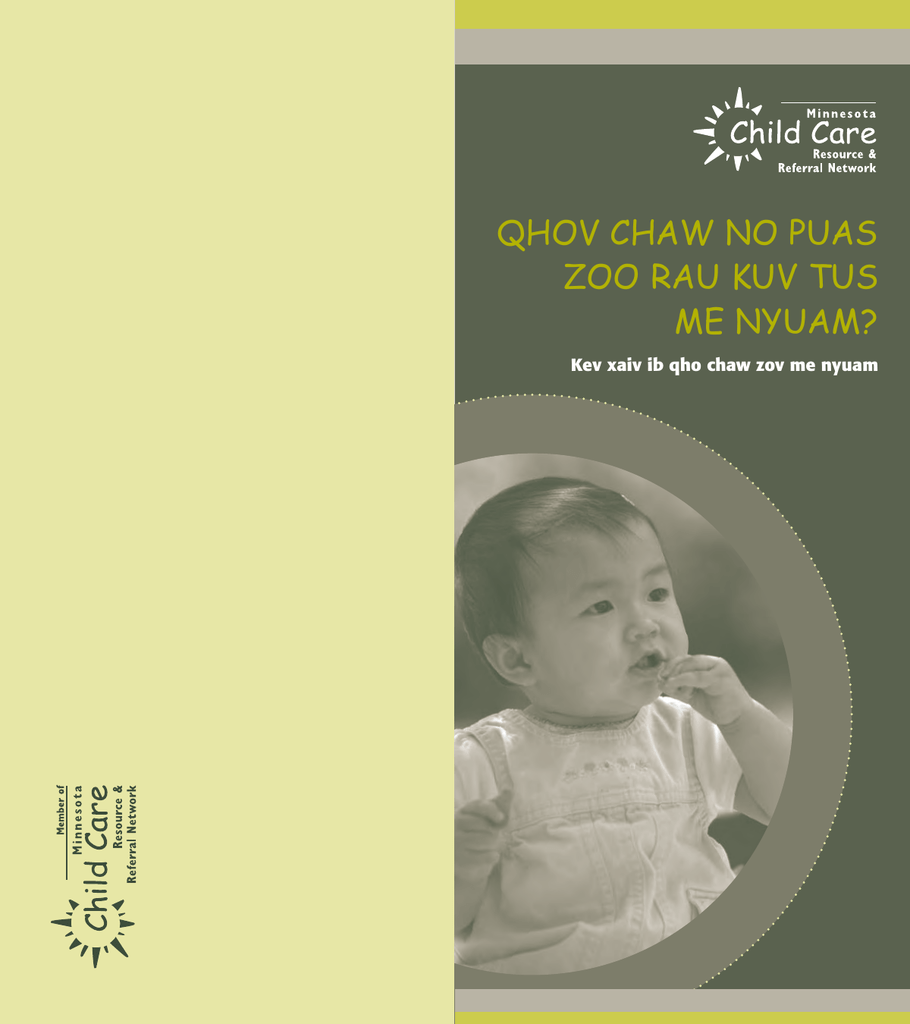 QHOV CHAW NO PUAS ZOO RAU KUV TUS ME NYUAM? Kev xaiv ib qho chaw zov me nyuam KEV XAIV IB QHO CHAW ZOV ME NYUAM Cov niam txiv nyob thoob plaws Minnesota tab tom nrhiav tej kev zov me nyuam uas yuav haum lawv tej kev toob kas thiab yuav pab lawv cov me nyuam kawm ntawv thiab loj hlob. Muaj ob peb tug niam txiv nyob hauv Minnesota uas tau qhia saib lawv txoj kev nrhiav kev zov me nyuam mus zoo li cas: “Txoj kev nrhiav ib qho chaw zov me nyuam zoo rau kuv cov me nyuam tsis yog tias nhriav kom tau ib tug neeg saib lawv thaum kuv mus ua hauj lwm xwb. Kuj yog kev nrhiav kom tau ib qho chaw uas cov me nyuam kawm tau ntawv thiab nyob puaj phais thiab. Kuv xav kom cov me nyuam xav tias lawv tseem ceeb thiab tej qhov chaw zov me nyuam kuj xav li ntawd thiab. Txhua zaus uas kuv mus xyuas, kuv yeej nug kuv tus kheej hais tias, ‘Cov me nyuam hauv no puas zoo li lawv muaj kev zoo siab?’ thiab ‘Cov nai khu puas zoo li lawv muaj kev zoo siab thiab lawv puas xav ntsib kuv cov me nyuam?’” — Dina Mendez, leej niam ntawm Adriana, Tomas thiab Kaitlin “Kuv paub kuv tus me nyuam zoo tshaj plaws thiab paub tias qhov chaw zov me nyuam twg thiaj li yuav zoo tshaj plaws rau nws. Kuj yog ib qho zoo uas yuav tsum muaj daim ntawv muaj cov lus nug rau niam txiv kom thiaj li kawm tau ntxiv saib cov me nyuam toob kas dab tsi thiab dab tsi thiaj li yuav pab nws kawm tau zoo tshaj thaum nws nrog cov nai khu no nyob.” — Molly Jensen, leej niam ntawm Johanna “Thaum chiv thawj txoj kev nrhiav no kuj txaus ntshai thiab tab sis tom qab uas paub tias peb yuav tsum nrhiav li cas rau li cas lawm ces kuj pab tau lawm thiab. Thaum kuv paub tias thawj thawj ob peb xyoos ntawm txoj kev kawm hauv kuv tus me nyuam lub neej tseem ceeb heev no, kuv tau xav tias tseem ceeb uas peb yuav tsum nrhiav kom tau qhov chaw zoo tshaj plaws li. Kuv nyeem daim ntawv uas muaj cov lus nug rau niam txiv thiab kuj nug ob peb lo lus uas nyob hauv daim ntawv no thiab. Kuv thiaj li txaus siab rau qhov chaw uas kuv tus tub mus nyob txhua hnub thiab kuv zoo siab tias kuv yog tus uas nrhiav tau tej kev zoo no rau kuv tus tub.” — Jon Maxwell, leej txiv ntawm Tanner Yog xav tau tej lo lus rau tej hom kev zov me nyuam no, ces thov saib ua ntej mus rau phab 7. 1 QHOV CHAW NO PUAS ZOO RAU KUV TUS ME NYUAM? TEJ QHOV UAS COV KHOOS KAS ZOV ME NYUAM MUAJ TAU Qhov uas xaiv kev zov me nyuam rau koj tus me nyuam thaum TSUAS YOG QHIA TIAS MUAJ LWM YAM XWB, YOG TIAS TSIS QHIA CES COV LUS NUG PUAV LEEJ HAUM RAU TXHUA QHOV CHAW ZOV ME NYUAM. koj mus ua hauj lwm los sis mus kawm ntawv lawm yog ib qho kev txiav txim siab uas tseem ceeb tshaj plaws uas koj yuav tau xaiv thaum koj ua leej niam leej txiv lawm. Tej yam uas muaj rau hauv ib tug neeg twg lub neej thaum nws tseem yau yuav ua rau nws nco ntsoov mus tas ib sim neej. Vim hais tias 90 feem pua ntawm ib tug me nyuam lub paj hlwb twb loj txaus thaum nws muaj hnub nyoog tsib xyoos lawm, txoj kev tu me nyuam zoo thaum tus me nyuam yog me nyuam mos liab mus txog rau thaum nws pib mus kawm ntawv preschool yuav pab tau nws ntau heev li. Cov me nyuam uas twb pib kawm ntawv lawm los tseem toob kas kev tu zoo zoo thiab. Daim ntawv uas muaj cov lus nug no twb yog npaj los pab koj kom koj thiaj li paub xaiv qhov chaw zov me nyuam zoo KEV SAIB XYUAS Puas yuav muaj neeg saib xyuas kuv tus me nyuam? 1 23 Cov neeg laus puas ua zoo thiab puas hu neeg luag ntxhi? nug yog tej yam uas twb tshawb nrhiav tau tias qhov twg thiaj li tseem ceeb los ua kom thiaj li tiv thaiv tau thiab ua zoo tu cov me cov lus nug no twb yog National Association of Child Care Resource & Referral Agencies sau, kom los pab koj paub tias yuav tsum nrhiav tej chaw zoo li cas thiab nug saib hom khoos kas twg thiaj li yuav puaj phais, zoo thiab ua rau koj tus me nyuam muaj kev zoo siab. Yog xav tau ntaub ntawv ntxiv no, txuas rau www. T ej kev cai puaj phais puas muaj qhia kom meej thiab yooj yim rau cov me nyuam paub? zoo zoo rau cov me nyuam thaum ua txhaum lawm los sis lawv puas nthe, ntaus, thiab siv lwm yam kev rau txim uas tsis zoo xwb? rau koj txoj kev toob kas. nyuam ntawm tej qhov chaw zov me nyuam. Daim ntawv muaj Lawv puas saib ib tug me nyuam zuj zus? Cov neeg laus puas ua tib zoo hais thiab qhia thiab to taub txog tej kev zov me nyuam uas yuav tsim nyog Tej yam uas muaj nyob rau hauv niam txiv daim ntawv muaj lus uas muaj neeg saib cov me nyuam txhua lub P sij hawm, hais txog thaum lawv tsaug zog lawm thiab si? uas muaj cov neeg ua hauj lwm txaus los saib P xyuas tag nrho cov me nyuam (saib daim ntawv qhia kev cai saib yuav tsum muaj pes tsawg tus neeg-laus-rau-pes-tsawg-tus-me-nyuam uas nyob rau phab 7)? KEV KAWM Cov neeg laus puas tau kawm los zov cov me nyuam? Rau ib lub koom haum zov me nyuam (ib lub khoos kas uas zov me nyuam hauv ib lub tsev pab neeg nyob hauv zos, ib qho chaw teev ntuj los sis lwm tej chaws): 1 23 mnchildcare.org. Tus thawj coj loj puas muaj ib daim degree Khij lub npov ntawm lub khoos kas uas koj xav tias zoo. Sau Cov nai khu puas tau kawm txog kev zov me txhua lub khoos kas lub npe rau nram qab no thiab siv tej leej npov uas koj tau khij lawm los pab koj nco tau txog thaum koj tau mus ntsib lawv.. Qhov 1: Qhov 2: Qhov 3: thiab puas tau zov cov me nyuam dua los li? nyuam ntawm nyuam nyuam los sis puas tau muaj ib daim degree kev kawm uas qhia txog cov me yaus thiab puas tau zov cov me dua los li? Tag nrho cov neeg laus puas tseem rov qab mus kawm txog tej yam uas qhia txog cov me nyuam yaus los sis puas tseem kawm ntawv ntxiv thiab? au ib qho chaw zov me nyuam hauv tsev (zov cov me R nyuam hauv tus neeg zov lub tsev): Tus neeg zov me nyuam no puas tau kawm txog cov me nyuam tej kev loj hlob thiab puas tau zov me nyuam dua los li? 2 3 1 23 1 23 Tus neeg zov me nyuam no puas tseem rov qab Puas yuav muaj leej twg nyeem ntawv ib hnub Rau lub koom haum zov me nyuam thiab qhov chaw zov me nyuam hauv tsev: KEV NOJ QAB NYOB ZOO THIAB KEV PUAJ PHAIS Qhov chaw no puas puaj phais thiab zoo rau kuv tus me nyuam? mus ka