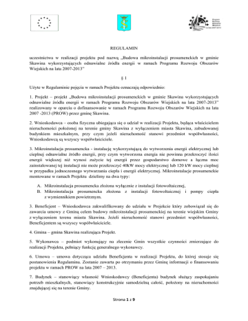 REGULAMIN uczestnictwa w realizacji projektu pod nazwą „Budowa mikroinstalacji prosumenckich w gminie Skawina wykorzystujących odnawialne źródła energii w ramach Programu Rozwoju Obszarów Wiejskich na lata 2007-2013” §1 Użyte w Regulaminie pojęcia w ramach Projektu oznaczają odpowiednio: 1. Projekt – projekt „Budowa mikroinstalacji prosumenckich w gminie Skawina wykorzystujących odnawialne źródła energii w ramach Programu Rozwoju Obszarów Wiejskich na lata 2007-2013” realizowany w oparciu o dofinansowanie w ramach Programu Rozwoju Obszarów Wiejskich na lata 2007 -2013 (PROW) przez gminę Skawina. 2. Wnioskodawca – osoba fizyczna ubiegająca się o udział w realizacji Projektu, będąca właścicielem nieruchomości położonej na terenie gminy Skawina z wyłączeniem miasta Skawina, zabudowanej budynkiem mieszkalnym, przy czym jeżeli nieruchomość stanowi przedmiot współwłasności, Wnioskodawcą są wszyscy współwłaściciele. 3. Mikroinstalacja prosumencka - instalację wykorzystującą do wytworzenia energii elektrycznej lub cieplnej odnawialne źródło energii, przy czym wytworzona energia nie powinna przekroczyć ilości energii większej niż wynosi zużycie tej energii przez gospodarstwo domowe a łączna moc zainstalowanej tej instalacji nie może przekroczyć 40kW mocy elektrycznej lub 120 kW mocy cieplnej w przypadku jednoczesnego wytwarzania ciepła i energii elektrycznej. Mikroinstalacje prosumenckie montowane w ramach Projektu dzielimy na dwa typy: A. Mikroinstalacja prosumencka złożona wyłącznie z instalacji fotowoltaicznej, B. Mikroinstalacja prosumencka złożona z instalacji fotowoltaicznej i pompy ciepła z wymiennikiem powietrznym. 3. Beneficjent – Wnioskodawca zakwalifikowany do udziału w Projekcie który zobowiązał się do zawarcia umowy z Gminą celem budowy mikroinstalacji prosumenckiej na terenie wiejskim Gminy z wyłączeniem terenu miasta Skawina. Jeżeli nieruchomość stanowi przedmiot współwłasności, Beneficjentem są wszyscy współwłaściciele. 4. Gmina – gmina Skawina realizująca Projekt. 5. Wykonawca – podmiot wykonujący na zlecenie Gmin wszystkie czynności zmierzające do realizacji Projektu, pełniący funkcję generalnego wykonawcy. 6. Umowa – umowa dotycząca udziału Beneficjenta w realizacji Projektu, do której stosuje się postanowienia Regulaminu. Zostanie zawarta po otrzymaniu przez Gminę informacji o finansowaniu projektu w ramach PROW na lata 2007 – 2013. 7. Budynek – stanowiący własność Wnioskodawcy (Beneficjenta) budynek służący zaspokajaniu potrzeb mieszkalnych, stanowiący konstrukcyjnie samodzielną całość, położony na nieruchomości znajdującej się na terenie Gminy. Strona 1 z 9 8. Instalacja fotowoltaiczna - zespół urządzeń i instalacji które przekształcają promieniowanie słoneczne bezpośrednio w elektryczność. 9. Instalacja pompy ciepła - zespół urządzeń i instalacji które używają powietrza zewnętrznego jako źródło ciepła dla podniesienia temperatury czynnika grzewczego. 10. Dofinansowanie – pomoc udzielona na podstawie umowy o jej udzielenie w ramach Programu Rozwoju Obszarów Wiejskich na lata 2007 -2013 w ramach działania „Podstawowe usługi dla gospodarki i ludności wiejskiej” wynosząca nie więcej niż 50% kosztów kwalifikowanych projektu. §2 1. Regulamin określa zasady uczestnictwa w realizacji Projektu, którego celem jest zwiększenie na terenie Gmin efektywności energetycznej i zwiększenie redukcji emisji zanieczyszczeń, w szczególności gazów cieplarnianych i niebezpiecznych substancji, poprzez wprowadzenie systemów energii odnawialnej. 2. Termin zakończenia montażu instalacji na terenie Gminy jest planowany na 01 października 2015 r., przy czym termin ten może ulec zmianie. Informacja o dacie faktycznego zakończenia Projektu zostanie zamieszczona na stronie internetowej Gminy. 3. Uczestnictwo w Projekcie jest dobrowolne. Warunkiem uczestnictwa w Projekcie, jest: a) mikroinstalacja prosumencka w ramach Projektu może zostać zamontowana tylko na terenie wiejskim Gminy. W ramach Projektu nie jest możliwe zamontowanie instalacji na terenie miasta Skawina, b) złożenie przez Wnioskodawcę prawidłowo wypełnionej ankiety kwalifikacyjnej, której wzór stanowi Załącznik nr I do Regulaminu, kopii dokumentów potwierdzających ilość zużywanej energii elektrycznej oraz dokumentów potwierdzających prawo własności do nieruchomości, c) przysługiwanie Wnioskodawcy prawa własności Budynku, d) istnienie technicznych możliwości montażu mikroinstalacji prosumenckiej, e) brak jakichkolwiek wymagalnych zobowiązań wnioskodawcy (wnioskodawców) wobec Gminy, w tym zaległości podatkowych, f) po podpisaniu przez Gminę o dofinansowanie działań w projekcie ze środków PROW 2007 – 2013 uiszczenie przez Wnioskodawcę opłaty za udział w Projekcie w wysokości odpowiadającej 40% kosztów netto montowanej mikroinstalacji prosumenckiej (po zawarciu Umowy z Gminą). O planowanym terminie rozpoczęcia prac mieszkaniec zostanie odrębnie poinformowany, g) brak istniejącej mikroinstalacji prosumenckiej na nieruchomości dofinansowanej z funduszy publicznych. 4. Wysokość wpłaty o której mowa w ust. 3 lit. e) ustalona będzie na podstawie przeprowadzonych postępowań przetargowych na wykonanie robót, obejmujących przede wszystkim zaprojektowanie i montaż mikroinstalacji prosumenckiej wraz z dostawą materiałów i urządzeń niezbędnych do ich wykonania, uruchomienie mikroinstalacji, nadzór inwestorski, odbiory, przeglądy i konserwację mikroinstalacji, Strona 2 z 9 5. Jeżeli nieruchomość, na której jest położony Budynek mieszkalny, stanowi przedmiot współwłasności, wszystkie te osoby muszą być łącznie stronami Umowy i wszystkie te osoby muszą spełniać określone warunki. W takim przypadku wszelkie zobowiązania wynikające z Umowy współwłaściciele zaciągają solidarnie (zgo