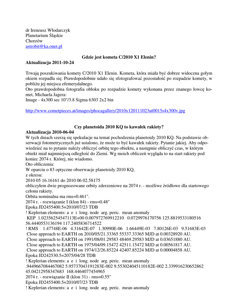 dr Ireneusz Włodarczyk Planetarium Śląskie Chorzów [email protected] Gdzie jest kometa C/2010 X1 Elenin? Aktualizacja 2011-10-24 Trwają poszukiwania komety C/2010 X1 Elenin. Kometa, która miała być dobrze widoczna gołym okiem rozpadła się. Prawdopodobnie udało się sfotografować pozostałość po rozpadzie komety, w pobliżu jej miejsca efemerydalnego. Oto prawdopodobna fotografia obłoku po rozpadzie komety wykonana przez znanego łowcę komet, Michaela Jagera: Image - 4x300 sec 10"/3.8 Sigma 6303 2x2 bin http://www.cometpieces.at/images/phocagallery/2010x120111023ut0015s4x300v.jpg Czy planetoida 2010 KQ to kawałek rakiety? Aktualizacja 2010-06-04 W tych dniach szerzą się spekulacje na temat pochodzenia planetoidy 2010 KQ. Na podstawie obserwacji fotometrycznych już ustalono, że może to być kawałek rakiety. Pytanie jakiej. Aby odpowiedzieć na to pytanie należy obliczyć orbitę tego obiektu, a następnie obliczyć czas, w którym obiekt miał najmniejszą odległość do Ziemi. Wg moich obliczeń wygląda to na start rakiety pod koniec 2074 r. Której, nie wiadomo. Oto obliczenia: W oparciu o 83 optyczne obserwacje planetoidy 2010 KQ, z okresu: 2010 05 16.16161 do 2010 06 02.58175 obliczyłem dwie prognozowane orbity zderzeniowe na 2074 r. - możliwe źródłowe dla startowego członu rakiety. Orbita nominalna ma rms=0.461". 2074 r. - rozwiązanie I (klon 84) - rms=0.48" Epoka JD2455400.5=2010/07/23 TDB ! Keplerian elements: a e i long. node arg. peric. mean anomaly KEP 1.02356254547113E+00 0.007972769912210 0.0729976170756 125.8819533180516 56.4440553136194 117.2405836714522 ! RMS 1.47748E-06 4.31642E-07 1.30990E-06 1.66449E-03 7.80126E-03 9.51683E-03 Close approach to EARTH on 2010/05/21.33365 55337.33365 MJD at 0.00328920 AU. Close approach to EARTH on 1991/08/01.29583 48469.29583 MJD at 0.03651880 AU. Close approach to EARTH on 1975/04/09.15472 42511.15472 MJD at 0.00561817 AU. Close approach to EARTH on 1974/12/26.85224 42407.85224 MJD at 0.00004858 AU. Epoka JD242530.5=2075/04/28 TDB ! Keplerian elements: a e i long. node arg. peric. mean anomaly .9449667084467082 5.95737043191283E-002 9.553024045110182E-002 2.339916230652862 45.04212958347683 168.4464077454965 2074 r. - rozwiązanie II (klon 31) - rms=0.55" Epoka JD2455400.5=2010/07/23 TDB ! Keplerian elements: a e i long. node arg. peric. mean anomaly KEP 1.02355941318377E+00 0.007971856337055 0.0730001695373 125.8785314765688 56.4275382946954 117.2607605026191 ! RMS 1.47747E-06 4.31131E-07 1.30982E-06 1.66421E-03 7.80375E-03 9.51905E-03 Close approach to EARTH on 2010/05/21.33361 55337.33361 MJD at 0.00328920 AU. Close approach to EARTH on 1991/08/01.60806 48469.60806 MJD at 0.03661795 AU. Close approach to EARTH on 1975/04/26.69272 42528.69272 MJD at 0.00095877 AU. Close approach to EARTH on 1974/12/19.46947 42400.46947 MJD at 0.00007434 AU. Epoka JD242530.5=2075/04/28 TDB ! Keplerian elements: a e i long. node arg. peric. mean anomaly .9573476682352167 6.474516497755441E-002 .627257363300771 35.95063050585124 324.7289972419416 221.43409627746 Czy doszło do zderzenia komety z asteroidą lub też dwóch asteroid ze sobą? Aktualizacja 2010-02-06 Na taka możliwość wskazuje obraz obiektu P/2010 A2 wykonany teleskopem Huble’a. Niektórzy uważali, że dwa blisko siebie na niebie obiekty mają wspólne zderzeniowe pochodzenie: P/2010 A2 oraz 2010 AA15. Istnieje też podejrzenie, że kometa P/2010A2, może być obiektem powstałym w wyniku niedawnego zderzenia dwóch planetoid. Korzystając z wszystkich 141 obserwacji z MPC, z których 104 wykorzystałem, z okresu: 2010 01 06.27428 do 2010 01 25.87510 obliczyłem orbitę tej komety wraz z błędami, rms=1.137". Epoka: JD 2455209.5 TDT = 2010/01/13 ! Keplerian elements: a, e, i, long. node, arg. peric., mean anomaly KEP 2.29223165626233E+00 0.123838960725898 5.2735282303355 320.2059300670190 132.8908091712035 11.5011577285529 ! RMS 7.82660E-04 1.89351E-04 7.70220E-03 3.19598E-02 3.97239E-01 3.29128E-01 Minimalna odległość miedzy dwoma obiektami: P/2010 A2 i 2010 AA15 w latach 1995-2017 wyniosła u mnie 0.0155 AU i nastąpiła 22 listopada 2009 roku. Wynik obliczyłem dla orbity nominalnej. Wykres poniżej. odleglosc P/2010 A2 - 2010 AA15 [AU] 1.0 0.8 0.6 0.4 0.2 0.0 0 2000 4000 6000 dni od MJD 50000 (1995/10/10) 8000 Obserwacje z satelity WISE Aktualizacja 2010-01-27 Ma być coraz wiecej obserwacji optycznych z satelity WISE. Są już dwie obserwacje planetoidy 2010AB78. W oparciu o 8 obserwacji optycznych, w tym dwie z WISE, uzyskałem następującą orbitę wraz z blędami 1-sigma: Epoka JD2455200.5=2010/01/04 TDB. ! Keplerian elements: a, e, i, long. node, arg. peric., mean anomaly KEP 2.24330052982550E+00 0.542563458625554 33.1831495342709 316.9753863995504 296.4249997761571 326.5802898602031 ! RMS 9.85226E-02 1.41149E-02 2.15623E-01 3.44783E-01 1.86376E+00 2.58020E+00 Obliczyłem, ze asteroida ma wiele zbliżeń z Ceres m.in. 2045/08/19.72482 - 0.009 AU, z Westą m.in. 2046/03/28.01951 - 0.012 AU i z Marsem np. 2018/08/14.02357 - 0.056 AU. Obliczenia wykonałem dla rozrzutu błędów 3 sigma. Zbliżenie planetoidy 2010AL30 z Ziemią Aktualizacja 2010/01/17 Planetoida 2010AL30 o średnicy ok. 10m przeleciała 13 stycznia 2010 r. ok. 12:30 UTC w odległości równej 1/3 odległości Ziemia- Księżyc! Zbliżenia planetoidy 2009DD45 z Ziemią Aktualizacja 2009/05/16 Planetoida 2009DD45 o średnicy ok. 30 m przeleciała 2009/03/02.57431 UTC w odległości ok. 0.00048 AU (j. astr.), czyli ok. 72 tys. km od Ziemi. J. astr. jest to jednostka astronomiczna – średnia odległość Ziemia-Słońce. Wynosi ok. 149,6 mln km. Obliczenia wykonałem w oparciu o wspominany już wcześniej program grupy włosko-hiszpańskiej OrbFit. W ciągu najblizszych 100 lat będą możliwe podobne zbliżenia planetoidy 2009DD45 z Ziemią, co przedstawiono na poniższym rysunku. Obliczenia wykonano korzystając ze zmodyfikowanego wpomnianego programu OrbFit dokonując wyboru