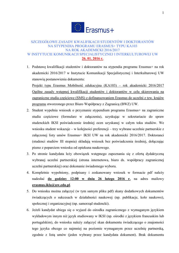 1 SZCZEGÓŁOWE ZASADY KWALIFIKACJI STUDENTÓW I DOKTORANTÓW NA STYPENDIA PROGRAMU ERASMUS+ TYPU KA103 NA ROK AKADEMICKI 2016/2017 W INSTYTUCIE KOMUNIKACJI SPECJALISTYCZNEJ I INTERKULTUROWEJ UW 26. 01. 2016 r. 1. Podstawę kwalifikacji studentów i doktorantów na stypendia programu Erasmus+ na rok akademicki 2016/2017 w Instytucie Komunikacji Specjalistycznej i Interkulturowej UW stanowią postanowienia dokumentu: Projekt typu Erasmus Mobilność edukacyjna (KA103) – rok akademicki 2016/2017 Ogólne zasady wstępnej kwalifikacji studentów i doktorantów w celu skierowania na zagraniczne studia częściowe (SMS) z dofinansowaniem Erasmus do uczelni z tzw. krajów programu stworzonego przez Biuro Współpracy z Zagranicą (BWZ) UW. 2. Student wypełnia wniosek o przyznanie stypendium programu Erasmus+ na zagraniczne studia częściowe (formularz w załączeniu), uzyskując w sekretariacie do spraw studenckich IKSI poświadczenie średniej ocen uzyskanej w całym toku studiów. We wniosku student wskazuje – w kolejności preferencji – trzy wybrane uczelnie partnerskie z załączonej listy umów Erasmus+ IKSI UW na rok akademicki 2016/2017. Doktoranci (studenci studiów III stopnia) składają wniosek bez poświadczenia średniej, dołączając pismo z poparciem wniosku od opiekuna naukowego. 3. Po stronie kandydata leży obowiązek wstępnego zapoznania się z ofertą dydaktyczną wybranej uczelni partnerskiej (strona internetowa, biuro ds. współpracy zagranicznej uczelni partnerskiej) oraz dokonanie świadomego wyboru. 4. Kompletnie wypełniony, podpisany i zeskanowany wniosek w formacie pdf należy nadesłać do godziny 12:00 w dniu 26 lutego 2016 r. na adres mailowy [email protected]. 5. Do wniosku można załączyć (w tym samym pliku pdf) skany dodatkowych dokumentów świadczących o sukcesach w działalności naukowej (np. publikacje, koło naukowe), społecznej i organizacyjnej (np. samorząd studencki). 6. Jeżeli kandydat ubiega się o wyjazd do ośrodka zagranicznego z wymaganym językiem wykładowym innym niż język studiowany w IKSI (np. ośrodki z językiem francuskim lub portugalskim), do wniosku należy załączyć skan dokumentu świadczącego o znajomości tego języka obcego co najmniej na poziomie wymaganym przez uczelnię partnerską, zgodnie z listą umów (jeden wybrany przez kandydata dokument). Brak dokumentu 2 poświadczającego znajomość języka wykładowego co najmniej na poziomie wymaganym przez uczelnię partnerską w tym przypadku dyskwalifikuje kandydata. 7. W rekrutacji mogą na zasadach ogólnych brać udział studenci studiów wieczorowych i zaocznych IKSI. W razie wyjazdu na stypendium, zachowując status studentów UW, nie są oni jednak na ten okres zwolnieni z opłat za studia w IKSI. 8. W rekrutacji mogą brać udział, za zgodą koordynatora ds. mobilności z własnej jednostki macierzystej, zainteresowani studenci innych jednostek UW. Stypendia mogą zostać im przyznane w ramach dostępności miejsc w ostatniej kolejności po zapewnieniu możliwości wyjazdu zgłoszonym studentom IKSI UW. 9. Studenci IKSI mogą również brać udział w rekrutacji na zagraniczne studia częściowe Erasmus+ w innej jednostce UW, według ustalonych tam zasad, o ile uzyskają na to zgodę koordynatora ds. mobilności danej jednostki. 10. Przyznając stypendia, Komisja kieruje się następującymi kryteriami, według poniższej hierarchii ważności: a) Pierwszeństwo mają osoby, które ubiegają się o stypendium na zagraniczne studia częściowe po raz pierwszy (tzn. nie wyjeżdżały wcześniej na zagraniczne studia częściowe w ramach dotychczasowego programu LLP Erasmus lub Erasmus+). Zgodnie z zasadami programu Erasmus+, można jednak wielokrotnie korzystać ze stypendium w kolejnych latach, o ile Instytut dysponuje wolnymi miejscami na wyjazd stypendialny po zapewnieniu wyjazdów chętnym studentom „pierwszorazowym”. b) Pierwszeństwo mają doktoranci IKSI przed studentami studiów I i II stopnia. c) Pierwszeństwo mają kandydaci, dla których język wykładowy wymagany przez daną uczelnię partnerską jest językiem ich specjalizacji w ramach studiów w IKSI. Dopiero z pozostałych wolnych miejsc mogą skorzystać kandydaci, którzy przedstawią zewnętrzny certyfikat znajomości danego języka wykładowego. Przykład: Na wyjazdy do uczelni partnerskich wymagających znajomości wyłącznie języka włoskiego kwalifikowani są w pierwszej kolejności studenci sekcji włoskiej IKSI (włoski jako pierwszy lub drugi język specjalności), w drugiej zaś kolejności – studenci pozostałych sekcji, którzy przedstawią certyfikat znajomości języka włoskiego. Natomiast jeżeli uczelnia partnerska we Włoszech wymaga znajomości języka włoskiego lub angielskiego lub niemieckiego, na równych prawach mogą się ubiegać o takie miejsce studenci sekcji włoskiej, angielskiej i niemieckiej IKSI. d) Po uwzględnieniu powyższych punktów a), b) i c) listę rankingową tworzy się na podstawie kryterium średniej ocen z całego toku studiów. Jedynie w przypadku dwóch kandydatów o takiej samej średniej, starających się o przyznanie wyjazdu do tego samego 3 ośrodka zagranicznego, o wyniku decydują dodatkowo osiągnięcia, o których mowa w punkcie 5. e) W przypadku gdy o wyjazd do tego samego ośrodka starają się studenci IKSI z taką samą średnią ocen, a o ich pozycji na liście rankingowej nie przesądzają również udokumentowane dodatkowe osiągnięcia, jako dodatkowe kryterium przyjmuje się pierwszeństwo dla studentów wyższych lat studiów, a w ostateczności – alfabetyczną kolejność nazwisk. 11. Wyniki rekrutacji zostaną ustalone podczas posiedzenia komisji rekrutacyjnej Erasmus+ IKSI w co najmniej trzyosobowym składzie: - koordynator ds. mobilności IKSI; - wyznaczony pracownik naukowy Instytutu; - przedstawiciel samorządu studenckiego. 12. Wyniki rekrutacji zostaną opublikowane w pierwszych dniach marca 2016 r. 