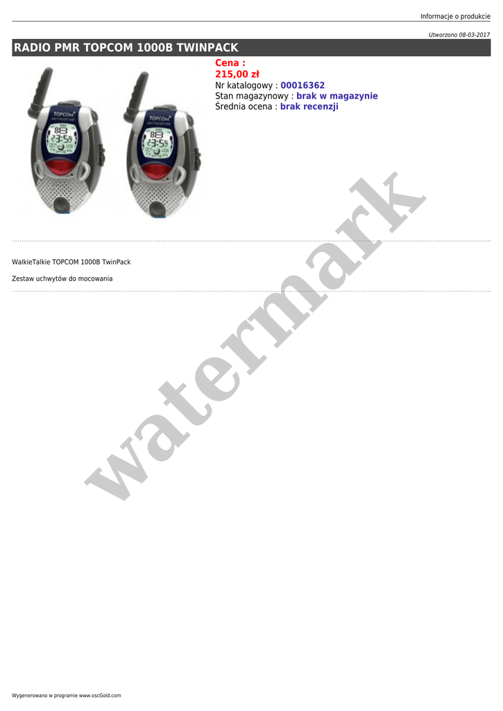 Informacje o produkcie Utworzono 08-03-2017 RADIO PMR TOPCOM 1000B TWINPACK Cena : 215,00 zł WalkieTalkie TOPCOM 1000B TwinPack w at Zestaw uchwytów do mocowania er m ar k Nr katalogowy : 00016362 Stan magazynowy : brak w magazynie Średnia ocena : brak recenzji Wygenerowano w programie www.oscGold.com