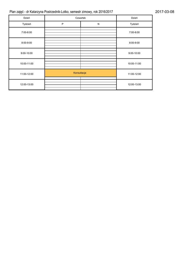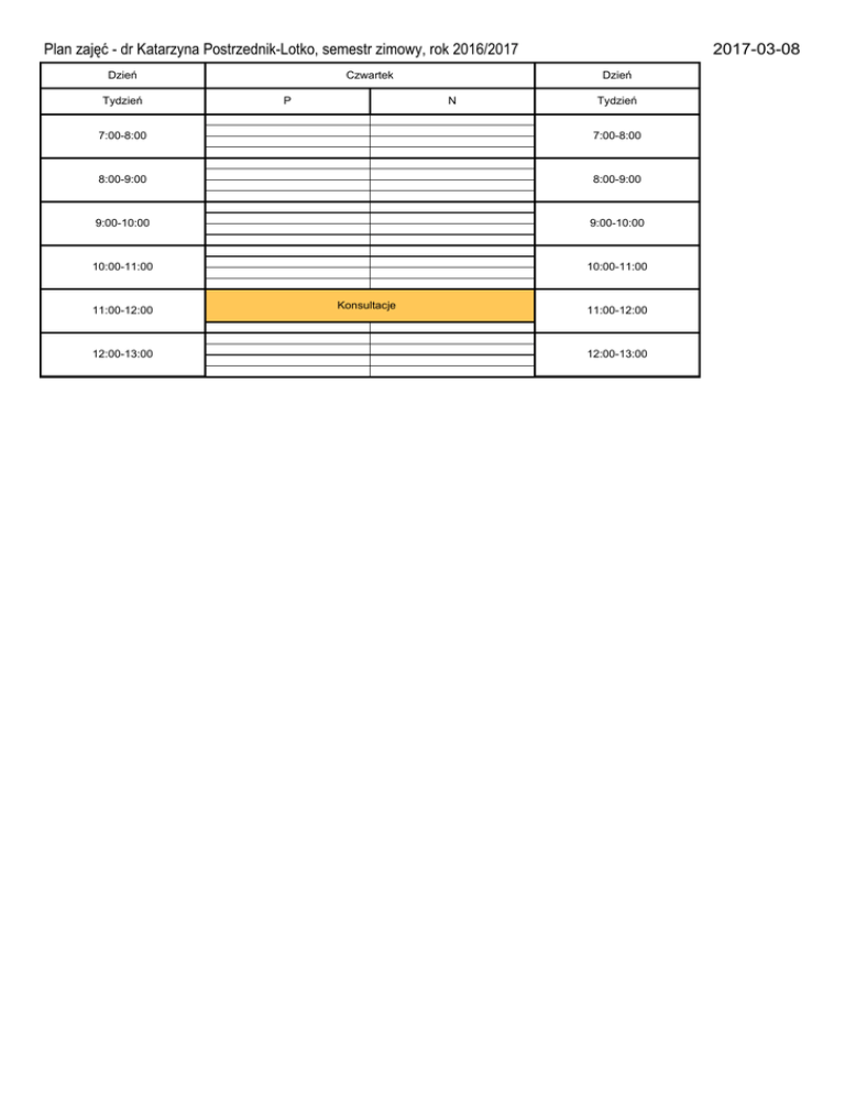 Plan zajęć - dr Katarzyna Postrzednik-Lotko, semestr zimowy, rok 2016/2017 Dzień Tydzień Czwartek P 2017-03-08 Dzień N Tydzień 7:00-8:00 7:00-8:00 8:00-9:00 8:00-9:00 9:00-10:00 9:00-10:00 10:00-11:00 10:00-11:00 11:00-12:00 12:00-13:00 Konsultacje 11:00-12:00 12:00-13:00