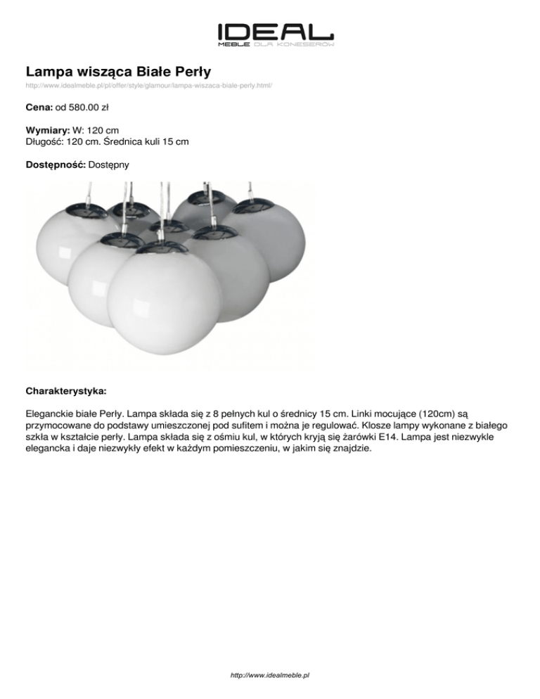 Lampa wisząca Białe Perły http://www.idealmeble.pl/pl/offer/style/glamour/lampa-wiszaca-biale-perly.html/ Cena: od 580.00 zł Wymiary: W: 120 cm Długość: 120 cm. Średnica kuli 15 cm Dostępność: Dostępny Charakterystyka: Eleganckie białe Perły. Lampa składa się z 8 pełnych kul o średnicy 15 cm. Linki mocujące (120cm) są przymocowane do podstawy umieszczonej pod sufitem i można je regulować. Klosze lampy wykonane z białego szkła w kształcie perły. Lampa składa się z ośmiu kul, w których kryją się żarówki E14. Lampa jest niezwykle elegancka i daje niezwykły efekt w każdym pomieszczeniu, w jakim się znajdzie. http://www.idealmeble.pl Dostępne wersje produktu: nazwa produktu warianty Lampa wisząca Białe srednica kuli 15 cm Perły Lampa wisząca Białe średnica kuli 20cm Perły cena 580.00zł dostępne Dostępny 680.00zł Dostępny http://www.idealmeble.pl Zdjęcia produktu: http://www.idealmeble.pl Powered by TCPDF (www.tcpdf.org)