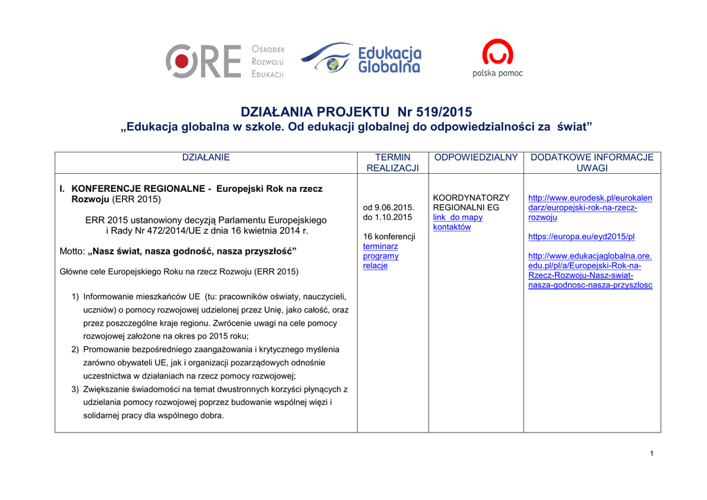 DZIAŁANIA PROJEKTU Nr 519/2015 „Edukacja globalna w szkole. Od edukacji globalnej do odpowiedzialności za świat” DZIAŁANIE TERMIN REALIZACJI I. KONFERENCJE REGIONALNE - Europejski Rok na rzecz Rozwoju (ERR 2015) ERR 2015 ustanowiony decyzją Parlamentu Europejskiego i Rady Nr 472/2014/UE z dnia 16 kwietnia 2014 r. Motto: „Nasz świat, nasza godność, nasza przyszłość” Główne cele Europejskiego Roku na rzecz Rozwoju (ERR 2015) od 9.06.2015. do 1.10.2015 16 konferencji terminarz programy relacje ODPOWIEDZIALNY DODATKOWE INFORMACJE UWAGI KOORDYNATORZY REGIONALNI EG link do mapy kontaktów http://www.eurodesk.pl/eurokalen darz/europejski-rok-na-rzeczrozwoju https://europa.eu/eyd2015/pl http://www.edukacjaglobalna.ore. edu.pl/pl/a/Europejski-Rok-naRzecz-Rozwoju-Nasz-swiatnasza-godnosc-nasza-przyszlosc 1) Informowanie mieszkańców UE (tu: pracowników oświaty, nauczycieli, uczniów) o pomocy rozwojowej udzielonej przez Unię, jako całość, oraz przez poszczególne kraje regionu. Zwrócenie uwagi na cele pomocy rozwojowej założone na okres po 2015 roku; 2) Promowanie bezpośredniego zaangażowania i krytycznego myślenia zarówno obywateli UE, jak i organizacji pozarządowych odnośnie uczestnictwa w działaniach na rzecz pomocy rozwojowej; 3) Zwiększanie świadomości na temat dwustronnych korzyści płynących z udzielania pomocy rozwojowej poprzez budowanie wspólnej więzi i solidarnej pracy dla wspólnego dobra. 1 W programie konferencji zostaną poruszone m.in. zagadnienia: Zwalczanie ubóstwa na świecie jako podstawa budowania bardziej stabilnego, pokojowo nastawionego, cieszącego się dobrobytem i sprawiedliwszego świata, odzwierciedlającego współzależność krajów bogatszych i biedniejszych (zgodnie z art. 21 Traktatu o Unii Europejskiej (TUE) i art. 208 Traktatu o funkcjonowaniu Unii Europejskiej) Konferencje będą sposobnością do : informowania, w jaki sposób Unia zwrócona na zewnątrz może przyczynić się do zapewnienia zrównoważenia w skali globalnej; podniesienia świadomości społeczeństwa oświatowego, nauczycieli, uczniów na temat obecnego kierunku unijnej polityki rozwoju; podniesienia świadomości na temat globalnych współzależności oraz unaoczniania tego, że rozwój nie sprowadza się tylko do pomocy; podniesienia świadomości na temat wszystkich form dyskryminacji ze względu na płeć dotykających kobiety i dziewczęta w różnych regionach, w szczególności w zakresie dostępu do kształcenia, miejsc pracy i systemów opieki zdrowotnej, a także o innych nadużyciach. Konferencje będzie jednocześnie okazją do: zaproszenia środowiska nauczycielskiego do udziału w projekcie (szkoleniach stacjonarnych i on-line), zachęceniem do udziału w konkursach dla szkół na temat polityki rozwoju i edukacji globalnej, ze szczególnym uwzględnieniem edukacji na rzecz zrównoważonego rozwoju 2 II. SZKOLENIA STACJONARNE – WARSZTATY DLA NAUCZYCIELI „Edukacja globalna w szkole / w zskolnych programach nauczania. Od edukacji globalnej do odpowiedzialności za świat.” 1. WARSZTATY 4 godziny dydaktyczne (2 sesje x 1,5 godz.) 2. WARSZTATY 6 godzin dydaktycznych (3 sesje x 1,5 godz.) Prowadzą: Trenerzy, trenerzy/ coachee edukacji globalnej warsztat 4-godz. dla min. 15 osób/ / grupa / w regionie (wprowadzenie do edukacji globanej) październik/ listopad 2015 UWAGA ! warsztat 6 godz. dla min. 25 osób/ grupa / w regionie wrzesień/ październik – listopad 2015 Trenerzy – Moderatorzy szkolenia on-line w ramach kursu blended learning na platformie EG wrzesień 2015 ADRESACI: 1. rady pedagogiczne / zespoły przedmiotowe - zapraszamy po 4-5 nauczycieli z jednej szkoły ! 2. kadra kierownicza szkół, konsultanci, doradcy metodyczni PDN 3. nauczyciele różnych przedmiotów / zajęć szkolnych zainteresowani tematyką globalną, poblematyką rozwoju. Informacje o liczbie warsztaatów, o programie, terminach bezpośrednio w regionach/ województwach W programie m.in.: obecność edukacji globalnej w podstawie programowej I-IV etapu edukacyjnego; czym jest edukacja globalna a czym nie jest; podstawowe obszary/ zagadnienia edukacji globalnej; problemy współczesnego świata, współzależności globalne; kodeks, zasady obowiązyjące w edukacji globalnej; metodologia w edukacji globalnej; jak włączyć się w dzaiałania w Tygodniu Edukacji Globalnej, przykłady dobrych praktyk, planowanie pracy szkoły/ nauczyciela; Nowy Poradnik metodyczny dla nauczycieli – jak z nim pracować. 3. WARSZTATY 6 godzin dydaktycznych w ramach szkolenia blended learning ( 3 sesje x 1,5 godz.) „Edukacja globalna w w szkolnych programach nauczania” ADRESACI: nauczyciele - uczestnicy szkolenia on-line na poziomie podstawowym (P1) inni zainteresowani nauczycieli w miarę dostępności miejsc Program dostosowany do potrzeb szkoleniowych grupy szkolenia on-line ! warsztat 6 godz. dla 25 osób/ grupa szkolenia on-line + inni nauczyciele po uzgodnieniu z Moderatorem/ Trenerem ( w miarę wolnych miejsc) Lista Moderratorów na stronie www.edukacjaglobalna .ore.edu.pl w zakładce KOORDYNATORZY 3 UWAGA ! Uczestnicy szkoleń/ warsztatów zainteresowani realizacją tematyki globalnej w uczniami II, III, IV etapu edukacyjnego otrzymają nową publikację „Edukacja globalna. Poradnik metodycznym dla nauczycieli II, III, IV etapu edukacyjnego” Koordynatorzy regionalni – Trenerzy Trenerzy – Moderatorzy wersja pilotażowa, nakład ok. 1700 egzemplarzy ( II połowa października) TYLKO dla uczestników projektu ! Poradnik jest pracą zbiorową 4 autorów: dr Katarzyny Jasikowskiej, Gabrieli Lipskiej-Badoti, Katarzyny Klarenbach, dr Roberta Łuczaka. III. 1. 2. SZKOLENIE BLENDED LEARNING Edukacja globalna w szkolnych programach nauczania (P1, podstawowy) Edukacja globalna a współczesny świat (P2, rozszerzony, dla absolwentów P1 w poprzednich latach) P1: 4- modułowe szkolenie (poziom podstawowy, 10 tygodni, 60 godzin) Moduł 1. Wprowadzenie do edukacj