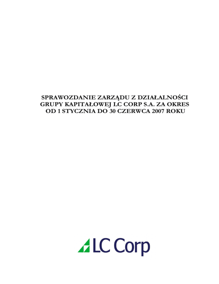 SPRAWOZDANIE ZARZĄDU Z DZIAŁALNOŚCI GRUPY KAPITAŁOWEJ LC CORP S.A. ZA OKRES OD 1 STYCZNIA DO 30 CZERWCA 2007 ROKU Sprawozdanie z działalności Grupy Kapitałowej LC CORP S.A. w okresie od 1.01.2007 r. 30.06.2007 r. Zgodnie z przepisami ustawy o rachunkowości z dnia 29 września 1994 roku Zarząd jest zobowiązany zapewnić sporządzenie rocznego sprawozdania z działalności grupy kapitałowej w okresie obrotowym, obejmującego istotne informacje o stanie majątkowym, sytuacji finansowej, ocenę uzyskiwanych efektów oraz wskazanie czynników ryzyka i opis zagroŜeń. Niniejsze sprawozdanie z działalności Grupy Kapitałowej LC Corp S.A. (dalej zwana „Grupą”) obejmuje okres od 1 stycznia do 30 czerwca 2007 roku. I. Podstawowe informacje o Grupie..................................................................................................... 2 II. Działalność prowadzona przez Grupę w I połowie 2007 r. - Zdarzenia istotnie wpływające na działalność Grupy jakie nastąpiły w okresie sprawozdawczym............................................... 4 III. Finansowanie działalności Grupy w okresie sprawozdawczym.................................................... 7 IV. Sytuacja majątkowa, finansowa i dochodowa .................................................................................. 8 V. Zdarzenia istotnie wpływające na działalność Grupy, jakie nastąpiły po okresie sprawozdawczym ................................................................................................................................. 8 VI. Czynniki ryzyka .................................................................................................................................. 11 Finansowanie działalności Grupy w okresie sprawozdawczym.......................................................... 12 VII. Kierunki rozwoju ............................................................................................................................... 16 VIII.WaŜniejsze osiągnięcia w dziedzinie badań i rozwoju .............................................................................................................................................................. 17 IX. Nabywanie udziałów (akcji) własnych przez spółki Grupy......................................................... 17 X. Posiadane oddziały ............................................................................................................................ 17 XI. Podsumowanie ................................................................................................................................... 17 XII. Oświadczenie Zarządu ...................................................................................................................... 17 1 Sprawozdanie z działalności Grupy Kapitałowej LC CORP S.A. w okresie od 1.01.2007 r. 30.06.2007 r. I. Podstawowe informacje o Grupie LC Corp S.A. (dalej równieŜ jako „LC Corp”) została utworzona dnia 3 marca 2006 r. i wpisana w dniu 15 marca 2006 r. do Krajowego Rejestru Sądowego prowadzonego przez Sąd Rejonowy dla Wrocławia – Fabrycznej we Wrocławiu, VI Wydział Gospodarczy Krajowego Rejestru Sądowego pod numerem KRS 0000253077. Spółka posiada numer REGON 020246398. W skład Grupy na dzień 30 czerwca 2007 r. wchodzą oprócz spółki LC Corp S.A. następujące spółki zaleŜne: • Arkady Wrocławskie S.A. z siedzibą we Wrocławiu, zarejestrowana w KRS 12 września 2002 r. jest spółką, która została zawiązana w celu realizacji i zarządzania projektem deweloperskim Arkady Wrocławskie. Udział LC Corp S.A. w jej kapitale zakładowym wynosi 100%. • Wrocław Nieruchomości sp. z o.o. z siedzibą we Wrocławiu, zarejestrowana w KRS 16 grudnia 2005 r. jest spółką, która została zawiązana w celu realizacji i zarządzania projektem deweloperskim Sky Tower. Udział LC Corp S.A. w jej kapitale zakładowym wynosi 99,997%. • Warszawa Nieruchomości sp. z o.o. z siedzibą we Wrocławiu, zarejestrowana w KRS 30 maja 2006 r. jest spółką, która została zawiązana w celu realizacji i zarządzania projektami deweloperskimi Grupy w Warszawie i okolicach. Udział LC Corp S.A. w jej kapitale zakładowym wynosi 99,933%. • Vratislavia Residence Sp. z o.o. z siedzibą we Wrocławiu, zarejestrowana w KRS 8 lutego 2007 r. jest spółką, która została zawiązana w celu realizacji i zarządzania projektem deweloperskim Vratislavia Residence. Udział LC Corp S.A. w jej kapitale zakładowym wynosi 100%. • Europlan Projekt Gocław sp. z o.o. z siedzibą w Warszawie zarejestrowana w KRS 8 sierpnia 2005 r. jest spółką, która została zawiązana w celu realizacji i zarządzania projektem deweloperskim Osiedle Przy Promenadzie Udział Emitenta w jej kapitale zakładowym wynosi 100 %. • Europlan Projekt II sp. z o.o. zarejestrowana w KRS 12 maja 2006 r. jest spółką, która została zawiązana w celu realizacji i zarządzania projektem deweloperskim Crown Apartments. Udział Emitenta w jej kapitale zakładowym wynosi 100 %. • Europlan Projekt III sp. z o.o. zarejestrowana w KRS 8 grudnia 2006 r. jest spółką, która została zawiązana w celu realizacji i zarządzania projektem deweloperskim Rezydencja Kaliska. Udział Emitenta w jej kapitale zakładowym wynosi 100 %. • Europlan Projekt IV sp. z o.o. zarejestrowana w KRS 8 marca 2007 r. jest spółką, która została zawiązana w celu realizacji i zarządzania projektem deweloperskim Osiedle Zielony Złocień Udział Emitenta w jej kapitale zakładowym wynosi 100 %. • Europlan Projekt Gocław Sp. z o.o. sp. k. zarejestrowana w KRS 11 października 2005 r. jest spółką, która została zawiązana w celu realizacji i zarządzania projektem deweloperskim Osiedle Przy Promenadzie. Europlan Projekt Gocław Sp. z o.o. sp. k. jest w 100% (bezpośrednio i pośrednio przez Europlan Projekt Gocław sp. z o.o.) kontrolowana przez Emitenta. • Łódź Residence sp. z 