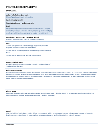 POMYSŁ DOBREJ PRAKTYKI FORMATKA autor/ szkoła / miejscowość Marek Ryba, Zespół Szkół w Krzywiniu tytuł dobrej praktyki: Starożytna Grecja - podsumowanie lead Lekcja historii poświęcona podsumowaniu materiału z dziejów starożytnej Grecji, a zwłaszcza kultury antycznej. Uczniowie będą mogli sprawdzić poziom opanowanej wiedzy i umiejętności. przedmiot/ poziom nauczania (ew. klasa) historia i społeczeństwo, klasa IV szkoły podstawowej cele - uczeń opisuje życie w Grecji używając pojęć teatr, filozofia, bogowie olimpijscy, olimpiada, igrzyska itd. - uczeń potrafi przyporządkować źródła ikonograficzne do danej epoki - uczeń potrafi wykorzystać techniki informacyjne pomoce dydaktyczne płyta CD dołączona do podręcznika „Historia i społeczeństwo 4” – zadania interaktywne krótki opis pomysłu Po wprowadzeniu przez nauczyciela do tematyki zajęć uczniowie rozpoczynają pracę z płytą CD. Każdy uczeń korzysta z własnego laptopa, ale zadania, które wykonują podzielone są na poszczególne kategorie (np. połącz w pary, zaznacz poprawną odpowiedź, odpowiedz czy to prawda czy fałsz, dokończ zdanie) i według tych kategorii przebiega praca na lekcji. Uczniowie głośno czytają swoje zadania i proponują odpowiedzi. efekty pracy Uczniowie przypomnieli sobie w innej niż zwykle postaci zagadnienia z dziejów Grecji. Ta forma pracy wyraźnie wzbudziła ich zainteresowanie. Nie było większych problemów z obsługą laptopów. uwagi W przyszłości być może lepsze efekty dałoby zastosowanie tablicy interaktywnej zamiast indywidualnej pracy przy laptopie, bowiem czasem zdarzało się, że poszczególne zadania otwierały się w różnej kolejności u różnych uczniów. Załączniki brak
