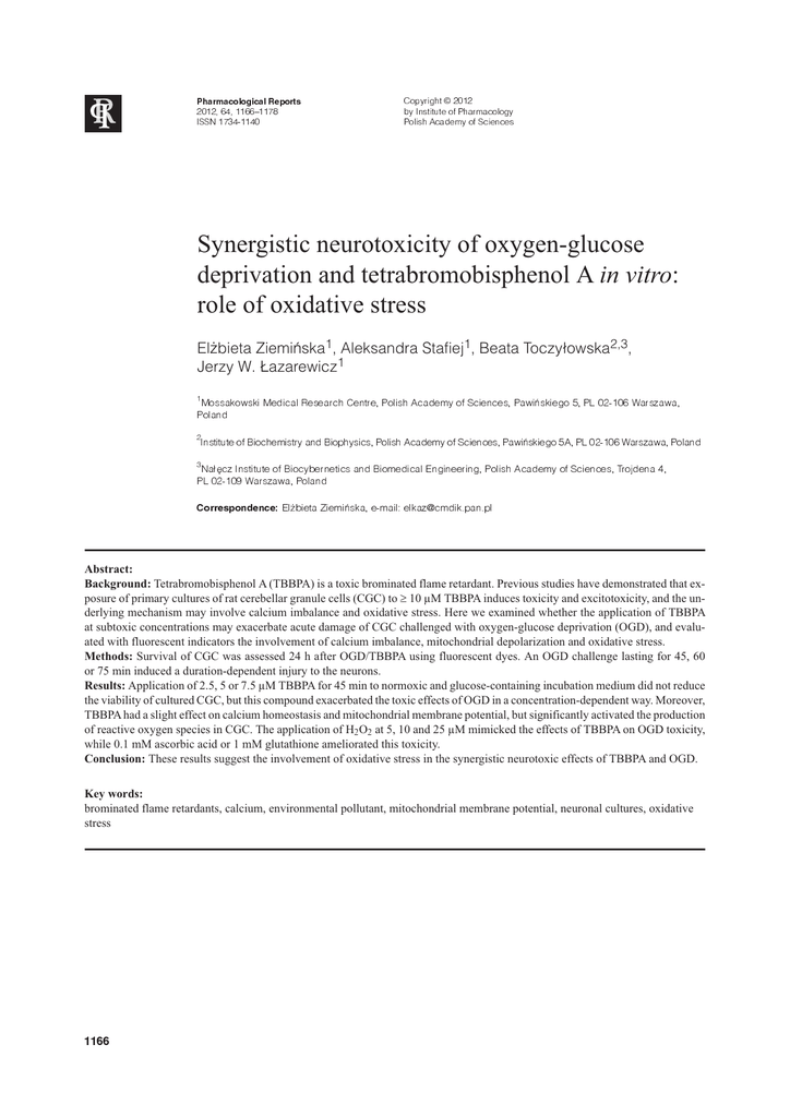 Pharmacological Reports Copyright © 2012 2012, 64, 11661178 by Institute of Pharmacology ISSN 1734-1140 Polish Academy of Sciences Synergistic neurotoxicity of oxygen-glucose deprivation and tetrabromobisphenol A in vitro: role of oxidative stress El¿bieta Ziemiñska1, Aleksandra Stafiej1, Beata Toczy³owska2,3, Jerzy W. £azarewicz1 1 Mossakowski Medical Research Centre, Polish Academy of Sciences, Pawiñskiego 5, PL 02-106 Warszawa, Poland 2 Institute of Biochemistry and Biophysics, Polish Academy of Sciences, Pawiñskiego 5A, PL 02-106 Warszawa, Poland 3 Na³êcz Institute of Biocybernetics and Biomedical Engineering, Polish Academy of Sciences, Trojdena 4, PL 02-109 Warszawa, Poland Correspondence: El¿bieta Ziemiñska, e-mail: [email protected] Abstract: Background: Tetrabromobisphenol A (TBBPA) is a toxic brominated flame retardant. Previous studies have demonstrated that exposure of primary cultures of rat cerebellar granule cells (CGC) to ³ 10 µM TBBPA induces toxicity and excitotoxicity, and the underlying mechanism may involve calcium imbalance and oxidative stress. Here we examined whether the application of TBBPA at subtoxic concentrations may exacerbate acute damage of CGC challenged with oxygen-glucose deprivation (OGD), and evaluated with fluorescent indicators the involvement of calcium imbalance, mitochondrial depolarization and oxidative stress. Methods: Survival of CGC was assessed 24 h after OGD/TBBPA using fluorescent dyes. An OGD challenge lasting for 45, 60 or 75 min induced a duration-dependent injury to the neurons. Results: Application of 2.5, 5 or 7.5 µM TBBPA for 45 min to normoxic and glucose-containing incubation medium did not reduce the viability of cultured CGC, but this compound exacerbated the toxic effects of OGD in a concentration-dependent way. Moreover, TBBPA had a slight effect on calcium homeostasis and mitochondrial membrane potential, but significantly activated the production of reactive oxygen species in CGC. The application of H2O2 at 5, 10 and 25 µM mimicked the effects of TBBPA on OGD toxicity, while 0.1 mM ascorbic acid or 1 mM glutathione ameliorated this toxicity. Conclusion: These results suggest the involvement of oxidative stress in the synergistic neurotoxic effects of TBBPA and OGD. Key words: brominated flame retardants, calcium, environmental pollutant, mitochondrial membrane potential, neuronal cultures, oxidative stress 1166 Pharmacological Reports, 2012, 64, 11661178
