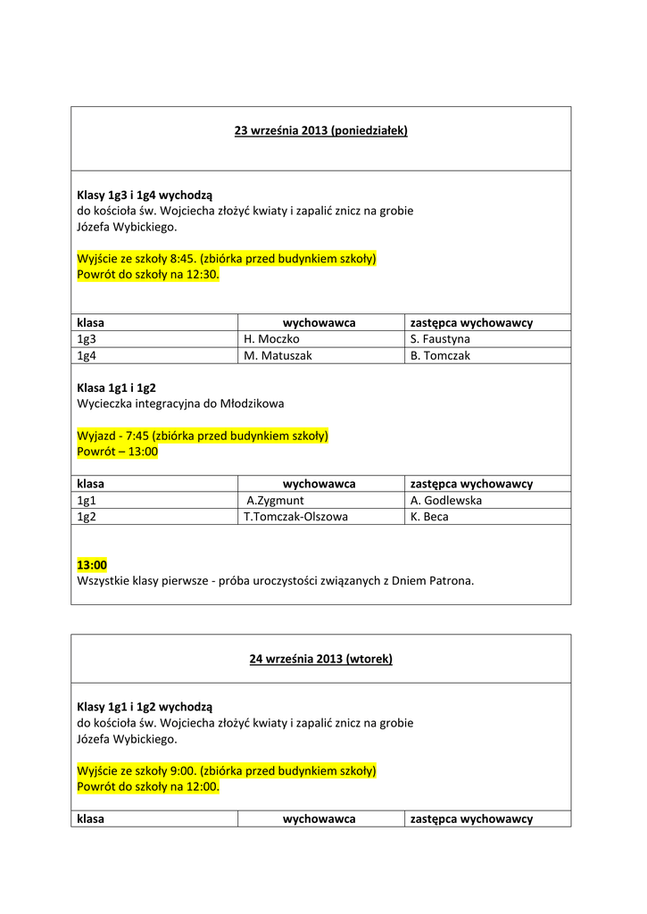 23 września 2013 (poniedziałek) Klasy 1g3 i 1g4 wychodzą do kościoła św. Wojciecha złożyć kwiaty i zapalić znicz na grobie Józefa Wybickiego. Wyjście ze szkoły 8:45. (zbiórka przed budynkiem szkoły) Powrót do szkoły na 12:30. klasa 1g3 1g4 wychowawca H. Moczko M. Matuszak zastępca wychowawcy S. Faustyna B. Tomczak Klasa 1g1 i 1g2 Wycieczka integracyjna do Młodzikowa Wyjazd - 7:45 (zbiórka przed budynkiem szkoły) Powrót – 13:00 klasa 1g1 1g2 wychowawca A.Zygmunt T.Tomczak-Olszowa zastępca wychowawcy A. Godlewska K. Beca 13:00 Wszystkie klasy pierwsze - próba uroczystości związanych z Dniem Patrona. 24 września 2013 (wtorek) Klasy 1g1 i 1g2 wychodzą do kościoła św. Wojciecha złożyć kwiaty i zapalić znicz na grobie Józefa Wybickiego. Wyjście ze szkoły 9:00. (zbiórka przed budynkiem szkoły) Powrót do szkoły na 12:00. klasa wychowawca zastępca wychowawcy 1g1 1g2 A.Zygmunt T.Tomczak-Olszowa A. Godlewska K. Beca Klasy 1g3 i 1g4 mają w tym dniu lekcje według planu. 25 września 2013 (środa) Klasa 1g3 i 1g4 Wycieczka integracyjna do Szreniawy. Wyjście – 7:45 (zbiórka przed budynkiem szkoły) Powrót – około 18:00 klasa 1g3 1g4 wychowawca H. Moczko M. Matuszak zastępca wychowawcy S. Faustyna B. Tomczak Klasy 1g1 i 1g2 mają w tym dniu lekcje według planu. 26 września 2013 (czwartek) Dzień Gimnazjalisty W Dniu Gimnazjalisty biorą udział wszystkie klasy pierwsze. 8:55 9:00 – 9:15 Zbiórka przed salą gimnastyczną. Uroczyste rozpoczęcie Dnia Gimnazjalisty połączone z prezentacją plakatów charakteryzujących poszczególne klasy. 9:15 – 10:15 Konkurs wiedzy o szkole i o patronie szkoły. 10:15 – 11:30 Konkurs sprawnościowy (konkurencje sportowe). 11:30 – 12:00 Uroczyste pasowanie na gimnazjalistę przez Dyrektora Szkoły. Po uroczystościach związanych z Dniem Gimnazjalisty (godz. 12:00) klasy pierwsze idą do biblioteki zagłosować na swojego kandydata do Samorządu Uczniowskiego według porządku: 1. 12:05 – klasa 1g1. 2. 12:15 – klasa 1g2. 3. 12:30 – klasa 1g3. 4. 12:45 – klasa 1g4. Po głosowaniu uczniowie idą do domu. Uczniowie w tym dniu nie zabierają do szkoły podręczników. 27września 2013 (piątek) Dzień Patrona Szkoły W Dniu Patrona Szkoły biorą udział wszyscy uczniowie Gimnazjum 56. 9:00 – 10:00 Uroczystości związane z Dniem Patrona Szkoły (sala gimnastyczna). Udział biorą klasy 2g1, 3g1, 3g2, 3g3, 3g4, 3g5, 3g6. 11:00 – 12:00 Uroczystości związane z Dniem Patrona Szkoły (sala gimnastyczna). Udział biorą klasy 2g2, 2g3, 2g4,1g1, 1g2, 1g3, 1g4 Po uroczystościach na sali gimnastycznej – uroczyste otwarcie nowego boiska szkolnego oraz IV e-klasy.
