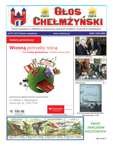 Europoseł w bibliotece str. 6 Promocja wierszyków dla dzieci Dariusza Łubkowskiego. str. 7 Promocja nowej książki 30.04.2013 r. Biblioteka godz. 17.00. ŚWIAT ZNACZKÓW POCZTOWYCH dok. na str. 7 GŁOS CHEŁMŻYŃSKI, STRONA 2 III GALA TAŃCA W dniu 17 marca br. już po raz trzeci odbyła się w Chełmży Gala Tańca oraz Turniej Tańca „Pierwszy Krok” o puchar Burmistrza Chełmży. Rywalizacja młodych stażem tancerzy, którzy stawiają swoje pierwsze taneczne kroki w klasach rekreacyjnych była główną częścią Gali, liczną grupę stanowili uczniowie Szkoły Podstawowej nr 2 m.in. klasy IV a: Anna Belska, Marek Krywalski, Fryderyk Sawiński, Olga Stanula i Agata Szwaja. Wszyscy byli świetni i mimo że konkurencja była duża Agata, Fryderyk i Olga zdobyli Puchary i złote medale Turnieju. Oprócz tego zaprezentowano kilka profesjonalnych pokazów tanecznych. W tej części wystąpili znani z Tańca z Gwiazdami - RAFAŁ MASERAK i MAGDALENA SOSZYŃSKA-MICHNO oraz zdobywcy II miejsca ostatniej edycji „Mam Talent” - PITZO & POLSSKY. KO-PIERNIK w Chełmży Przejechał przez Chełmżę KO-PIERNIK, pociąg ciągnięty przez zabytkowy parowóz Ol49. Atrakcja ta skierowana była przede wszystkim dla mieszkańców województwa kujawsko - pomorskiego, relacja pociągu zakłada bowiem przejazd pomiędzy dwoma stolicami tego województwa, tj. Bydgoszczą i Toruniem. Pociąg turystyczny KO-PIERNIK wyruszył z Torunia Miasto i pokonał trasę przez Toruń Wschodni, Chełmżę, Unisław, Bydgoszcz Wschód do Bydgoszczy Głównej oraz trasę powrotną przez Solec Kujawski, Toruń Główny i Toruń Miasto do Torunia Wschodniego. Skład pociągu KO-PIERNIK zaplanowano w sposób umożliwiający wygodne podróżowanie kilkuset pasażerom, dodatkowo w składzie pociągu znajdował się wagon restauracyjny. Pasażerowie w ramach przejazdu pociągiem KO-PIERNIK mogli skorzystać z dodatkowych atrakcji przygotowanych przez naszych samorządowych partnerów na kilku stacjach położonych GŁOS CHEŁMŻYŃSKI, STRONA 3 Wyróżnienie dla burmistrza Na zdjęciu od lewej: Stanisław Wonatowski ze straży rybackiej, burmistrz Jerzy Czerwiński oraz prezes koła PZW w Chełmży Wiesław Budziak. Burmistrz miasta Jerzy Czerwiński otrzymał wyróżnienie za wspierania Polskiego Związku Wędkarskiego na terenie Chełmży. Zaangażowanie burmistrza w tej dziedzinie dostrzegły władze okręgowe w Toruniu. Mirosław Purzycki prezes zarządu okręgu toruńskiego podjął decyzję o uhonorowaniu Jerzego Czerwińskiego wyróżnieniem „Za wkład w rozwój wędkarstwa”. Burmistrz Jerzy Czerwiński choć sam nie wędkuje często wspiera inicjatywy lokalnych wędkarzy. Co roku organizowane są zawody wędkarskie o puchar burmistrza miasta. Również rywalizacja wśród najmłodszych cieszy się niesłabnącym powodzeniem. - Wędkarstwo w naszym mieście stale się rozwija i to również dzięki współpracy koła miejskiego z urzędem miasta - mówi Wiesław Budziak prezes PZW w Chełmży. Chełmżyńskie jezioro przyciąga nie tylko miejscowych wędkarzy, ale również przyjezdnych moczykijów. Ostatnie przeprowadzone badania przez Zakład Rybactwa Śródlądowego dowiodły, że stan rybny jeziora nie jest taki zły. Wymaga jedynie mądrej gospodarki zarybieniowej i rybackiej. Marcin Seroczyński Burmistrz nagrodził Grom Burmistrz Jerzy Czerwiński wyróżnił organizatorów I Gali Bokserskiej, która okazała się prawdziwym hitem. Nie milkną echa ostatniej gali pięściarskiej jaka odbyła się w Chełmży w hali Ośrodka Sportu i Turystyki. Dzięki zaangażowaniu Klubu Sportowego Grom boks powrócił do Chełmży po wielu latach z wielką pompą. I Gala Bokserska im. Alfreda Palińskiego przeszła najśmielsze oczekiwania. Dopisali zawodnicy i kibice, natomiast gościem honorowym był Paweł Skrzecz medalista olimpijski. Za dobrą zabawę i organizację gali odpowiedzialni byli Maciej Demel i Dariusz Słowiński i to właśnie oni odebrali z rąk burmistrza wyróżnienie. Jerzy Czerwiński burmistrz Chełmży podkreślił, że impreza stała na wyskokiem poziomie, zarówno organizacyjnym i sportowym. Gala boksu przyciągnęła ponad 600 kibiców oraz media. PORADY PRAWNE Z inicjatywy Burmistrza Jerzego Czerwińskiego, od dnia 12 września 2012r. mieszkańcy miasta Chełmży mają możliwość korzystania w okresie promocji z bezpłatnych porad prawnych. Kancelaria Krislex w Toruniu przyjmuje interesantów w każdą środę w godz. 10.00 - 14.00 w Galerii pod Ratuszem przy ul. Dariusz Słowiński i Maciej Demel odbierają od burmistrza Jerzego Czerwińskiego wyróżnienie za wzorowo zorganizowaną galę pięściarską. Hallera 2. Niniejsza akcja promocyjna ma na celu wyjście naprzeciw potrzebom mieszkańców w zakresie szeroko pojętej pomocy prawnej jak również stworzenia pewnego „zwyczaju” korzystania z fachowej wiedzy w sprawach życia codziennego. Z doświadczenia Kancelarii wynika, iż takie spotkania pozwalają klientom uniknąć szeregu problemów, które w przypadku pozostawienia sprawy własnemu biegowi rodzą dla nas bardzo niekorzystne skutki prawne. Osoby zainteresowane, w celu najszybszego rozwiązania problemu prawnego, proszone są o zabranie na spotkanie z prawnikiem dokumentów związanych ze sprawą. GŁOS CHEŁMŻYŃSKI, STRONA 4 WIADOMOŚCI Z RATUSZA PRZETARG NA BUDOWĘ DEPTAKA POŁUDNIOWEGO ROZSTRZYGNIĘTY Już wkrótce rozpocznie się realizacja kolejnej inwestycji związanej z zagospodarowaniem terenów wokół Jeziora Chełmżyńskiego. Gmina miasto Chełmża rozstrzygnęła postępowanie o udzielenie zamówienia publicznego prowadzone w trybie przetargu nieograniczonego, zgodnie z ustawą z dnia 29 stycznia 2004 r. Prawo zamówień publicznych, na wykonanie robót budowlanych obejmujących budowę Deptaka Południowego łączącego Bulwar 1000-lecia z ciągiem pieszo-rowerowym biegnącym po drugiej stronie Jeziora Chełmżyńskiego oraz slipu do wodowania niewielkich 