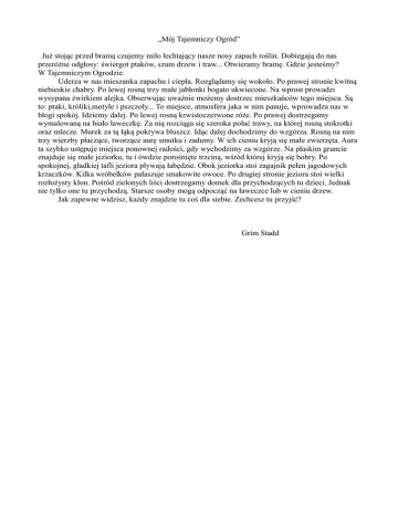 „Mój Tajemniczy Ogród” Już stojąc przed bramą czujemy miło łechtający nasze nosy zapach roślin. Dobiegają do nas przeróżne odgłosy: świergot ptaków, szum drzew i traw... Otwieramy bramę. Gdzie jesteśmy? W Tajemniczym Ogrodzie. Uderza w nas mieszanka zapachu i ciepła. Rozglądamy się wokoło. Po prawej stronie kwitną niebieskie chabry. Po lewej rosną trzy małe jabłonki bogato ukwiecone. Na wprost prowadzi wysypana żwirkiem alejka. Obserwując uważnie możemy dostrzec mieszkańców tego miejsca. Są to: ptaki, króliki,motyle i pszczoły... To miejsce, atmosfera jaka w nim panuje, wprowadza nas w błogi spokój. Idziemy dalej. Po lewej rosną krwistoczerwone róże. Po prawej dostrzegamy wymalowaną na biało ławeczkę. Za nią rozciąga się szeroka połać trawy, na której rosną stokrotki oraz mlecze. Murek za tą łąką pokrywa bluszcz. Idąc dalej dochodzimy do wzgórza. Rosną na nim trzy wierzby płaczące, tworzące aurę smutku i zadumy. W ich cieniu kryją się małe zwierzęta. Aura ta szybko ustępuje miejsca ponownej radości, gdy wychodzimy za wzgórze. Na płaskim gruncie znajduje się małe jeziorku, tu i ówdzie porośnięte trzciną, wśród której kryją się bobry. Po spokojnej, gładkiej tafli jeziora pływają łabędzie. Obok jeziorka stoi zagajnik pełen jagodowych krzaczków. Kilka wróbelków pałaszuje smakowite owoce. Po drugiej stronie jeziora stoi wielki rozłożysty klon. Pośród zielonych liści dostrzegamy domek dla przychodzących tu dzieci. Jednak nie tylko one tu przychodzą. Starsze osoby mogą odpocząć na ławeczce lub w cieniu drzew. Jak zapewne widzisz, każdy znajdzie tu coś dla siebie. Zechcesz tu przyjść? Grim Stadd