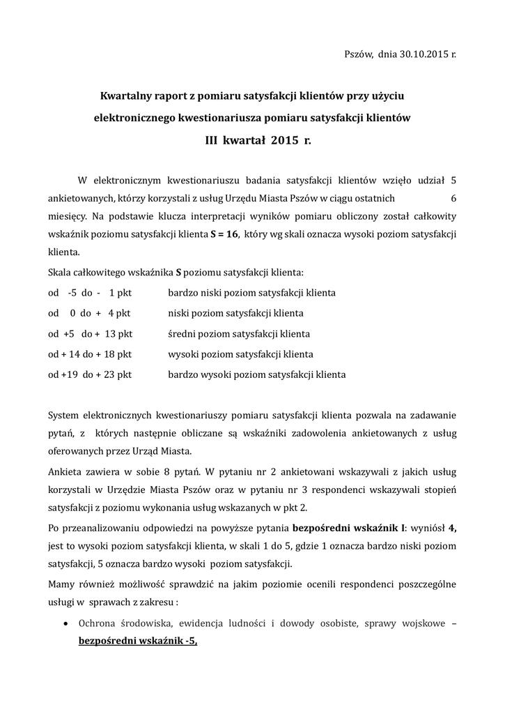 Pszów, dnia 30.10.2015 r. Kwartalny raport z pomiaru satysfakcji klientów przy użyciu elektronicznego kwestionariusza pomiaru satysfakcji klientów III kwartał 2015 r. W elektronicznym kwestionariuszu badania satysfakcji klientów wzięło udział 5 ankietowanych, którzy korzystali z usług Urzędu Miasta Pszów w ciągu ostatnich 6 miesięcy. Na podstawie klucza interpretacji wyników pomiaru obliczony został całkowity wskaźnik poziomu satysfakcji klienta S = 16, który wg skali oznacza wysoki poziom satysfakcji klienta. Skala całkowitego wskaźnika S poziomu satysfakcji klienta: od -5 do - 1 pkt bardzo niski poziom satysfakcji klienta od niski poziom satysfakcji klienta 0 do + 4 pkt od +5 do + 13 pkt średni poziom satysfakcji klienta od + 14 do + 18 pkt wysoki poziom satysfakcji klienta od +19 do + 23 pkt bardzo wysoki poziom satysfakcji klienta System elektronicznych kwestionariuszy pomiaru satysfakcji klienta pozwala na zadawanie pytań, z których następnie obliczane są wskaźniki zadowolenia ankietowanych z usług oferowanych przez Urząd Miasta. Ankieta zawiera w sobie 8 pytań. W pytaniu nr 2 ankietowani wskazywali z jakich usług korzystali w Urzędzie Miasta Pszów oraz w pytaniu nr 3 respondenci wskazywali stopień satysfakcji z poziomu wykonania usług wskazanych w pkt 2. Po przeanalizowaniu odpowiedzi na powyższe pytania bezpośredni wskaźnik I: wyniósł 4, jest to wysoki poziom satysfakcji klienta, w skali 1 do 5, gdzie 1 oznacza bardzo niski poziom satysfakcji, 5 oznacza bardzo wysoki poziom satysfakcji. Mamy również możliwość sprawdzić na jakim poziomie ocenili respondenci poszczególne usługi w sprawach z zakresu : Ochrona środowiska, ewidencja ludności i dowody osobiste, sprawy wojskowe – bezpośredni wskaźnik -5, Udostępnianie informacji publicznej, świadczenia rodzinne, pomoc osobom uprawnionym do alimentów, podatki i opłaty lokalne - bezpośredni wskaźnik – 4. Należy zwrócić uwagę na odpowiedzi w pytaniu nr 4, gdzie ankietowani mieli możliwość ocenić oczekiwanie związane z wykonaniem usługi i stopień w jakim zostały one zaspokojone, korzystając z 7 parametrów wymienionych w tym pytaniu. Parametry takie jak: czas oczekiwania na usługę (bezpośredni wskaźnik – 4), czas realizacji usługi (bezpośredni wskaźnik – 5), kompetencje pracownika urzędu (bezpośredni wskaźnik – 4), przyjazne traktowanie przez pracownika urzędu (bezpośredni wskaźnik – 4), wzbudzanie zaufania przez pracownika urzędu (bezpośredni wskaźnik – 5), dostępność informacji w urzędzie (bezpośredni wskaźnik – 5), indywidualne traktowanie petenta (bezpośredni wskaźnik – 5). Bezpośredni wskaźnik został ustalony na poziomie 5 pkt. co oznacza bardzo wysoki poziom satysfakcji klienta. Wnioski : Respondenci bardzo pozytywnie ocenili kompetencje pracowników Urzędu Miasta Pszów. Wartość wskaźnika oznacza, iż oczekiwania klientów zostały spełnione. Kompetencje pracowników zostały określone na bardzo wysokim poziomie jako pracownicy uczciwi, fachowi, zaangażowani, przyjazdni oraz pracowici z którymi klienci mieli bezpośredni kontakt przy załatwianiu sprawy. Klienci dostrzegają zmiany na lepsze, wśród ankietowanych znalazły się głosy doceniające starania pracowników urzędu, które mobilizują do dalszej jeszcze lepszej pracy. Wnioski wskazują, iż usługi i potrzeby klientów są zaspakajane. Pracownicy ciągle podnoszą swoje kompetencje w celu świadczenia usług na odpowiednim poziomie poprzez szkolenia i podnoszenie swoich kwalifikacji. Aby jednak zwiększyć ilość respondentów należałoby przeprowadzić: 1. akcję informacyjną poprzez zamieszczenie informacji w Biuletynie Informacyjnym Miasta Pszów o ankietach pomiaru satysfakcji klientów, 2. na naradach kierownictwa omówić raport satysfakcji klientów wskazując na właściwe postępowanie pracowników w kontaktach z klientami, zachęcając do udziału w badaniu, 3. wskazane spotkanie z kierownikami referatów mających kontakt bezpośredni z klientami (referat Świadczeń społecznych, referat Organizacyjny i Informatyki, referat Gospodarki Komunalnej i Ekologi, referat podatkowy Sporządził Hanna Zdrzałek Akceptuję Zatwierdził