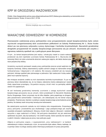 KPP W GRODZISKU MAZOWIECKIM Źródło: http://kppgrodzisk.policja.waw.pl/pgm/aktualnosci/5472,Wakacyjne-odwiedziny-w-komendzie.html Wygenerowano: Środa, 8 marca 2017, 07:04 Strona znajduje się w archiwum. WAKACYJNE ODWIEDZINY W KOMENDZIE Poznawanie codziennej pracy policjantów oraz przypomnienie zasad bezpieczeństwa było celem wycieczki zorganizowanej dziś uczestnikom półkolonii ze Szkoły Podstawowej Nr 1. Duża liczba dzieci po raz pierwszy usłyszała o pracy dyżurnego i technika kryminalistyki. Naczelnik grodziskiej drogówki przypomniał im zasady bezpiecznego poruszania się po ulicach. Uczniowie jak zwykle z ogromną radością spotkali się z policyjnym psem Borysem. O tym , że temat bezpieczeństwa jest ważny i atrakcyjny nawet w czasie wakacji przekonali się dziś najmłodsi uczniowie Szkoły Podstawowej Nr 1. Wycieczka do komendy Policji nie tylko urozmaiciła dzieciom wakacyjne zajęcia, ale także dostarczyła dużo pożytecznej wiedzy. Uczestnicy wycieczki poznawali zasady pracy policjantów jeszcze przed wejściem do budynku komendy. Dobrzy obserwatorzy szybko zwrócili uwagę na różnorodne stroje funkcjonariuszy i dopytywali o ich zadania. Nie wszyscy wiedzieli jak się nazywa policjant, którego spotkali jako pierwszego w jednostce. Byli zaskoczeni liczbą zadań, jakie musi wykonać dyżurny. Nie mniejsze wrażenie zrobiło na nich stanowisko technika kryminalistyki. Tu po raz pierwszy dzieci dowiedziały się, że na miejscu zdarzenia można zabezpieczyć nawet ślady zapachowe przestępcy. Oczywiście wszyscy chcieli mieć na pamiątkę odbitki swoich linii papilarnych. W sali herbowej grodziskiej komendy uczniowie z uwagą wysłuchali zasad bezpiecznego poruszania się po ulicach, które przedstawił im Naczelnik Wydziału Ruchu Drogowego. Dzieci przyznały się do kilku błędów, jakie popełniają na drogach jako pasażerowie samochodów i rowerzyści, ale zobowiązały się nie łamać więcej przepisów. Przećwiczyły również w praktyce zasady bezpiecznego przechodzenia przez jezdnię. Do dalszej nauki otrzymały tematyczne kolorowanki. Na zakończenie wycieczki czekała na nich kolejna miła niespodzianka. Prezentacja pracy policjanta- przewodnika psa służbowego i jego podopiecznego jak zwykle wywołała entuzjazm najmłodszych. Wszyscy chcieli mieć zdjęcie z Borysem i wiedzieć wszystko o jego zadaniach w Policji. Od policjanta dowiedzieli się jak właściwie opiekować się psem, aby był posłuszny i nie zrobił krzywdy. Dzieci poznały też warunki, w jakich mieszka i odpoczywa po pracy nasz policyjny pupil. Zdjęcia w policyjnej czapce, z wyposażeniem, przy radiowozach i w każdym odwiedzanym miejscu świadczyły o tym, że wycieczka była udana. Mamy nadzieję, że w pamięci dzieci na długo zostaną także informacje przekazane im przez policjantów. kz Ocena: 0/5 (0) Tweetnij