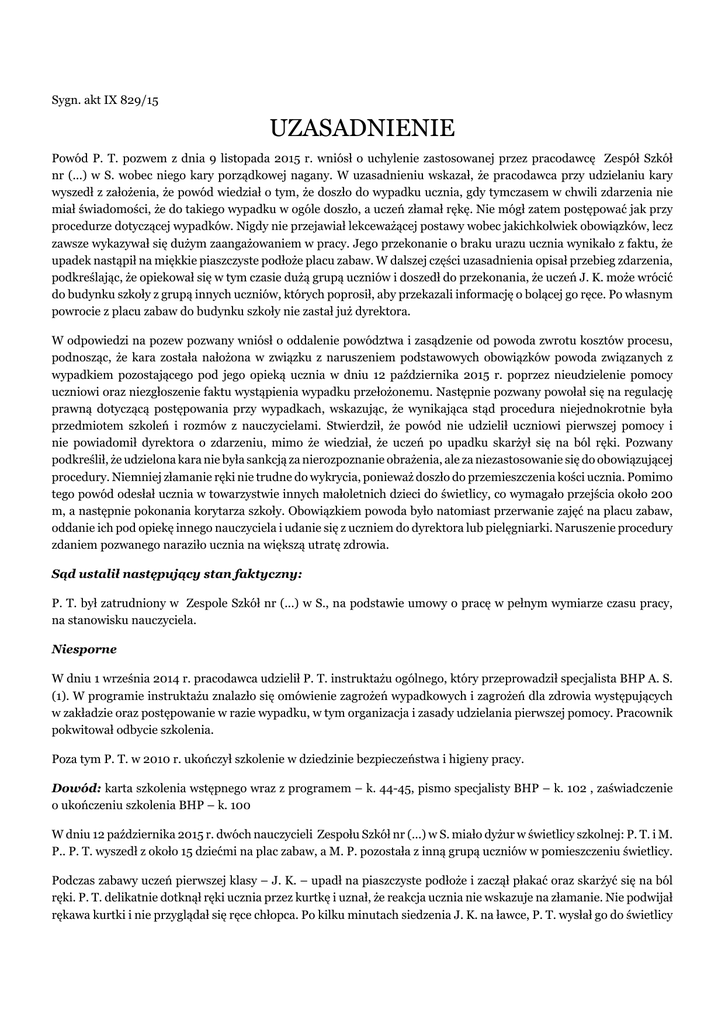 Sygn. akt IX 829/15 UZASADNIENIE Powód P. T. pozwem z dnia 9 listopada 2015 r. wniósł o uchylenie zastosowanej przez pracodawcę Zespół Szkół nr (...) w S. wobec niego kary porządkowej nagany. W uzasadnieniu wskazał, że pracodawca przy udzielaniu kary wyszedł z założenia, że powód wiedział o tym, że doszło do wypadku ucznia, gdy tymczasem w chwili zdarzenia nie miał świadomości, że do takiego wypadku w ogóle doszło, a uczeń złamał rękę. Nie mógł zatem postępować jak przy procedurze dotyczącej wypadków. Nigdy nie przejawiał lekceważącej postawy wobec jakichkolwiek obowiązków, lecz zawsze wykazywał się dużym zaangażowaniem w pracy. Jego przekonanie o braku urazu ucznia wynikało z faktu, że upadek nastąpił na miękkie piaszczyste podłoże placu zabaw. W dalszej części uzasadnienia opisał przebieg zdarzenia, podkreślając, że opiekował się w tym czasie dużą grupą uczniów i doszedł do przekonania, że uczeń J. K. może wrócić do budynku szkoły z grupą innych uczniów, których poprosił, aby przekazali informację o bolącej go ręce. Po własnym powrocie z placu zabaw do budynku szkoły nie zastał już dyrektora. W odpowiedzi na pozew pozwany wniósł o oddalenie powództwa i zasądzenie od powoda zwrotu kosztów procesu, podnosząc, że kara została nałożona w związku z naruszeniem podstawowych obowiązków powoda związanych z wypadkiem pozostającego pod jego opieką ucznia w dniu 12 października 2015 r. poprzez nieudzielenie pomocy uczniowi oraz niezgłoszenie faktu wystąpienia wypadku przełożonemu. Następnie pozwany powołał się na regulację prawną dotyczącą postępowania przy wypadkach, wskazując, że wynikająca stąd procedura niejednokrotnie była przedmiotem szkoleń i rozmów z nauczycielami. Stwierdził, że powód nie udzielił uczniowi pierwszej pomocy i nie powiadomił dyrektora o zdarzeniu, mimo że wiedział, że uczeń po upadku skarżył się na ból ręki. Pozwany podkreślił, że udzielona kara nie była sankcją za nierozpoznanie obrażenia, ale za niezastosowanie się do obowiązującej procedury. Niemniej złamanie ręki nie trudne do wykrycia, ponieważ doszło do przemieszczenia kości ucznia. Pomimo tego powód odesłał ucznia w towarzystwie innych małoletnich dzieci do świetlicy, co wymagało przejścia około 200 m, a następnie pokonania korytarza szkoły. Obowiązkiem powoda było natomiast przerwanie zajęć na placu zabaw, oddanie ich pod opiekę innego nauczyciela i udanie się z uczniem do dyrektora lub pielęgniarki. Naruszenie procedury zdaniem pozwanego naraziło ucznia na większą utratę zdrowia. Sąd ustalił następujący stan faktyczny: P. T. był zatrudniony w Zespole Szkół nr (...) w S., na podstawie umowy o pracę w pełnym wymiarze czasu pracy, na stanowisku nauczyciela. Niesporne W dniu 1 września 2014 r. pracodawca udzielił P. T. instruktażu ogólnego, który przeprowadził specjalista BHP A. S. (1). W programie instruktażu znalazło się omówienie zagrożeń wypadkowych i zagrożeń dla zdrowia występujących w zakładzie oraz postępowanie w razie wypadku, w tym organizacja i zasady udzielania pierwszej pomocy. Pracownik pokwitował odbycie szkolenia. Poza tym P. T. w 2010 r. ukończył szkolenie w dziedzinie bezpieczeństwa i higieny pracy. Dowód: karta szkolenia wstępnego wraz z programem – k. 44-45, pismo specjalisty BHP – k. 102 , zaświadczenie o ukończeniu szkolenia BHP – k. 100 W dniu 12 października 2015 r. dwóch nauczycieli Zespołu Szkół nr (...) w S. miało dyżur w świetlicy szkolnej: P. T. i M. P.. P. T. wyszedł z około 15 dziećmi na plac zabaw, a M. P. pozostała z inną grupą uczniów w pomieszczeniu świetlicy. Podczas zabawy uczeń pierwszej klasy – J. K. – upadł na piaszczyste podłoże i zaczął płakać oraz skarżyć się na ból ręki. P. T. delikatnie dotknął ręki ucznia przez kurtkę i uznał, że reakcja ucznia nie wskazuje na złamanie. Nie podwijał rękawa kurtki i nie przyglądał się ręce chłopca. Po kilku minutach siedzenia J. K. na ławce, P. T. wysłał go do świetlicy wraz z innym uczniem – A. S. (2) z drugiej klasy mówiąc im, by powiedzieli w świetlicy o upadku i by zadzwoniono do rodzica. Dowód: przesłuchanie powoda – k. 70-71 Obaj uczniowie dotarli do świetlicy (około 200 m) i powiedzieli obecnej tam M. P., że J. boli ręka. Nauczycielka poprosiła obu uczniów, by poszli do sekretariatu. Nie wiedziała wtedy, że doszło do jakiegoś wypadku i że chłopcu mogło stać się coś poważnego. Dowód: zeznania świadka M. P. – k. 67-68 Po pewnym czasie J. K. przyszedł do sekretariatu szkoły – smutny, zapłakany i ze spuszczoną głową. Obecna tam jego wychowawczyni I. S. spytała o to, co się stało. Odpowiedział, że upadł i boli go ręka. I. S. wraz z sekretarką podwinęły rękaw kurtki i od razu zauważyły, że kość przedramienia jest przesunięta względem kości dłoni. Kobiety usztywniły rękę dziecka i zadzwoniły do jego matki, która poinformowała, że jest już w drodze do szkoły i poprosiła, by nie wzywać pogotowia, ponieważ sama zawiezie syna do placówki służby zdrowia. Dowód: zeznania świadka I. S. – k. 69, przesłuchanie W. Ż. za stronę pozwaną – k. 71-72 Do końca dnia 12 października 2015 r., ani następnego dnia rano P. T. nie złożył w sekretariacie żadnej informacji o zaistniałym zdarzeniu. Będąc jeszcze na placu zabaw otrzymał od uczennicy informację o tym, że J. K. był opatrywany w sekretariacie. Dowód: - zeznania świadka I. S. – k. 69, przesłuchanie W. Ż. za stronę pozwaną – k. 71-72, przesłuchanie powoda – k. 70-71 Następnego dnia po zakończeniu pierwszej lekcji dyrektor Zespołu Szkół nr (...) poprosił P. T. na rozmowę celem wyjaśnienia wysłania dziecka do świetlicy oraz braku informacji na temat wypadku. Powód wyjaśnił, że dotykał ręki chłopca przez kurtkę i nie wiedział 