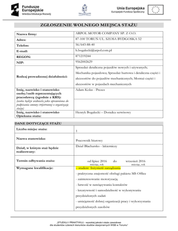 ZGŁOSZENIE WOLNEGO MIEJSCA STAŻU Nazwa firmy: ARPOL MOTOR COMPANY SP. Z O.O. Adres: 87-100 TORUŃ UL. SZOSA BYDGOSKA 52 Telefon: 56/643-88-40 E-mail: [email protected] REGON: 871219244 NIP: 9562002629 Sprzedaż detaliczna pojazdów nowych i używanych; Mechanika pojazdowa; Sprzedaż hurtowa i detaliczna części i Rodzaj prowadzonej działalności: akcesoriów do pojazdów mechanicznych; Montaż części i akcesoriów w pojazdach mechanicznych Imię, nazwisko i stanowisko osoby/osób reprezentujących pracodawcę (zgodnie z KRS): (osoba będzie widniała jako uprawniona do podpisania umowy trójstronnej o organizację stażu) Imię, nazwisko i stanowisko Opiekuna stażu: Adam Kolas - Prezes Henryk Bogalecki – Doradca serwisowy DANE DOTYCZĄCE STAŻU Liczba miejsc stażu: 1 Nazwa stanowiska: Pracownik biurowy Dział, w którym staż będzie realizowany: Termin odbywania stażu: Dział Blacharsko - lakierniczy od lipiec 2016 miesiąc, rok Wymagane kwalifikacje: do wrzesień 2016 miesiąc, rok – student Inżynierii zarządzania - praktyczna znajomość obsługi pakietu MS Office - zainteresowanie motoryzacją - łatwość w nawiązywaniu kontaktów - kreatywność i samodzielność w wykonywaniu przydzielonych zadań - umiejętność dobrej organizacji pracy i wykorzystania przydzielonych zasobów „STUDIUJ I PRAKTYKUJ - wysokiej jakości staże zawodowe dla studentów czterech kierunków studiów stacjonarnych WSB w Toruniu” Oświadczam, że: - zakład nie jest w stanie upadłości, likwidacji; - organizacja stażu dla skierowanego studenta nie będzie przyczyną zwolnień pracowników zatrudnionych w przedsiębiorstwie. SZCZEGÓŁOWY PROGRAM STAŻU Zakres obowiązków Stażysty 1. Zapoznanie się z organizacją działów oraz infrastrukturą logistyczną organizacji. 2. Czynny udział w procesach pozwalających na poznanie zasad funkcjonowania infrastruktury logistycznej organizacji. 3. Zapoznanie się z systemami logistycznymi oraz organizacją podsystemów logistycznych w organizacji 4. Poznanie systemów informatycznych i programów przeznaczonych do przepływu informacji w ramach systemu logistycznego organizacji. 5. Zapoznanie się ze stosowanymi w organizacji urządzeniami i przepisami wykorzystywanymi w procesach logistycznych. Wymiar godzinowy Liczba godzin dziennie: 8 Godziny pracy: od 8.00 do 16.00 Praca przy monitorze ekranowym co najmniej połowę dobowego wymiaru czasu pracy TAK □ NIE Cele edukacyjne Po zakończeniu stażu student powinien: - posługiwać się terminologią fachową, - umieć wskazać powiązania zarządzania z działalnością gospodarczą, - posiadać umiejętności stosowania wiedzy teoretycznej zdobytej w trakcie studiów w praktyce, - samodzielnie i zespołowo wykonywać obowiązki zawodowe, - nabyć umiejętności rozwiązywania problemów praktycznych, - umieć wykorzystać wiedzę i umiejętności zdobytej w trakcie stażu. „STUDIUJ I PRAKTYKUJ - wysokiej jakości staże zawodowe dla studentów czterech kierunków studiów stacjonarnych WSB w Toruniu” □