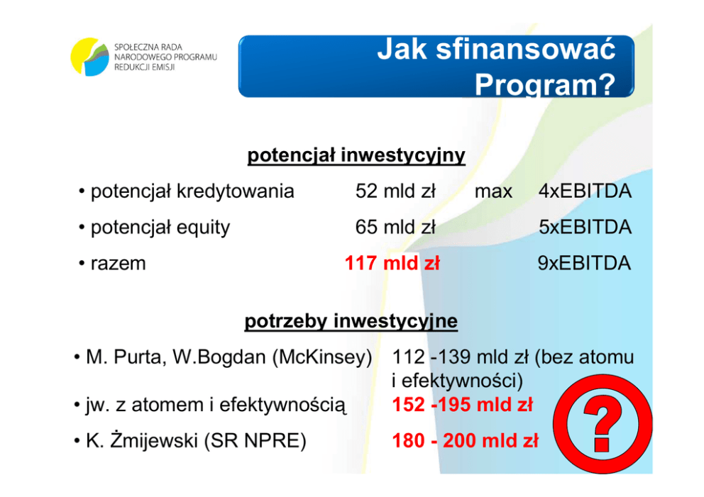 Jak sfinansować Program? potencjał inwestycyjny • potencjał kredytowania 52 mld zł • potencjał equity 65 mld zł 5xEBITDA 117 mld zł 9xEBITDA • razem max 4xEBITDA potrzeby inwestycyjne • M. Purta, W.Bogdan (McKinsey) 112 -139 mld zł (bez atomu i efektywności) 152 -195 mld zł • jw. z atomem i efektywnością • K. śmijewski (SR NPRE) 180 - 200 mld zł Analiza inwestycji Poziom 2020 mld zł mld € Inwestycje 200 50 Corporate finance 52 13 Project finance 148 37 250 35 0 120 200 Stopa inwestycji 2009 Inwestycje infrastruktura rocznie banki Inwestycje elektroenerg. do Inwestycje infrastruktura do 2030 120 Kredyty inwestycje państwo Kredyty obrotowe 301 Kredyty konsumpcja Aktywa bankowe 500 BudŜet wydatki 2010 750 Odsetki długu publicznego 1 250 Dług publiczny 1 500 PKB 2010 Porównanie skali mld zł 1 384 1280 inwestycje 1000 1 000 744 400 291 64 Jakanaliza sfinansować Program? Ocena moŜliwości finansowych sektora: – zagregowane projekcje finansowe 5 głównych graczy (wirtualna jedna grupa energetyczna – prosta konsolidacja i prognozowanie z danych dostępnych publicznie) – horyzont prognozy 10 lat, z czego pierwsze 5 lat jest okresem kluczowym dla sektora (rozpoczęcia inwestycji) – projekcje to tzw. „Management Case”: • plan inwestycji w wersji okrojonej (bez agresywnej ekspansji i stóp wzrostu) • wzrost cen energii i względna hermetyczność krajowego rynku energetycznego • bez analizy wraŜliwości projekcji na zmiany wybranych parametrów działalności przedsiębiorstwa Dane początkowe pocz tkowe Analiza wraŜliwo wra liwości liwo ci Mechanizm ciągnienia ci gnienia i spłaty sp aty kredytu Wskaźnik Wska nik i Generowane strumienie pienięŜne pieni ne Rachunek Zyskó Zysków i Strat Bilans Jak sfinansować Program? PLN mln Jak sfinansować Program? • Plan inwestycyjny w wersji rozszerzonej: – deklarowane w ubiegłym roku kwoty wydatków inwestycyjnych planowanych przez grupy energetyczne – ocena wstępna i konserwatywna bez uwzględnienia obligatoryjnych technologii czystego węgla PLN mln Grupa energetycz na Wydatki inwestycyjne na lata 2010-2020 Energa 20 mld PLN Enea 22 mld PLN ZE PAK 1.0 – 2.0 mld PLN Tauron 48.8 mld PLN PGE 39 mld PLN Jak sfinansować Program? • Wstępna analiza wraŜliwości projekcji na zmiany niektórych parametrów – – – – wzrost cen energii na rynku hurtowym oraz w detalu (rynki światowe, popyt/podaŜ) wzrost kosztów produkcji z uwagi na koszty zakupu uprawnien emisyjnychi zakres transferu tego kosztu na odbiorców końcowych wzrost kosztów paliw wysokość dywidendy Program inwestycyjny w wersji rozszerzonej Jak sfinansować Program? • Ocena pojemności zadłuŜenia krajowych grup energetycznych – Indeksowanie do wskaźników – Czynniki poza kontrolą spółek (dywidenda) – Wskaźnik ZadłuŜenie Netto ÷ EBITDA • Maksymalnie 2.5x dla PGE oraz Tauron (strategia Zarządu, wymogi agencji ratingowych) • Maksymalnie 4.0x dla pozostałych grup energetycznych (dominacja działalności regulowanej infrastrukturalnej; moŜliwe przejęcia spółek ze wsparciem długu plasowanego na ich bilansach) • Wzrost łącznych kosztów finansowania (większa masa zadłuŜenia; wyŜsze wskaźniki dźwigni typowe dla transakcji lewarowanych) m – Wskaźnik ZadłuŜenie Netto ÷ EBITDA pomniejszone o wartość inwestycji z priorytetem • Inwestycje priorytetowe to wkład własny do spółek projektowych realizujących zadania inwestycyjne w formule Project Finance (3 ×2 mld PLN w latach 2011-2015) • ZałoŜono przeznaczenie części dodatkowego zadłuŜenia na zakup kontroli nad innymi podmiotami/aktywami w sektorze; tym samym zmniejsza się pula zadłuŜenia na finansowanie programów inwestycyjnych Jak sfinansować Program? • Nowe dodatkowe zadłuŜenie, ponad wartość istniejącego długu w spółkach PLN mln Według wskaźnika ZadłuŜenie Netto ÷ EBITDA (2.5x/4.0x) Według wskaźnika ZadłuŜenie Netto ÷ (EBITDA - Inwestycje Priorytetowe) (2.5x/4.0x) Inwestycje Priorytetowe: wkład kapitałowy do transakcji Projecf Finance Generowanie pojemności na dług w transakcjach Projecf Finance ~ 20 mld PLN Jak sfinansować Program? • Nowe dodatkowe zadłuŜenie, ponad wartość istniejącego długu w spółkach, do pozyskania w okresie 2011-2015: – dług bilansowy (Corporate Finance) łącznie ~ 35-40 mld PLN – dług dla projektu inwestycyjnego z ograniczonym regresem do spółki (Project Finance) zakładając trzy transakcje łącznie ~20 mld PLN