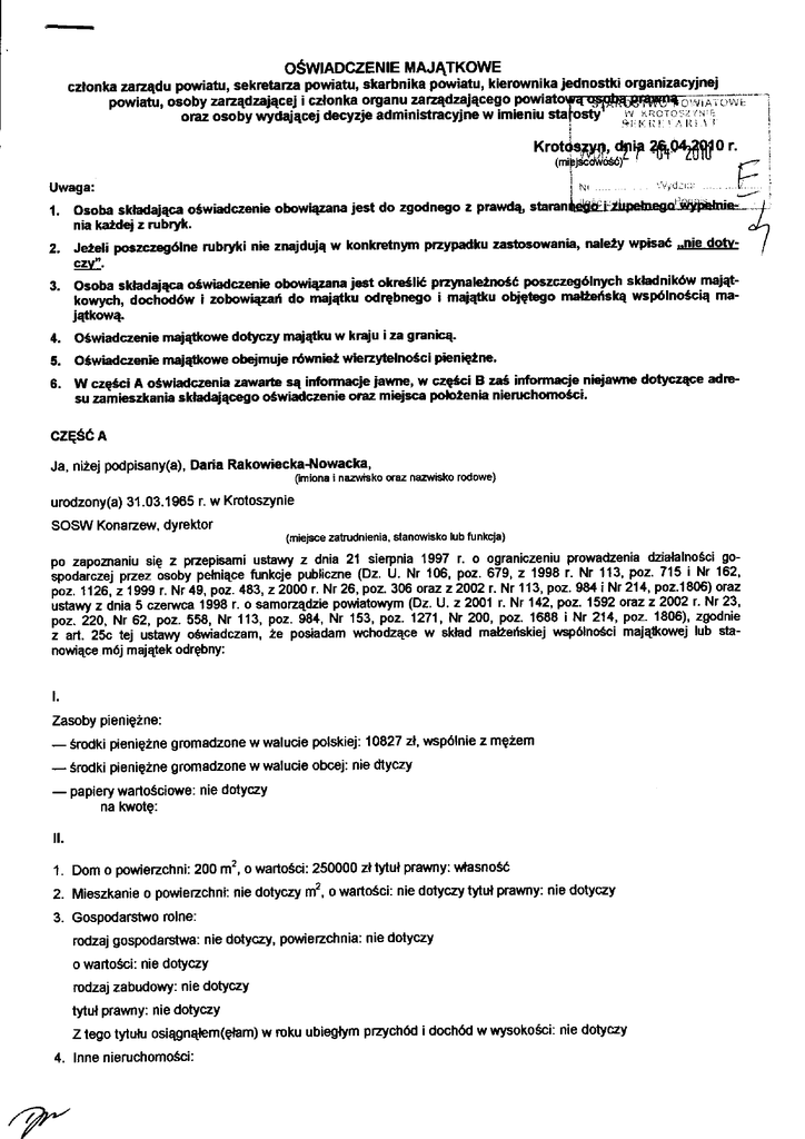 oŚWADczENlE MAJĄTKoWE członka zarzadu pou'iatu' sekrctaęa powiatu, skańnika pdYiatu, kierownika jednośtkiorganizacyjnej powiatu, osoby zaruądzaiącei i Gzłonka oĘanu zarądzającego powi a]'ńJiA'iciv!'L oraz osoby wydająccj decyzje administracyine w imieniu ąfiĘaffio. Uwaga: 1. 2' 4. osoba skladająca oświadczenieobowiryana jest do zgodnego z prawdą nia każdq z .ubryk. Jeżeli po3zczególne rubryki nb zmjduią w konk]€tnym przypadku zasńosowanaa, należy wPBać ..nie dotvczt''. osoba składająga oświadezcie obołią3ana jest okrcślićprzynale2ność p*zczególnyc} skHników mająt_ i.*v"r'' ł".ń.ilo* i zobowiłgań ao ma;ątłu odębnego i maiątku 0Ęę690 małżeńsĘwspólnoścĘ majd(ową. oświadczenie mająttovv€ dotyczy maiątłu w kraju i za granłą- oświadcze ie mjątłowe obeimuje ównież wier.yblności paenĘżn€' 6. W częściA oświadczeniazawa'te są informacje jawne, w częśGiB zaśinlormacie ni€iatme dot}rcząG€ adrc_ su zamieszkania skhdaiągego oświadczenb oraz maejsca pobżenia nienrchomości' 5. czĘślA Ja, niżej @pisany(e), Dańa Rakowi€ckałlowacka, omiona i naztł,isko o.az nazwisl@ rodowe) urcdzony(a) 31.03.1965 sosw Konałzą't'' r. w Krotoszynie dyreKor (miei6ce zatrudnienia, śanowigko lub funkcja) po zapoznniu się z pzepisami ustawy z dnia 21-_sierpnia. 1997 r. o 9q9nic191'9 prowadz€nia działalnościgoipodaiczei przez ósoby pelniące funkcjó publiczne (Dz. U. Nr 106, poz. 679, z 1998 r. 'Nr 113, poz. 715 i Nr 162' poż. łas' z ż00b r. Nr 26, poz.3Ń'oraz z2o02 r. Nr 113, poz. 984 i Nr 214, p9a:18061 o!ąz i*' lęa, ż 1999 r. Nr_4b,1'998 r. o samoządŹe powiatowym (oz' u. z 2001 r' Nr 142, poz. 1592 oruz z 2002 r. Nl 23, i.lstawy z ónia 5 czerwca po.. ź2o, Nr 6i2, poz' 558, Nr 1l3, poz. s84, Nr 153, poz' 1271' Nr 200, poz. !6'88 i Nl 2!4: poz. 1806)' Żgodnie ż art. 25c tej uśńwy ośiadczam' ie posładam wcłrodzące w skład małżeńskiej wspólności majątkowej lub stanowiące mój majątek odrębny: t. zasoby pieniężne: - _ środkirieniężne gromadzone w walucie polskiej: 10827 zł, wspólnie z mężem środkiFieniężne gromadzone w walucie obcćj: nie dtyczy - papiery wańościowe: nie dotyczy na l$otę: il. 1. Dom o powieŻchni: 200 m2, o wańoŚci: 25ooo0 zł tytuł prawny: uńasnoŚć 2. Mieszkanie o powielzchni: nie dotyczy m2' o wartoŚci: nie dotyczy tytuł prawny: nie dotyczy 3. Gospodarstwo rolne: rodzaj gospodarstwa: nie dotyczy, powiezchnia: nie dotyczy o wartości: nie dotyczy rodzaj zabudowy: nie dotyczy tytuł prawny: nie dotyczy z tego tytufu osiągnąłem(ęłam) w mku ubiąlłym przychód i dochód w wysokości: nie dotyczy 4. lnne nieruchomości: wymieniony wyżej inwiezchnia: działka o powiezchni 422 m, na Kórej śoidom o wańości: 60000 zł tytuł prawny: Y\łasność ilr. Posiadam udŻały w spółkach handlowych _ należy podać liczbę i emitenta udziałów: Nie dotyczy udziały te śanowią pakiet większy niż 10% udŻałów w spółce: nie dotyczy z tego tytufu osiągną|em(ęłam) w foku ubiegłym dochód w wysokości: nie dotyczy tv. Posiadam akcje w spółkach handlowych Nie dotyczy - należy podać liczĘ i emitent8 akcji: akcje te slanowią pakiet większy niż 10% akcii w spółce: nie dotyczy z tego tytufu osiągną|em(ęłam) w roku uHegłym dochód w wysokości: nie dotyczy V. do jego maj4ku odĘbnego) od sk€rNabvłem(am) (nabvł mói małżonek, z wyĘczeniem mienia pŻynależnego 'sańoząou ich związków lub od ko_ jednośek terytońalnego, iii*i'piinł,""G oóby óra'wnej,-ńóre ;; przetaQu należy podać opis w dtodze zbyciu ńienie, @ląało oóov piavmej nastę-pujące' mienia i datę nabycia, od kogo: nie dotyczy ń;il;: ń*rci _ vl. 1 . Prowadzę działalnośćgospodarczą2 (należy podaó formę prawną i pzedmiot dŻałalności):nie dotyczy _ _ osobiście nie dotyczy wspólnie z innymi osobami nie dotycuy ztąotytufuosiągnąłem(ęłam)wrokuubiegłymprzychódidochódwwysokości:niedotyczy 2. zarządzam dziahlnością gospodarczą lub jestem przedstawicielem, pełnomocnikiem takiej działalności (należy podać formę prawną i pruedmiot dżałalnoŚci): nie dotyczy - osobiście nie dotyczy wspólnie z innymi osobami nie dotyczy z tego Ą^ufu osiągnąłem(ęłam) w roku ubiegłym pzychód i dochód w wysokości: nie dotyczy vil. 1. W spółkach handlowych (naa^.a, siedziba spółki): nie dotyczy _ jestem członkiem zaŻądu (od kiedy): nie dotyczy - jestem członkiem rany nadzorczej (od kiedy): nie dotyczy jeslem członkiem komisji ra^.izyjnej (od kiedy): nie dotyczy z tego tytufu osiągną|em(ęłam) w roku uHegvm pzychód idochód w wysokoŚci: nie dotyczy 2. W spółdzielniach: nie dotyczy _ _ - jestem członkiem zalządu (od kiedy): nie dotyczy jestem członkiem rady naclzorczej3 (od kiedy): nie dotyczy jestem członkiem komisji rewizyjnej (od kiedy): nie dotyczy z rego tytufu osiągnq|em(ęłam) w roku uliąilym dochód w wysokości: nie dotyczy fundacjach prowadzących działalnośćgospodarczą: nie dotyczy _ jes1em członkiem zaeądu (od kiedy): nie dotyczy _ jestem członkiem rady nadzorczej (od kiedy): nie dotyczy _ ieśem członkiem komisji rewizyjnej (od kiedy): nie dotyczy z tego tytufu osiągnąbm(ęłam) w roku ubiegłym dochód w wysokości: nie dotyczy vill. lnne dochody osiągane z tytufu zatrudnienia lub innej działalnoŚci zarobkowej lub zajęó, uzyskiwanycń z każldego tytufu: wynagrodzenie sosw Konarze: 83787,14 zl z podaniem kwot lx. naleŹy składniki mienia ruchomego o wańości powyżej 1o ooo złotych (w przypadku pojazdów mechanicznych prcdukcji): dotyczy nie podaó martę, model i rok x. zobotviązania pieniężne o wańości powyże.i 10 ooo złolych,.w tym zaciągnięte kredJty i.pożyczki oraz warunki, *Ekiń.Ńaiy udżielone (wobec kogo, w ał'iązku z jakim zdarzeniem, w jakiej wysokości): nie dotyczy oświadczenieskładam świadomy(a)' iż na podslawie art' 233 S 1 Kodeksu kamego za podanie nielub zataje