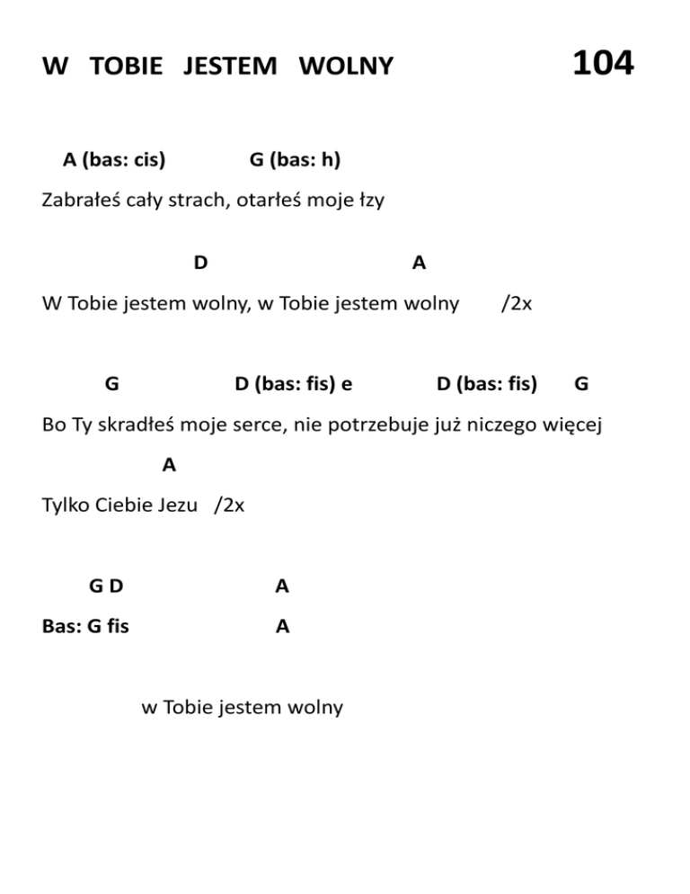 104 W TOBIE JESTEM WOLNY A (bas: cis) G (bas: h) Zabrałeś cały strach, otarłeś moje łzy D A W Tobie jestem wolny, w Tobie jestem wolny G D (bas: fis) e /2x D (bas: fis) G Bo Ty skradłeś moje serce, nie potrzebuje już niczego więcej A Tylko Ciebie Jezu /2x GD A Bas: G fis A w Tobie jestem wolny 104 W TOBIE JESTEM WOLNY Zabrałeś cały strach, otarłeś moje łzy W Tobie jestem wolny, w Tobie jestem wolny /2x Bo Ty skradłeś moje serce, nie potrzebuje już niczego więcej Tylko Ciebie Jezu /2x W Tobie jestem wolny