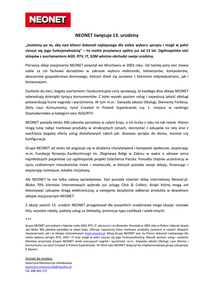 NEONET świętuje 13. urodziny „Jesteśmy po to, aby nasi klienci dokonali najlepszego dla siebie wyboru sprzętu i mogli w pełni cieszyć się jego funkcjonalnością” – to motto przyświeca spółce już od 13 lat. Ogólnopolska sieć sklepów z asortymentem AGD, RTV, IT, GSM właśnie obchodzi swoje urodziny. Pierwszy sklep stacjonarny NEONET powstał we Wrocławiu w 2003 roku. Od tamtej pory sieć stawia sobie za cel fachowe doradztwo w zakresie wyboru elektroniki, telewizorów, komputerów, akcesoriów gospodarstwa domowego, którym dzieli się zarówno z klientami indywidualnymi, jak i biznesowymi. Zaufanie do sieci, bogaty asortyment i konkurencyjne ceny sprawiają, że każdego dnia sklepy NEONET odwiedzają dziesiątki tysięcy konsumentów. Z kolei wysoki poziom usług i najwyższą jakość obsługi potwierdzają liczne nagrody i wyróżnienia. W tym m.in.: Gwiazda Jakości Obsługi, Diamenty Forbesa, Złoty Laur Konsumenta, tytuł Created In Poland Superbrands czy 1. miejsce w rankingu Daymakerindex w kategorii sieci AGD/RTV. NEONET posiada blisko 300 salonów sprzedaży w całym kraju, a ich liczba z roku na rok rośnie. Klienci mogą tutaj nabyć markowe produkty w atrakcyjnych cenach, skorzystać z zakupów na raty oraz z wachlarza bogatej oferty usług dodatkowych takich jak: dostawa sprzętu do domu, montaż czy konfiguracja. Grupa NEONET od wielu lat angażuje się w działania charytatywne i kampanie społeczne, wspierając m.in. Fundację Rozwoju Kardiochirurgii im. Zbigniewa Religi w Zabrzu w walce o zdrowe serca najmłodszych pacjentów czy ogólnopolski projekt Szlachetna Paczka. Ponadto chętnie uczestniczy w życiu codziennym mieszkańców miast i miasteczek, w których posiada swoje sklepy, finansując i wspierając tamtejsze, lokalne inicjatywy. Ale NEONET to nie tylko salony sprzedażowe. Sieć posiada również sklep internetowy Neonet.pl. Blisko 70% klientów internetowych wybrało już usługę Click & Collect, dzięki której mogą oni dokonywać zakupów drogą elektroniczną, a następnie bezpłatnie odbierać produkty w dowolnym sklepie stacjonarnym NEONET. Z okazji swoich 13. urodzin NEONET przygotował dla wszystkich urodzinowe mega okazje: cenowe hity, wysokie rabaty, pakiety usług za złotówkę, promocje typu cashback i wiele innych. *** Grupa NEONET jest jednym z liderów rynku AGD, RTV, IT, akcesoria i multimedia. Powstała w 1991 roku w Polsce i obecnie skupia sieć blisko 300 salonów sprzedaży w całym kraju. Oferuje najwyższej klasy markowe produkty zarówno w swoich sklepach stacjonarnych, jak i w sklepie internetowym www.neonet.pl. Misją Grupy NEONET jest, by Klienci dokonali najlepszego dla siebie wyboru sprzętu RTV, AGD i IT oraz mogli w pełni cieszyć się jego funkcjonalnością. Wysoki poziom usług i zaufanie Klientów przyniosły Grupie NEONET wiele znaczących nagród i wyróżnień, m.in.: Gwiazda Jakości Obsługi, Laur Klienta i Konsumenta czy tytuł Created in Poland Superbrands. W 2016 roku NEONET dołączył do międzynarodowej grupy zakupowej E-Square. Kontakt dla mediów: Katarzyna Maciaszczyk-Sobolewska [email protected] Tel. 696 402 272