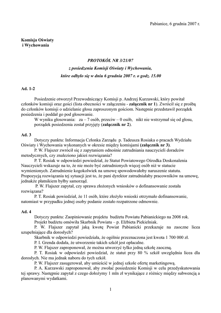 Pabianice, 6 grudnia 2007 r. Komisja Oświaty i Wychowania PROTOKÓŁ NR 3/21/07 z posiedzenia Komisji Oświaty i Wychowania, które odbyło się w dniu 6 grudnia 2007 r. o godz. 15.00 Ad. 1-2 Posiedzenie otworzył Przewodniczący Komisji p. Andrzej Kurzawski, który powitał członków komisji oraz gości (lista obecności w załączeniu - załącznik nr 1). Zwrócił się z prośbą do członków komisji o udzielanie głosu zaproszonym gościom. Następnie przedstawił porządek posiedzenia i poddał go pod głosowanie. W wyniku głosowania: za – 7 osób, przeciw – 0 osób, nikt nie wstrzymał się od głosu, porządek posiedzenia został przyjęty (załącznik nr 2). Ad. 3 Dotyczy punktu: Informacja Członka Zarządu p. Tadeusza Rosiaka o pracach Wydziału Oświaty i Wychowania wykonanych w okresie między komisjami (załącznik nr 3). P. W. Flajszer zwrócił się z zapytaniem odnośnie zatrudniania nauczycieli doradców metodycznych, czy znaleziono jakieś rozwiązania? P. T. Rosiak w odpowiedzi powiedział, że Statut Powiatowego Ośrodka Doskonalenia Nauczycieli wskazuje na to, że nie może być zatrudnionych więcej osób niż w statucie wymienionych. Zatrudnienie kogokolwiek na umowę spowodowałoby naruszenie statutu. Propozycją rozwiązania tej sytuacji jest to, że pani dyrektor zatrudniałaby pracowników na umowę, jednakże płatnikiem byłby samorząd. P. W. Flajszer zapytał, czy sprawa złożonych wniosków o dofinansowanie została rozwiązana? P. T. Rosiak powiedział, że 11 osób, które złożyło wnioski otrzymało dofinansowanie, natomiast w przypadku jednej osoby podanie zostało rozpatrzone odmownie. Ad. 4 Dotyczy punktu: Zaopiniowanie projektu budżetu Powiatu Pabianickiego na 2008 rok. Projekt budżetu omówiła Skarbnik Powiatu – p. Elżbieta Piekielniak. P. W. Flajszer zapytał jaką kwotę Powiat Pabianicki przekazuje na zaoczne licea uzupełniające dla dorosłych? Skarbnik w odpowiedzi powiedziała, że ogólnie przeznaczona jest kwota 1 700 000 zł. P. I. Grenda dodała, że utworzenie takich szkół jest opłacalne. P. W. Flajszer zaproponował, że można utworzyć tylko jedną szkołę zaoczną. P. T. Rosiak w odpowiedzi powiedział, że statut przy 80 % szkół uwzględnia licea dla dorosłych. Nie ma jednak naboru do tych szkół. P. W. Flajszer zasugerował, aby umieścić w jednej szkole ofertę marketingową. P. A. Kurzawski zaproponował, aby zwołać posiedzenie Komisji w celu przedyskutowania tej sprawy. Następnie zapytał z czego dołożymy 1 mln zł wynikające z różnicy między subwencją a planowanymi wydatkami. 1 P. T. Rosiak w odpowiedzi powiedział, że środki będą z tytułu kredytu i 200 tys zł zostanie pozyskane. P. W. Flajszer wyraził stanowisko, iż nie ma potrzeby zaciągania kredytów, ponieważ można te środki we własnym zakresie zarobić. P. A. Kurzawski zwrócił uwagę, iż są różnice w dopłatach na wychowawstwo pomiędzy miastem a powiatem. Zasugerował, aby wyrównać te różnice. P. I. Grenda odpowiedziała, że należałoby poczekać na decyzje pani minister w tej sprawie. P. Elżbieta Dyba w nawiązaniu powiedziała, że regulaminy w mieście są już podpisane, na chwilę obecną nie ma zapowiedzi o innych regulaminach na 2008 rok. Dodała, że na wychowawstwo w gminie Pabianice i gminie Ksawerów przeznaczone jest 6%, natomiast w gminie Dłutów 2%. Różnice są widoczne również w dodatku motywacyjnym – w mieście 4%, a w powiecie 2%. Zwróciła się z prośbą, aby w nowym regulaminie miasto i powiat były na tym samym poziomie. P. I. Grenda powiedziała, że liczba dzieci się zmniejsza natomiast wydatki nie ulegają zmianie. W związku z tym trzeba poszukać środków, ponieważ środki są rozdysponowywane niegospodarnie i dopiero wówczas podjąć rozważania na temat podwyżek. P. W. Flajszer zasugerował, że nawet podniesienie o 10 zł jest istotne. Dodał, że sytuacja oświaty wymaga zaciągnięcia kredytu, dlatego też trzeba znaleźć środki albo je zaoszczędzić. P. I. Grenda w nawiązaniu powiedziała, że należy zmobilizować dyrektorów szkół żeby we własnym zakresie szukali środków. P. T. Rosiak wyjaśnił, że w tym budżecie nie ma załatwionych spraw pochodnych od płac, a te pochodne, które przechodzą za ten rok to jest minus 546 456zł, które trzeba będzie dołożyć za rok, który jest zamknięty. Na uczniów, którzy odeszli ze szkół ( 250 – u ) i 200 – u uczniów, którzy przeszli do Ministerstwa Rolnictwa nie ma subwencji. Dodał, że dyrektor jest dysponentem środków. Subwencje, które przychodzą są wystarczające w przypadku szkół, które posiadają 600 uczniów, a szkoły są w dobrych stanach technicznych. Skarbnik uzupełniła, że mimo malejącej liczby uczniów potrzeby oświatowe nie są mniejsze – 26 468 000 zł, a subwencja wynosi 20 263 000 zł. P. M. Ostojski zaproponował, aby wpłynąć na dyrektorów szkół, żeby zadbali o gospodarność. P. W. Stawicki zapytał czym spowodowana jest różnica w kwocie 150 - zł w dotacjach na Licea dla dorosłych a na inne placówkami. P. T. Rosiak w odpowiedzi powiedział, że kwoty są przeliczane na podstawie ustawy dotyczącej sposobu naliczania subwencji. Określony w niej jest procent na dany typ szkoły. Procent na szkoły dla młodzieży jest odpowiednio większy w porównaniu do szkół dla dorosłych. P. M. Lorenczak w nawiązaniu powiedział, że sa konkretne przeliczniki, które wskazują na to ile komu się należy. My tylko przekazujemy środki, nie rozliczamy z nich. W związku z brakiem pytań Przewodniczący przystąpił do głosowania. W wyniku głosowania: za – 7 osób, przeciw – 0 osób, nikt nie wstrzymał się od głosu, projekt budżetu Powiatu Pabianickiego na 2008 rok został pozytywnie zaopiniowany ( załącznik nr 4 ). Ad. 5 Dotyczy punktu: Przyjęcie protokołu Nr 3/20/07 z dnia 27 listopada 2007 roku. W związku z brakiem uwag do przedstawionego protokoł