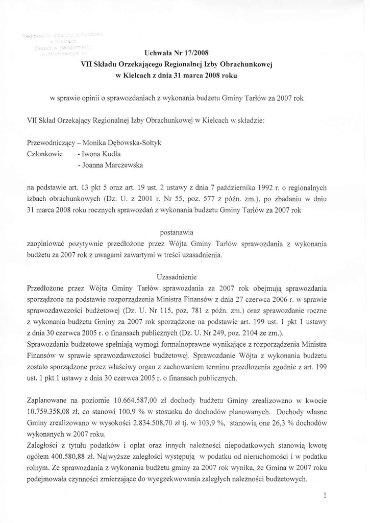 Uchłvala Nr l712008 vII skladu orzekaiącego Regionalnei Izbv Obrachunkołvej w Kielcach z dnia 31 marca 2008 roku w splawie opinii o splawoŻdaniach Ż Nykonania budŻetu Cjmin}' Tarłóu,za 2007 rok VII Skłac] orzekający Regionainej Izby obrachuŃolvej rł' Kielcaclr rł, składzie: Przewodniczący Monika Dębowska-Sołt]-k Członkowie - hł'ona Kudła - alt' Joa la Marczewska z dnia 7 paŹdziernika 1992 r. o regionalrryc1r izbach obrachunkou'vch (Dz' U' z 200l r' Nr 55, poz. 577 z póż11. zm.)' po Zbadaniu w dniu na podsta\lie 13 pkt 5 ora7' aIt. 19 ust. 2 usta\łT 31 narca 2008 Ioku locznych sprawoŻdań Ż \łJkonania budżetu Gminy -fańów za 2007 rok postanawia zaopiniować poz}1y\łnie plzedłożone prŻez wójta Gminy Tarłórv spla\ł'ozdania z \\Tkonania budżetu za 2007 rok Z ulł'agami zau'aft'vmi u,tleści uzasadnienla' Uzasadnienie Przedłożone przez Wójta Gminy Tarłórł' spnu.ozdania za 2007 rok obejmują sprawoŻdania sporzalzone na podstarvie rozporządzenia Ministra Finansóq,z dnia 27 czer'wca 2006 r' w sprarłie splawozda$'czości budżetowej (Dz' U' Nr z późn. zfi') oraz splalvozdanie loczne z rłykonania budŻetu Gminy za 2007 rok spoŹądzonę na podsta\łie afi. l99 ust. 1 pkt 1 usta\łY 115, poz. 781 z dnia 30 czerrlca 2005 r. o lrnansach publicznych (DZ. U. NI 249' poz' 2104 zę zm'). Sprawozdania budżeto\łe spełniają w]'mogi formallioprarłne wylikające z rozporzalzenia Ministra Finansów rł' spra\ł'ie spfawozdalvczości budżetowej. Sprawozdanie wójta Z wykonania budżetu Zoslało sporządzone pŻez u,łaściu'yolgan 7 zacho\ł'anięm teminu przedłożenia zgodnie z alt. 199 ust. I pkt 1 ustawJ z dnia 30 czerwca 2005 r. o finansach publiczn_vch. Zaplanowane na pouiomie 10.664'587,00 uł dochody budżętu Gminy ]łeaiizowano w kwocie 10.759'358'08 Zł' co stanowi 100'9 % w stosunku do dochodów plano\łanych. Dochody własne Gminy zrealizowano.'v w1sokości 2.834'508,7azłtj.w 103'9%. stano\\,ią one 26,3 % dochodów wykonanych \\, 2007 roku. Zaległościz Ęłułupodatkólv i opłat olaz innych nalężnościniepodatko\ł,vch stano1łią kwotę ogółem 400.580'88 zł' Najw1'ższe zaległości$Ystępują w podatku od nieruchomości i v,podatku lolnym. Ze sprawozdania z rłykonania budżetu gminy za 2007 rok urynika' zc Gmjna rl'2007 roku podejmorł,ala czyrutości zmieŻające do wyegzekwowania Zaległych naleŹności budżetowych. Dochody z tylułu op}at Za ze7wolenia na splŻedaz alkoholu zap]ano\\'ane 1ł' wysokości 66' ]50.00 zł lr1'konane zostały rv rł,rsokości73'886.60 planowan1'ch. W!'datki \\. dzia]e 851 - zł co stano$i ll1'7 % rv stosuŃu ..ochrona zdro\}ia". w rozdzialę Clo dochodó\Ą, 85153 '.ZNcczanie narkomanii" plan rv1'nosił 1'000,00 zł. zostal zreallzo$'anv rv kwocie 927.97z1' olaz \ł'rozdziale alkoholizmo\\'i'' Żaplanowane rv rq'sokości 65'994,00zł 7ostałI wykonane '.Przecirvdziałanie rł.ł1.sokościnizszej od p]anu ti. \\' ku'ocie ól.23ó.83 zł. Nie\ł'\'kor4'stanc tv 2007 roku środki 85l54 po*inny staDo'l\,ić elęment finansowal a w),Ciatków \Ą'dziale 851 - ,.oc]rrona zdrowia''. rozdziale alkoholizmorvi'' rł 2008 85l53 ''Zwalczanie narkomanii'' oraz rozclziale 85l5'1 ',Przcciwdziałanie roku. Plan rlydatkór.v po zmianach ustalon'v rr' klvocie ll'7,13'783,00 |0 '926 '1 4I -1 4 zI rj. 93.0 Óń \v stos u nku d o \! zł rłykonano lł'wysokości datkó\Y planotan)'ch' znacznie poniżej ogólnego wskaźnika rr'-rkonania \Ńdatków budżetu zrealizorł'ano w dziale 921 - '.Kulfura i ocluona dŻieclzictwa nalodowego '' _ ..Bezpicczeństrlo publiczne'' _ 69.2% planu. 6.+,5 %o P]anu. ora'z w rł-_Ydatki dziale 754 W1'datki w r'ozdziaie 01030 .'IZby rolnicze'' zlea]iŻowano $'\ł"r'sokości9.435'16 zł. tj. niezracznje po\Bżej ró\ł'no\ł'aności20ń rł'pĘrł,óu, z podatku rolnego. z budŻefu Gmin1 zaplanowano dotacje \ł \r}sokości 619'250.00 568 '307 ,37 zł co stano\ł'i 5,2 0ń do \łTkonan!'ch \łxdatków ogółen. zł a rł;-konanie rr1nioslo W rr1niku anaiizy porólłłrarł'czejv'lkoncnia \ldatków z planem lq nikającym z uchlł'ałRady Gminy olaz Zatządzeń wójta Gmiry' nie st\Yieldzono przekroczeń plano*.anych uielkości \ł}datkótv budżeto$Tch' wskazuje to na dokon}_wanie w}'datkó\ł, budżeto\\Ych zgodnie z przepisami at' l38 pkt 3 lr zrviązku z ań. 189 ust. 1 usta\) z dnia 30 czer$'cą 2005 t' o finansach publicznych. Różnica międz.v rł-vkonany'rni dochodami iw1'datkami budŻeto$f'mi w 2007 rokLl stanowi defic't budŻetu rr kwocie l67.383'66 zł przy_ planowan'rm deficycie l q'sokości l.079' l96'00 zł. Przychod'! budżetu zaplanowano rt krłocie l.761.825'00 zł' a lv-ł'konaoo .*' krvocie 1.546.825,39Zł. Rozcl'tody zaplanowano i rłykonano w kwocie ó82'ó29.00 zł. Zoborviązania Gminy Tarłórv wędług tytułóŚ dłuŹn)'ch na koniec 2007 roku' zgodDie ze sprawozdaniem Rb-Z rłynoszą ogółem 3'519.537.69 zł, z czego ku,ota 3.500'000 zł to zoborviązania z qĄułu ked}1ów i poŻyczek długoterminolBch natomiast krvota 19.53'1-69 zl to zobowiązania rrynraga1ne' Ze sprawozdaIria opisowego łynika że są to zobowiąza a rł1magalne Zakładu Gospodarki Komunalnej rr Tarlortie. Zdaniem składu orzekającego należ!' przeanalizować pod kontem naruszenia dvscyplin,v linansów prrblicznych zoborł'iązania \rymagalne nie uregulor,ane na koniec 2007 roku. Zgodnie bo*icm zart,l6 ust 1 ustaw] z drlia 17 grudnia 2004r o odporł'iedzialnościza naruszenie dysc)'p]iny finansó$' publiczn1'ch ( Dz. U. z 2005f Nr 14 paz' ]l1 Że zmianami') naruszeniem d1'scypliny finansólv prLb)icarych jest niew1konanie zobowiązania iednostlii scktora finarrsórł publicznych. którego skutkiem jest zapłata odsetek. kar lub opłat, zgodnie zaśz art. 16 ust 2 naruszeniem dysc1'pliny finansów publicznych jest dopuszczenie przez kierormika icdnostki sektom finansó*' publicznych do nic wykonania zobowiązania jednostki' któIego termin upĘna'ł. na skutek zaniedbania ohorł iąz\órł rr ua