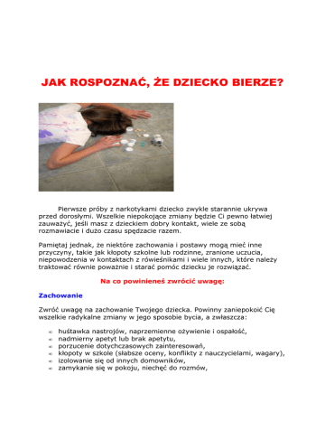 JAK ROSPOZNAĆ, ŻE DZIECKO BIERZE? Pierwsze próby z narkotykami dziecko zwykle starannie ukrywa przed dorosłymi. Wszelkie niepokojące zmiany będzie Ci pewno łatwiej zauważyć, jeśli masz z dzieckiem dobry kontakt, wiele ze sobą rozmawiacie i dużo czasu spędzacie razem. Pamiętaj jednak, że niektóre zachowania i postawy mogą mieć inne przyczyny, takie jak kłopoty szkolne lub rodzinne, zranione uczucia, niepowodzenia w kontaktach z rówieśnikami i wiele innych, które należy traktować równie poważnie i starać pomóc dziecku je rozwiązać. Na co powinieneś zwrócić uwagę: Zachowanie Zwróć uwagę na zachowanie Twojego dziecka. Powinny zaniepokoić Cię wszelkie radykalne zmiany w jego sposobie bycia, a zwłaszcza: • • • • • • huśtawka nastrojów, naprzemienne ożywienie i ospałość, nadmierny apetyt lub brak apetytu, porzucenie dotychczasowych zainteresowań, kłopoty w szkole (słabsze oceny, konflikty z nauczycielami, wagary), izolowanie się od innych domowników, zamykanie się w pokoju, niechęć do rozmów, • • • • • • • • • • • • zamykanie swojego pokoju na klucz, akcentowanie potrzeby prywatności częste wietrzenie pokoju, używanie kadzidełek i odświeżaczy powietrza, wypowiedzi zawierające pozytywny stosunek do narkotyków, zmiana grona przyjaciół, zwłaszcza na starszych od siebie, krótkie rozmowy telefoniczne prowadzone półsłówkami, późne powroty lub nagłe wyjścia z domu, bunt, łamanie obowiązujących w domu zasad, kłamstwa, wynoszenie wartościowych przedmiotów z domu, powtarzające się zgłaszanie przez dziecko zagubień lub kradzieży przez rówieśników drobnych sum pieniędzy, kłopoty z koncentracją, zmiany w porach spania, nadmierne reakcje na krytykę lub niewielkie nawet niepowodzenia. Wygląd zewnętrzny • • • • • • • • • nowy styl ubierania się, szybkie wychudzenie lub nagły wzrost masy, przewlekły katar, krwawienie z nosa, zaburzenia pamięci oraz toku myślenia, przekrwione oczy, nadmiernie zwężone lub rozszerzone źrenice nie reagujące na światło, bełkotliwa, niewyraźna mowa, brak zainteresowania swoim wyglądem i nieprzestrzeganie zasad higieny, słodkawa woń oddechu, włosów, ubrania, ślady po ukłuciach, ślady krwi na bieliźnie, "gęsia skórka". Narkotyki lub przybory do ich używania • • • • • • fifki, fajki, bibułki papierosowe małe foliowe torebeczki z proszkiem, tabletkami, kryształkami lub suszem kawałki opalonej folii aluminiowej, łyżka znaczki, białe lub kolorowe pastylki z wytłoczonymi wzorkami leki bez recepty tuby, słoiki, foliowe torby z klejem • igły, strzykawki UWAGA! • • • • Nie wszystkie z wymienionych objawów muszą się pojawić. Dopiero pojawienie się kilku z wymienionych objawów może wskazywać na narkotyki. Jest mało prawdopodobne, żeby wszystkie objawy wystąpiły jednocześnie. Im głębsza faza uzależnienia, tym objawy choroby są bardziej widoczne, wynikają z utraty kontroli nad braniem środków odurzających. Wzrasta ryzyko przedawkowania i śmierci. Tzw. test oczny Dzieci, zwłaszcza w początkowej fazie uzależnienia, starają się maskować. Ukrywają narkotyki i przybory do ich zażywania. Wietrzą często swój pokój, używają kadzidełek, odświeżaczy. Zdradzają je jednak oczy. Jako rodzice musimy zwracać uwagę na oczy swojego dziecka. One powiedzą nam wiele. Obserwacja ogólna oczu (w warunkach oświetlenia pokojowego). Jeśli zauważysz u swojego dziecka: • • • • • • zaczerwienienie spojówek, łzawienie, opadnięcia powieki (zakrywa od góry więcej niż 2 mm rogówki), zaczerwienienie brzegów powiek, nadmierne rozszerzenie źrenicy (średnica ponad 6 mm), nadmierne zwężenie źrenicy (średnica poniżej 3 mm), Może to być sygnał, że w grę wchodzić mogą narkotyki. Ostrzeżeniem może być również używanie przez Twoje dziecko kropli do oczu (jeśli wiesz, że ma zdrowe oczy). Młodzi często w ten sposób maskują ww. objawy "brania". Jeżeli w trakcie obserwacji ogólnej oczu dziecka zauważysz coś podejrzanego, zastosuj prostą metodę badania oczu: Skieruj światło latarki kolejno na poszczególne oczy Reakcja źrenic dziecka. Jeśli reakcja źrenic na światło jest nienaturalnie na światło powolna, coś jest nie tak. Obserwacja oczopląsu Poruszaj palcem przed oczami dziecka. Zatrzymaj palec nieruchomo na kilkanaście sekund. Jeśli zauważysz oczopląs gałek ocznych lub ich drgania podczas wpatrywania się w nieruchomy palec, może to być objaw zażywania narkotyku. Obserwacja zbieżności oczu Przesuwaj palec z odległości ok. 20 cm do czubka nosa i przytrzymaj go dotykając do nosa dziecka przez ok. 5 sek. Jeśli dziecko nie potraci śledzić ruchu palca, może to być niepokojący sygnał. Składniki testu Metoda badania Główne objawy Ocena ogólna obserwacja oczu w warunkach oświetlenia pokojowego zaczerwienienie spojówek, łzawienie, opadnięcie powieki, zaczerwienienie brzegów powiek Rozmiary źrenic ocena szerokości źrenic (test jest dodatni, gdy w oświetleniu pokojowym średnica węższa niż 3 mm lub szersza niż 6 mm) rozszerzenie źrenicy, zwężenie źrenicy kierujemy światło leniwe zwężenie lub brak Reakcja źrenic na latarki kolejno na każde zwężenia pod wpływem światło oko światła Obserwacja oczopląsu polecamy wodzenie oczami za palcem w płaszczyźnie poziomej i pionowej przesuwamy palec z odl. 15 cm do czubka Obserwacja nosa z poleceniem konwergencji śledzenia ruchu palca i (ruchu zbieżnego utrzymujemy palec przy gałek ocznych) czubku nosa około 5 sek. oczopląs gałek ocznych w jednej lub w każdej pozycji, niemożność wpatrywania się w nieruchomy palec bez drgań gałek ocznych niemożność śledzenia ruchu palca obydwoma oczami, brak ruchu zbieżnego, jednego lub obydwu oczu, niemożność utrzymania konwergencji przez 5 sek. Test oczny opracowano na podstawie artykułu "Test oc