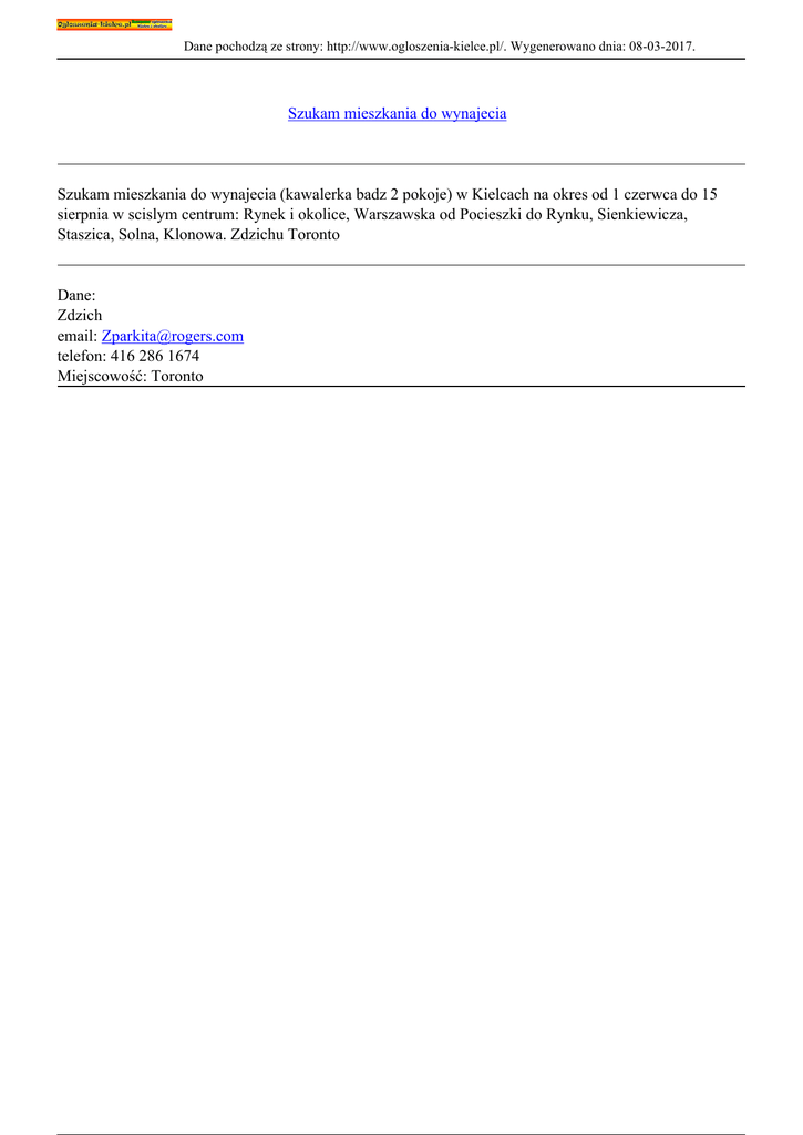 Dane pochodzą ze strony: http://www.ogloszenia-kielce.pl/. Wygenerowano dnia: 08-03-2017. Szukam mieszkania do wynajecia Szukam mieszkania do wynajecia (kawalerka badz 2 pokoje) w Kielcach na okres od 1 czerwca do 15 sierpnia w scislym centrum: Rynek i okolice, Warszawska od Pocieszki do Rynku, Sienkiewicza, Staszica, Solna, Klonowa. Zdzichu Toronto Dane: Zdzich email: [email protected] telefon: 416 286 1674 Miejscowość: Toronto