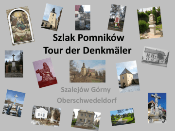 Szlak Pomników Tour der Denkmäler Szalejów Górny Oberschwedeldorf Szlak Pomników Tour der Denkmäler 2 Szalejów Górny Oberschwedeldorf Szalejów Górny leży pomiędzy Kłodzkiem a Polanicą Zdrój przy trasie E67. Pierwsza wzmianka o miejscowości „Swedlerdorph“ pochodzi z 25.11.1269 z Dokumentu Praskiego. W roku 1366 przeniesiono prawa parafialne z Szalejowa Dolnego do Szalejowa Górnego ze względu na bardziej centralne położenie, gdyż doszły nowe wioski. Rodzina von Glubocz miała w posiadaniu „Swedlerdorph“ do roku 1350. Arnoszt z Pardubic odkupił wioskę i jeszcze tego samego roku podarował ją Augustianom, którzy posiadali ją częściowo do roku 1597. W latach 1597 – 1776 należała w przeważającej części do Jezuitów. Patronatem nad wioską dzielili się później aż do roku 1945 baron von Münchhausen (Szalejów Dolny) oraz państwo Wallisfurt. Długość miejscowości 4 km Wielkość 1.244 ha Położenie n.p.m. 327 - 400 m Mieszkańcy 1841 889 osób z tego 11 wyznania ewangelickiego 1937 855 osób W roku 1945 wieś znalazła się w granicach Polski i liczy sobie dzisiaj (2016) 857 mieszkańców. Należy teraz do Gminy Kłodzko, w skład której wchodzi Oberschwedeldorf liegt zwischen Glatz und Bad Altheide an der E67. Ersterwähnung am 25.11.1269 in einer Prager Urkunde als „Swedlerdorph“. Im Jahre 1366 wurden die pfarrlichen Rechte von Niederschwedeldorf auf Oberschwedeldorf übertragen, weil neue Dörfer hinzu kamen, es am zentralsten lag. Die Familie von Glubocz besaß „Swedlerdorph“ bis 1350. Arnestus von Pardubuitz kaufte es ab und schenkte es noch im selben Jahr den Augustinern, die es dann bis 1597 teilweise besaßen. Von 1597 – 1776 gehörte es größtenteils den Jesuiten. Das Patronat teilten sich dann bis 1945 Freiherr von Münchhausen (Niederschwedeldorf) und Herrschaft Wallisfurt. Länge des Ortes 4 km Größe 1.244 ha Höhenlage 327 - 400 m Einwohner 1841 889 Personen davon 11 evangelisch 1937 855 Personen 1945 wurde es polnisch und hat heute (2016) 857 Einwohner. Es gehört jetzt zur Gemeinde Glatz, einem Zusammenschluss von 35 Dörfern. 3 13 1 12 10 11 4 9 8 3 2 5 7 6 Bundesamt für Karografie und Geodäsie, RichardStrauß-Allee 11 60598 Frankfurt /Main Ausschnitt Meßtischblatt der Grafschaft Glatz Nr. 5565; erstellt zwischen 1883 – 1940 4 Święty obraz w gospodarstwie Tschöpe nr 45 Około roku 1850, w wielu nowo wybudowanych budynkach umieszczano w niszach okiennych od strony ulicy, pod szczytem dachu święty obraz, zamiast kapliczki czy krzyża przed domem. Diecezjalny konserwator Hrabstwa Kłodzkiego, proboszcz w Domaszkowie / Bystrzyca, Artur Heinke sfotografował ten obraz już w roku 1939. Przedstawia on: Trójcę św. koronującą przyjętą w niebiosa Matkę Boską. U jej stóp klęczą apostołowie Szymon i Juda Tadeusz. Im został poświecony kościół w Szalejowie Dolnym. Obraz ten świadczy o tym, że Hilmar I baron von Münchhausen z Szalejowa Dolnego miał patronat nad tym gospodarstwem w Szalejowie Górnym. Dom został zbudowany w roku 1869 i w tymże roku zlecono wykonanie obrazu. Odnowiony został w 1908 r. przez Amanda Tschöpe. Profesor gimnazjalny w Kłodzku i proboszcz w Szalejowie Górnym, Aloys Bach, autor „Urkundlichen Kirchengeschichte der Grafschaft Glatz“ [„Udokumentowana historia kościoła w Kłodzku“] pisał też kronikę Szalejowa Górnego, która znajduje się w parafialnym archiwum. Zmarł 01.02.1845 i został tutaj pochowany. Heiligenbild auf dem Tschöpe Hof Nr. 45 In der Zeit um 1850 wurde vielerorts bei Neubauten an der Straßenfront im Giebel ein großes Heiligenbild in eine obere Fensternische gestellt, anstatt eines Bildstockes oder Kreuzes vor dem Hof. Der Diözesan Konservator für die Grafschaft Glatz, der Pfarrer in Ebersdorf/Habelschwerdt, Artur Heinke, fotografierte schon 1939 dieses Bild. Es stellt dar: Die heiligste Dreifaltigkeit krönt die in den Himmel aufgenommene Gottesmutter. Zu ihren Füßen kniend die Apostel Simon und Judas Thaddäus. Ihnen wurde die Pfarrkirche in Niederschwedeldorf geweiht. Das Bild bezeugt, dass Hilmar I von Münchhausen aus Niederschwedeldorf das Patronat über diesen Hof in Oberschwedeldorf ausübte. 1869 wurde das Haus gebaut und das Bild in Auftrag gegeben. Renoviert wurde es von Amand Tschöpe 1908. Der Gymnasial Professor in Glatz und Pfarrer in Oberschwedeldorf, Aloys Bach, Verfasser der „Urkundlichen Kirchengeschichte der Grafschaft Glatz“ schrieb auch eine Pfarrchronik von Oberschwedeldorf, die sich im Pfarrarchiv befindet. Er starb am 01.02.1845 und wurde hier begraben. 5 6 Kapliczka w gospodarstwie Oskara Heinze nr 24 Kapliczka ta została postawiona po przejściu dżumy w roku 1680 przez ówczesnego właściciela Andreasa Wenke. Dżuma zabiła w Kłodzku 1.468 mieszkańców. Gospodarstwo miało wielkość 82 mórg (20,5 ha). Znajdujący się za gospodarstwem duży kamieniołom był wydzierżawiony. Trasa E67 była wyrównywana tutaj, przy „Kłodzkiej Górze” w 1934 r. Na górze, przed miedzą graniczną do Szalejowa Dolnego stała po lewej stronie drewniana strażnica. Miała za zadanie chronić Kłodzko przed atakami z zachodu. W czasie wojny o sukcesję bawarską doszło tutaj 18.01.1779 do ciężkiej bitwy pomiędzy wojskami austriackimi i pruskimi. Na zlecenie Rudolfa Heinze, Köln kapliczka została odremontowana. Nadzór nad pracami przejął w roku 2011 Helmut Goebel. Bildstock auf dem Hof Oskar Heinze Nr. 24 Errichtet wurde dieses Denkmal nach der großen Pest 1680 vom damaligen Besitzer Andreas Wenke. Die Pest forderte in Glatz 1.468Tote. Das Gut war 82 Morgen (20,5 Ha) groß. Ein hinter dem Hof gelegener großer Steinbruch war verpachtet. Die E 67wurde ab hier am „Glatz Berg“ 1934 begradigt. Oben vor der Flurgrenze zu Niederschwedeldorf stand links das Bloghaus. Es sollte Glatz vor Angriffen aus dem Westen schützen. Hier kam es im Bayerischen Erbfolgekrieg am 18.01.1779 zu einem schweren Gefecht zwi
