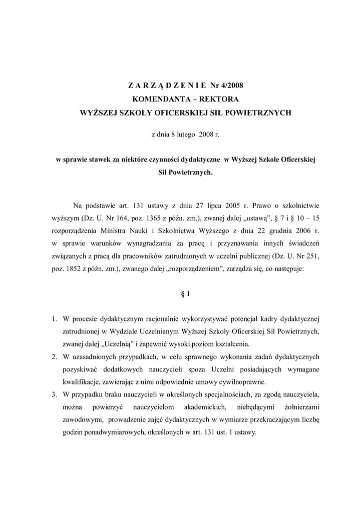Z A R Z Ą D Z E N I E Nr 4/2008 KOMENDANTA – REKTORA WYŻSZEJ SZKOŁY OFICERSKIEJ SIŁ POWIETRZNYCH z dnia 8 lutego 2008 r. w sprawie stawek za niektóre czynności dydaktyczne w Wyższej Szkole Oficerskiej Sił Powietrznych. Na podstawie art. 131 ustawy z dnia 27 lipca 2005 r. Prawo o szkolnictwie wyższym (Dz. U. Nr 164, poz. 1365 z późn. zm.), zwanej dalej „ustawą”, § 7 i § 10 – 15 rozporządzenia Ministra Nauki i Szkolnictwa Wyższego z dnia 22 grudnia 2006 r. w sprawie warunków wynagradzania za pracę i przyznawania innych świadczeń związanych z pracą dla pracowników zatrudnionych w uczelni publicznej (Dz. U. Nr 251, poz. 1852 z późn. zm.), zwanego dalej „rozporządzeniem”, zarządza się, co następuje: §1 1. W procesie dydaktycznym racjonalnie wykorzystywać potencjał kadry dydaktycznej zatrudnionej w Wydziale Uczelnianym Wyższej Szkoły Oficerskiej Sił Powietrznych, zwanej dalej „Uczelnią” i zapewnić wysoki poziom kształcenia. 2. W uzasadnionych przypadkach, w celu sprawnego wykonania zadań dydaktycznych pozyskiwać dodatkowych nauczycieli spoza Uczelni posiadających wymagane kwalifikacje, zawierając z nimi odpowiednie umowy cywilnoprawne. 3. W przypadku braku nauczycieli w określonych specjalnościach, za zgodą nauczyciela, można powierzyć nauczycielom akademickich, niebędącymi żołnierzami zawodowymi, prowadzenie zajęć dydaktycznych w wymiarze przekraczającym liczbę godzin ponadwymiarowych, określonych w art. 131 ust. 1 ustawy. §2 1. Nauczycielom akademickim zatrudnionym w Uczelni, niebędącymi żołnierzami zawodowymi, dodatkowe wynagrodzenie za pracę w godzinach ponadwymiarowych (art. 131 ust. 1 ustawy), naliczać z zachowaniem następujących warunków: 1) bez zgody nauczyciela akademickiego liczba godzin ponadwymiarowych nie może przekraczać liczby dopuszczalnej dla zajmowanego stanowiska; 2) wynagrodzenie za pracę w godzinach ponadwymiarowych przyznaje się, po dokonaniu rozliczenia faktycznych godzin dydaktycznych, raz w roku, po zakończeniu roku akademickiego; 3) wynagrodzenie za godziny ponadwymiarowe ustala się na podstawie stawek określonych w § 3 ust. 1 pkt. 1. 2. Dodatkowe wynagrodzenie jest przyznawane nauczycielom akademickim za: 1) udział w pracach związanych z postępowaniem rekrutacyjnym; 2) kierowanie i sprawowanie opieki nad studenckimi praktykami zawodowymi; 3) opracowanie recenzji w postępowaniu kwalifikacyjnym poprzedzającym zatrudnienie na stanowisku profesora nadzwyczajnego osoby nie posiadającej tytułu naukowego profesora lub stopnia naukowego doktora habilitowanego. 3. Wynagrodzenie za zajęcia dydaktyczne prowadzone na podstawie umowy cywilnoprawnej nauczycielowi spełniającemu warunki zawarte w § 1 ust. 2, naliczyć zgodnie z treścią umowy, według stawek określonych w § 4. 4. Pracownikom Uczelni niebędacymi nauczycielami akademickimi oraz osobom spoza Uczelni, którzy posiadają odpowiednie kwalifikacje, wynagrodzenie naliczyć na podstawie umów cywilnoprawnych, według stawek zawartych w § 4. §3 1. Wysokość wynagrodzenia za czynności wymienione w § 2 ust. 1 – 3, obliczoną jako procent wynagrodzenia nauczyciela określonego w „Tabeli miesięcznych stawek wynagrodzenia zasadniczego nauczycieli akademickich zatrudnionych na stanowiskach naukowo-badawczych, naukowych i dydaktycznych”, stanowiącej załącznik Nr 1 do rozporządzenia , ustala się na: 1) za czynności określone w § 2 ust. 1: 2 Lp. Stanowisko zajmowane w Uczelni Stawka za godzinę obliczeniową, odpowiadającą 45 minutom 1. Profesor zwyczajny, profesor nadzwyczajny posiadający tytuł naukowy, profesor wizytujący Profesor nadzwyczajny posiadający stopień naukowy doktora habilitowanego lub doktora, profesor wizytujący posiadający stopień naukowy doktora habilitowanego lub doktora, docent, adiunkt posiadający stopień naukowy doktora habilitowanego 2% minimalnego wynagrodzenia zasadniczego profesora zwyczajnego 2% minimalnego wynagrodzenia zasadniczego profesora nadzwyczajnego posiadającego stopień naukowy doktora habilitowanego 2% minimalnego wynagrodzenia zasadniczego adiunkta posiadającego stopień naukowy doktora 2% minimalnego wynagrodzenia zasadniczego asystenta 2. 3. Adiunkt posiadający stopień naukowy doktora, starszy wykładowca 4. Asystent, wykładowca, lektor, instruktor 2) za czynności określone w § 2 ust. 2 pkt 1 w wysokości określonej w zarządzeniu Nr 17/07 Komendanta – Rektora Wyższej Szkoły Oficerskiej Sił Powietrznych w Dęblinie z dnia 20 lipca 2007 r. w sprawie dodatkowego wynagrodzenia dla nauczycieli akademickich za udział w pracach związanych z postępowaniem rekrutacyjnym do WSOSP w 2007 r.; 3) za czynności określone w § 2 ust. 2 pkt 2 w wysokości 50% stawki minimalnego wynagrodzenia zasadniczego asystenta; 4) za czynności określone w § 2 ust. 2 pkt 3 w wysokości 40% stawki minimalnego wynagrodzenia zasadniczego profesora zwyczajnego. 2. Za czynności określone w ust. 1 pkt 1 – 4 wynagrodzenie nauczycielom akademickim będącym żołnierzami zawodowymi, oblicza się zgodnie z zasadami określonymi w przepisach o służbie wojskowej żołnierzy zawodowych. §4 Za czynności określone w § 2 ust. 3 i 4 wysokość wynagrodzenia za godzinę obliczeniową, odpowiadającą 45 minutom, ustala się na: Stawka w zł. Lp. 1. 2. Realizujący proces kształcenia profesor 3. doktor habilitowany doktor 4. magister lub równorzędny Wykład Seminarium, egzamin semestralny Ćwiczenie 100-120 90-110 80 70-110 90 70 70-90 70-90 60-80 50-70 50 50 3 §5 1. Ustalam następujące stawki wynagrodzeń za prace związane z przygotowaniem materiałów dydaktycznych za jeden arkusz autorski: 1) za opracowanie zamówionego podręcznika z klasyfikacją ISBN 500 – 600 zł; 2) za opracowanie recenzji zamówionego podręcznika 50 – 70 zł; 3) za opracowanie zamówionego skryptu 400 – 500 zł; 4) za artykuł do Zeszytów Naukowych WSOSP 300 – 400 zł; 5) za tłumac