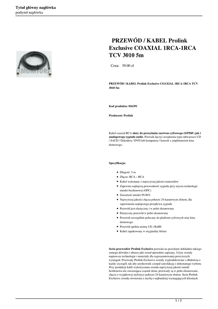 Tytuł główny nagłówka podtytuł nagłówka PRZEWÓD / KABEL Prolink Exclusive COAXIAL 1RCA-1RCA TCV 3010 5m Cena: 39.00 zł PRZEWÓD / KABEL Prolink Exclusive COAXIAL 1RCA-1RCA TCV 3010 5m Kod produktu: 016391 Producent: Prolink Kabel coaxial RCA służy do przesyłania zarówno cyfrowego (S/PDiF) jak i analogowego sygnału audio. Pozwala łączyć urządzenia typu odtwarzacz CD / SACD / Dekodera / DVD lub komputera / konsoli z amplitunerem kina domowego. Specyfikacja: Długość: 5 m Złącze: RCA – RCA Kabel wykonany z najwyższej jakości materiałów Zapewnia najlepszą przewodność sygnału przy użyciu technologii miedzi beztlenowej (OFC) Zawartość miedzi 99,96% Najwyższej jakości złącza pokryte 24-karatowym złotem, dla zapewnienia najlepszego przepływu sygnału Przewód jest elastyczny i w pełni ekranowany Elastyczny przewód w pełni ekranowany Przewód szczególnie polecany do platform cyfrowych oraz kina domowego Przewód spełnia normy CE i RoHS Kabel zapakowany w oryginalny blister Seria przewodów Prolink Exclusive pozwala na przesłanie dokładnie takiego samego dźwięku i obrazu jaki został uprzednio zapisany. Użyte zostały najnowsze technologie i materiały dla zagwarantowania powyższych wymagań. Przewody Prolink Exclusive zostały wyprodukowane z dbałością o każdy szczegół, tak aby użytkownik czerpał satysfakcję z dokonanego wyboru. Przy produkcji kabli wykorzystana została najwyższej jakości miedź beztlenowa nie zawierająca cząstek tlenu, przewody są w pełni ekranowane, złącza o wyjątkowej stylistyce pokryto 24 karatowym złotem. Seria Prolink Exclusive została stworzona z myślą o najbardziej wymagających klientach. 1/2 Tytuł główny nagłówka podtytuł nagłówka Łączy w sobie doskonalą jakość przy stosunkowo niskiej cenie. Stosując przewody Prolink Exclusive masz pewność, że dokonałeś właściwego wyboru w celu osiągnięcia i zapewnienia maksymalnej jakości transmisji sygnału. Szczegóły Długość RCA (CINCH) Rodzaje przyłączy 5m 1RCA RCA - RCA 2/2 Powered by TCPDF (www.tcpdf.org)