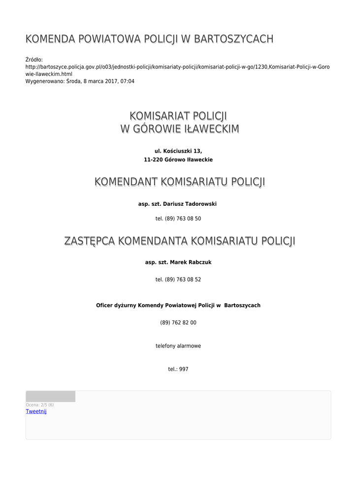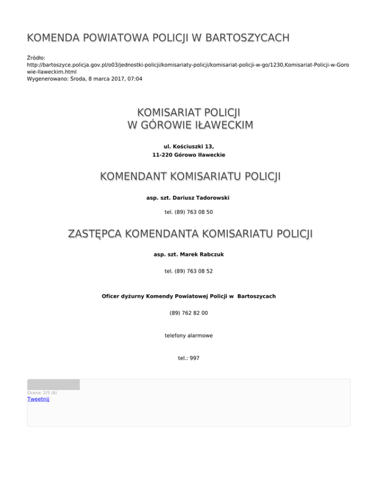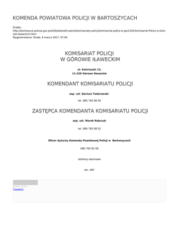 KOMENDA POWIATOWA POLICJI W BARTOSZYCACH Źródło: http://bartoszyce.policja.gov.pl/o03/jednostki-policji/komisariaty-policji/komisariat-policji-w-go/1230,Komisariat-Policji-w-Goro wie-Ilaweckim.html Wygenerowano: Środa, 8 marca 2017, 07:04 KOMISARIAT POLICJI W GÓROWIE IŁAWECKIM ul. Kościuszki 13, 11-220 Górowo Iławeckie KOMENDANT KOMISARIATU POLICJI asp. szt. Dariusz Tadorowski tel. (89) 763 08 50 ZASTĘPCA KOMENDANTA KOMISARIATU POLICJI asp. szt. Marek Rabczuk tel. (89) 763 08 52 Oficer dyżurny Komendy Powiatowej Policji w Bartoszycach (89) 762 82 00 telefony alarmowe tel.: 997 Ocena: 2/5 (6) Tweetnij