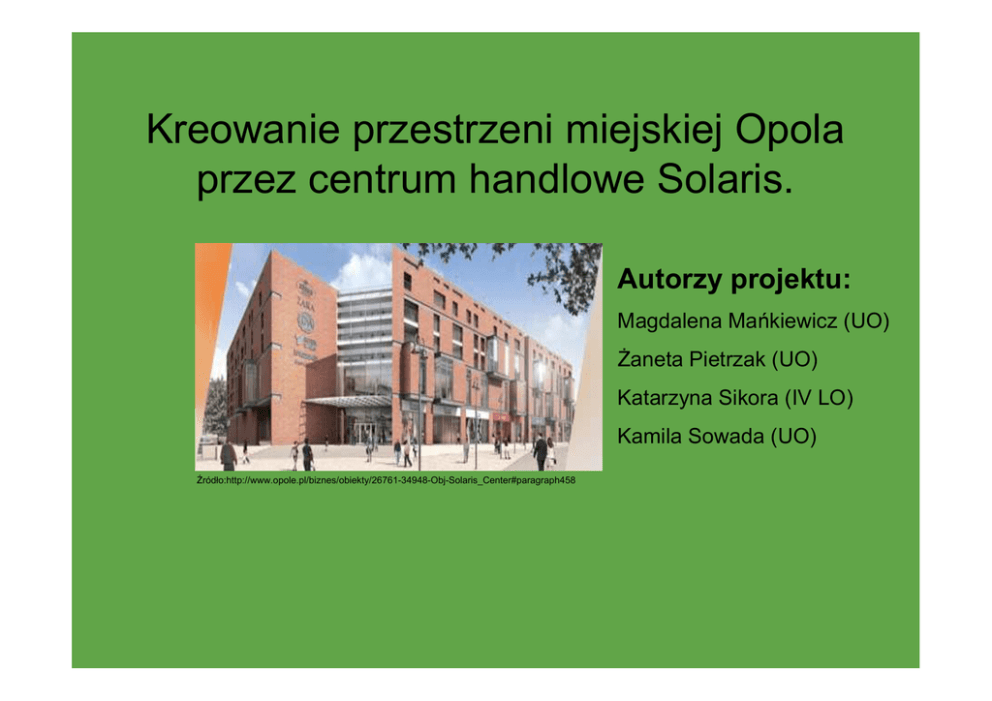 Kreowanie przestrzeni miejskiej Opola przez centrum handlowe Solaris. Autorzy projektu: Magdalena Mańkiewicz (UO) Żaneta Pietrzak (UO) Katarzyna Sikora (IV LO) Kamila Sowada (UO) Źródło:http://www.opole.pl/biznes/obiekty/26761-34948-Obj-Solaris_Center#paragraph458 Centrum handlowe w perspektywie socjologicznej. W dobie współczesności coraz częściej zauważa się wpływ przestrzeni publicznej na prywatną. Rafał Drozdowski posługując się pojęciem jurydyzacji Jurgena Habermasa spostrzega ją, jako wehikuł służący kolonizowaniu sfery prywatnej przez system (R.Drozdowski 2004). Naomi Klein natomiast wspomina o „ometkowaniu prywatności” rozumiejąc przez to fakt, że już nie tylko system polityczny zawłaszcza sferę prywatną, ale także coraz częściej czyni to sfera ekonomii poprzez „ekonomię konsumpcji”, która wykorzystuje brak semantycznej kontroli nad sferą prywatną (R.Drozdowski 2004). Labele handlowe pełnią dziś funkcje, znaki dla jednostek najbardziej ich potrzebujących, dla tych które nie są chronione przez swoje habitusy. Coraz częściej także centra handlowe traktowane są jako instytucje społeczne, których celem jest zaspokojenie potrzeb potencjalnych konsumentów. Swoją architekturą, wyposażeniem (fontanny, które mają pełnić funkcje uzdrowicielskie), znajdujące się tam centra rozrywki (place, miejsca zabaw dla dzieci), restauracje, kawiarnie itp.. mają przyciągać uwagę jednostek, które aby osiągnąć lub zachować odpowiedni status społeczny muszą posiąść odpowiednią liczbę dóbr, które będą o niej świadczyć.(G. Makowski 2007) Rys historyczny galerii Solaris Center. Galeria Solaris Center charakteryzuje się architekturą, która łączy elementy nowoczesnej przestrzeni miejskiej, z bogatą ofertą handlową. Na jej terenie można skorzystać z 86 sklepów, restauracji oraz kawiarni. Różnorodność oferowanych przez galerię usług pozwala na zaspokojenie potrzeb ludzi w różnych przedziałach wiekowych oraz pochodzących z różnych warstw społecznych. Miejsce, w którym obecnie znajduje się galeria Solaris Center ma bogatą historię: „Już o 1860 roku na znajdującej się górze wapiennej oraz winnicach, został wzniesiony browar Pringsheima. Choć w kolejnych latach zmieniali się właściciele browaru firma działała do drugiej wojny światowej. Później browar przestał istnieć, a pozostałe budynki i tereny wykorzystywano na magazyny, sklepy i parkingi”. Galeria funkcjonuje od marca 2009 roku. (http://www.solariscenter.pl/strona.php) Obserwacja galerii handlowej Solaris. • Zespół badawczy został podzielony na dwa podzespoły po dwie osoby. • Obserwacje przeprowadzono w dniach: od piątku do poniedziałku (22.10.2010 - 25.10.2010) w godzinach popołudniowych. • Podczas obserwacji zostały przeprowadzone wywiady z klientami galerii. • Obserwacja została wzbogacona o fotografie elementów przestrzeni miejskiej oraz analogicznych elementów Galerii Solaris. Wnioski z przeprowadzonej obserwacji. • • • Nasze obserwacje pokazały, że Galeria Soalris najbardziej oblegana jest w piątek. Wśród klientów dominowały kobiety. Można było zauważyć zróżnicowanie wiekowe w zależności od pory dnia. Do godziny 15.00 dominowała młodzież szkolna, która grupowo przechadzała się po galerii. Niewielka jej część robiła zakupy. W godzinach popołudniowych częstszymi jej klientami były osoby starsze, chodzące pojedynczo bądź w parach. Osoby te w większości robiły zakupy spożywcze. Ponadto o godzinie 16.30 na poziomie -1, gdzie znajduje się plac zabaw dla dzieci zgromadziło się wiele rodzin ponieważ Galeria Solaris organizuje tam czytanie bajek dzieciom przez aktorów opolskiego teatru im. Jana Kochanowskiego. W weekend można było zaobserwować stosunkowo mniejszą liczbę klientów w porównaniu z piątkiem. Jedynie w miejscach takich jak kawiarnie, restauracje, sklep spożywczy, punkty usługowe (fryzjer, pralnia itp.) utrzymywała się duża liczba konsumentów. Zauważono również większą liczbę osób chodzących pojedynczo, bądź par z dziećmi. Ponadto podczas weekendu nie było dużych grup koleżeńskich, natomiast zaobserwowano pracujące tam hostessy. Ciekawym aspektem była duża ilość osób spoza Opola oraz obcokrajowców. Poniedziałek to dzień, w którym zaobserwowano najmniejszą częstotliwość klientów odwiedzających galerię. Biorąc pod uwagę udział grup wiekowych jest on podobny do obserwacji piątkowej. Wnioski z przeprowadzonych wywiadów indywidualnych. • • • • • Przeprowadzono 10 wywiadów z klientami galerii Solaris. Klienci odwiedzają galerię z różną częstotliwością - Respondent 1: „Ogólnie rzadko bo jestem z Otmuchowa więc nie jest mi po drodze.” Respondent 2: „Jesteśmy tutaj codziennie, bo mamy do tego miejsca sentyment”. Cel odwiedzin galerii przede wszystkim wiąże się z zakupami - Respondent 3: „Dzisiaj akurat przyszłam kupić kurtkę na zimę .. a przy okazji kupiłam sobie sweter”, Respondent 4: „Robię tutaj zakupy spożywcze w Almie, lubię tu owoce.” Kliencie odwiedzają galerię przede wszystkim popołudniami. Pogoda nie ma dla nich większego znaczenia ponieważ odwiedziny galerii uzależnione są od potrzeby konsumenckiej - Respondent 5: „Galerię odwiedzamy w weekendy. Jak jest potrzeba jedziemy bez względu na pogodę”. Pojawiają się również osoby, które uzależniają odwiedziny galerii od pogody Respondent 6: „Najczęściej są to przerwy między wykładami. Studiuję i mam nie kiedy bardzo długie przerwy w zajęciach. Lubię posiedzieć w ciepłym w tak brzydką i zimną pogodę”. Z wywiadów jednoznacznie wynika, że respondenci traktują galerię jako miejsce do spędzania wolnego czasu, ale nie zrezygnowaliby na jej rzecz z dotychczasowych form wypoczynku. • Najważniejsze pytanie dla naszych badań dotyczyło tego czy galeria handlowa przypomina kli