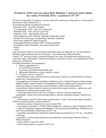 Protokół nr XXXI sesji zwyczajnej Rady Miejskiej w Jastrowiu, która odbyła się w dniu 25 kwietnia 2013r. w godzinach 1600-1820 W sesji uczestniczyło 14 radnych wg listy obecności stanowiącej załącznik nr 1 do protokołu (nieobecny radny Prokopowicz ) W posiedzeniu Rady uczestniczyli równieŜ: -Burmistrz GiM – Pan Piotr Wojtiuk - Z-ca Burmistrza GiM – Pan Jerzy Klimczak - Skarbnik GiM – Pani Teresa CzyŜewska - Sekretarz GiM – Pani Renata Szewczyk - Przewodnicząca Rady Powiatu- Jadwiga Harbuzińks-Turek - Dyrektor Powiatowego Zarządu Dróg- Mirosław Jaskółski - kierownicy jednostek organizacyjnych - Komendant Miejsko-Gminny OSP- Andrzej Kacprzak - Komendant StraŜy Miejskiej – Karolina Wiśniewska - sołtysi - prasa Listy obecności sołtysów i kierowników jednostek stanowią załącznik 1a i 1b do protokołu. Obradom przewodniczył Pan Jan Przybylski – Przewodniczący Rady Miejskiej. O godz. 1600 otworzył obrady, powitał zebranych, po czym stwierdził prawomocność sesji i powołał radną Aleksandrę Ciołek-Kruszyńską na sekretarza obrad a na protokolanta Panią Katarzynę Jędrzejczak. Porządek przedstawia się następująco: 1. Sprawy regulaminowe: a) stwierdzenie kworum b) przyjęcie protokołu poprzedniej sesji 2. Informacja Burmistrza o pracy między sesjami 3. Przyjęcie uchwał w sprawie: - zatwierdzenia oceny zasobów pomocy społecznej w oparciu o analizę lokalnej sytuacji społecznej i demograficznej - przystąpienie do realizacji projektów konkursowych w ramach Programu Operacyjnego Kapitał Ludzki, finansowanych z Europejskich Funduszy Społecznych mających na celu promocję integracji społecznej, przeciwdziałanie wykluczeniu społecznemu i wzmocnienie sektora ekonomii społecznej oraz aktywizację zawodową i społeczną osób zagroŜonych wykluczeniem społecznym. - zasad udzielania dotacji celowej na zadania z zakresu ochrony środowiska i gospodarki wodnej oraz trybu postępowania w sprawie udzielania dotacji i sposobu jej rozliczania - zatwierdzenia taryf dla zbiorowego zaopatrzenia w wodę i zbiorowego odprowadzania ścieków na terenie gminy i miasta Jastrowie. - udzielenia pomocy finansowej na rzecz Gminy Piła - zmieniająca Uchwałę Nr 179/2012 Rady Miejskiej w Jastrowiu z dnia 28 grudnia 2012r. w sprawie Gminnego Programu Profilaktyki i Rozwiązywania Problemów Alkoholowych oraz Przeciwdziałania Narkomanii na 2013 rok. - sprzedaŜy nieruchomości gruntowej zabudowanej na podstawie art. 231 par. 1 Kodeksu cywilnego - sprzedaŜy w trybie bezprzetargowym nieruchomości stanowiącej własność Gminy i Miasta Jastrowie - zmiany WPF na lata 2013-2023 - zmian budŜetu gminy i miasta na 2013 rok 1 - zaciągnięcia w roku 2013 kredytu długoterminowego na finansowanie planowanego deficytu budŜetu - zaciągnięcia w 2013 roku poŜyczki z Narodowego Funduszu Ochrony Środowiska i Gospodarki Wodnej na finansowanie przedsięwzięcia w ramach Programu Priorytetowego 5.3 Systemu Zielonych Inwestycji (GIS) PN. „Działania energooszczędne realizowane w budynkach znajdujących się na terenie Powiatu Złotowskiego” 4. Interpelacje i zapytania 5. Sprawy bieŜące i wolne wnioski. Ad. 2 Pan Burmistrz i Przewodnicząca Rady Powiatu Jadwiga Harbuzińska-Turek wręczyli Godła Promocyjne Złoty Herb 2012 w kategorii: AGROBIZNES - Gospodarstwo Rolne Andrzej Dyczkowski, Sypniewo- za dynamiczny rozwój rolnictwa, specjalizującego się w produkcji roślinnej oraz sprzedaŜy produktów ogrodniczych i świadczenia usług rolniczych na wysokim poziomie. USŁUGI MAŁE WyróŜnienie: - Restauracja Folklor Jastrowie - za wysoką jakość usług gastronomicznych, specjalizujących się w kuchni regionalnej oraz profesjonalną obsługę klientów. oraz poinformowali, Ŝe w kategorii USŁUGI DUśE nagrodę otrzymał: - PALTECH Sp. z o.o. Jastrowie - za wysoki standard i kompleksowość usług w zakresie budowy, modernizacji, wyposaŜenia i obsługi serwisowej stacji paliw i stacji autogazu oraz stały i dynamiczny rozwój firmy. Następnie Burmistrz przedstawił informację o swojej pracy między sesjami (zał nr 2). Powiedział o projekcie jaki w najbliŜszym czasie gmina będzie realizować z Programu Operacyjnego Kapitał Ludzki, który dotyczy wyrównania szans edukacyjnych. Obowiązkowo realizowane jest nauczanie początkowe dzieci 5 i 6 letnich a jest problem z miejscami dla dzieci 3 i 4 letnich. Projekt miałby na celu utworzenie oddziału przedszkolnego dla 25 dzieci 3 i 4 letnich i finansowany byłby przez 2 lata a później przez kolejne 2 lata obowiązek prowadzenia oddziału musiałaby ponieść gmina. Koszt całego projektu to 930tys. w tym nasz wkład 15% tj. 139,5tys.W tym wkładzie gmina liczy koszty udostępnienia sali z zapleczem socjalnym, koszt utrzymania budynku, część obsługi personelu technicznego oraz wkład gotówkowy w kwocie 16,3tys. Przedszkole dysponuje pomieszczeniem, w którym moŜnaby otworzyć nowy oddział. Następnie Burmistrz wymienił co moŜna jeszcze sfinansować z tego projektu. Nasza gmina jest na poz. 12 listy rankingowej gmin, które mają szansę otrzymać dofinansowanie. Tych gmin jest 68. Jest to projekt konkursowy i trzeba czekać na rozstrzygniecie. Następnie Burmistrz zaproponował aby poruszyć temat dróg poniewaŜ na sesji obecny jest Dyrektor PZD. Jako pierwsza głos zabrała Przewodnicząca Komisji Porządku Publicznego, Gospodarki Gminnej i Ochrony Środowiska informując, Ŝe w dniu dzisiejszym komisja odbyła wyjazdowe posiedzenie, na którym zapoznała się w terenie ze stanem dróg powiatowych i gminnych po zimie. Widać, Ŝe prace naprawcze są prowadzone, dziury są łatane i rowy są sprzątane, jest wycinanie krzewów. Są zastrzeŜenia do prac ubiegłorocznych poniewaŜ pozostawiono gałęzie po wycięciu. Największą troską Komisji jest droga do Sypniewka, odcinek około 2km. Członkowie komisji dyskutowali nad rozwiązaniem problemu tej drogi i mają nadzieję, Ŝe wspólnie 