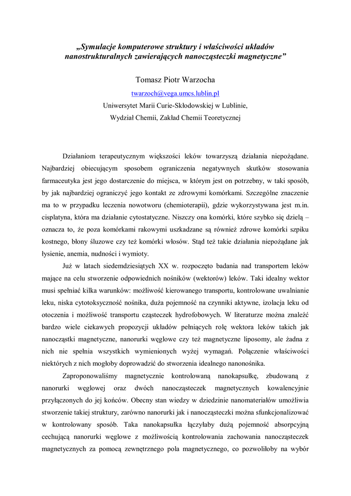 „Symulacje komputerowe struktury i właściwości układów nanostrukturalnych zawierających nanocząsteczki magnetyczne” Tomasz Piotr Warzocha [email protected] Uniwersytet Marii Curie-Skłodowskiej w Lublinie, Wydział Chemii, Zakład Chemii Teoretycznej Działaniom terapeutycznym większości leków towarzyszą działania niepożądane. Najbardziej obiecującym sposobem ograniczenia negatywnych skutków stosowania farmaceutyka jest jego dostarczenie do miejsca, w którym jest on potrzebny, w taki sposób, by jak najbardziej ograniczyć jego kontakt ze zdrowymi komórkami. Szczególne znaczenie ma to w przypadku leczenia nowotworu (chemioterapii), gdzie wykorzystywana jest m.in. cisplatyna, która ma działanie cytostatyczne. Niszczy ona komórki, które szybko się dzielą – oznacza to, że poza komórkami rakowymi uszkadzane są również zdrowe komórki szpiku kostnego, błony śluzowe czy też komórki włosów. Stąd też takie działania niepożądane jak łysienie, anemia, nudności i wymioty. Już w latach siedemdziesiątych XX w. rozpoczęto badania nad transportem leków mające na celu stworzenie odpowiednich nośników (wektorów) leków. Taki idealny wektor musi spełniać kilka warunków: możliwość kierowanego transportu, kontrolowane uwalnianie leku, niska cytotoksyczność nośnika, duża pojemność na czynniki aktywne, izolacja leku od otoczenia i możliwość transportu cząsteczek hydrofobowych. W literaturze można znaleźć bardzo wiele ciekawych propozycji układów pełniących rolę wektora leków takich jak nanocząstki magnetyczne, nanorurki węglowe czy też magnetyczne liposomy, ale żadna z nich nie spełnia wszystkich wymienionych wyżej wymagań. Połączenie właściwości niektórych z nich mogłoby doprowadzić do stworzenia idealnego nanonośnika. Zaproponowaliśmy nanorurki węglowej magnetycznie oraz dwóch kontrolowaną nanocząsteczek nanokapsułkę, magnetycznych zbudowaną z kowalencyjnie przyłączonych do jej końców. Obecny stan wiedzy w dziedzinie nanomateriałów umożliwia stworzenie takiej struktury, zarówno nanorurki jak i nanocząsteczki można sfunkcjonalizować w kontrolowany sposób. Taka nanokapsułka łączyłaby dużą pojemność absorpcyjną cechującą nanorurki węglowe z możliwością kontrolowania zachowania nanocząsteczek magnetycznych za pomocą zewnętrznego pola magnetycznego, co pozwoliłoby na wybór miejsca akumulacji nośników leku a następnie kontrolowane uwalnianie substancji terapeutycznych. Rozpoczęte badania mają na celu optymalizację struktury takiego nanopojemnika oraz określenie warunków, w których dochodzi do otwarcia/zamknięcia struktury. Stosowanie do tego celu metod symulacji komputerowych pozwala na dokonanie tego bez konieczności kosztownej i czasochłonnej syntezy zaproponowanego wektora. Zoptymalizowanie struktury nanokapsułki pozwoli na zaproponowanie drogi jej syntezy bez angażowania dużych kosztów. Co więcej, wiedza o jej zachowaniu w różnych warunkach pozwoli na przewidzenie jej stosowalności jako nośnika odpowiednich farmaceutyków w leczeniu konkretnych schorzeń. W tym momencie najbardziej obiecujące wydaje się być zastosowanie takiego nośnika w terapii antynowotworowej, gdyż stosowane tam substancje stanowią poważne zagrożenie dla reszty organizmu. Ale również inne schorzenia, gdzie istotne jest dostarczenie leku do konkretnego miejsca, mogą być efektywniej leczone, dzięki ograniczeniu efektów niepożądanych oraz zmniejszeniu dawek lekarstwa przez zastosowanie takiego nośnika leków jak ten, którego badaniu poświęcona jest moja praca doktorska.