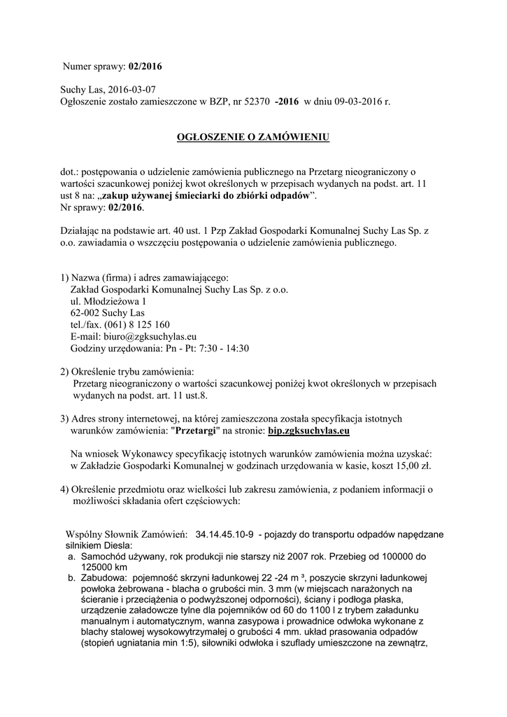 Numer sprawy: 02/2016 Suchy Las, 2016-03-07 Ogłoszenie zostało zamieszczone w BZP, nr 52370 -2016 w dniu 09-03-2016 r. OGŁOSZENIE O ZAMÓWIENIU dot.: postępowania o udzielenie zamówienia publicznego na Przetarg nieograniczony o wartości szacunkowej poniżej kwot określonych w przepisach wydanych na podst. art. 11 ust 8 na: „zakup używanej śmieciarki do zbiórki odpadów”. Nr sprawy: 02/2016. Działając na podstawie art. 40 ust. 1 Pzp Zakład Gospodarki Komunalnej Suchy Las Sp. z o.o. zawiadamia o wszczęciu postępowania o udzielenie zamówienia publicznego. 1) Nazwa (firma) i adres zamawiającego: Zakład Gospodarki Komunalnej Suchy Las Sp. z o.o. ul. Młodzieżowa 1 62-002 Suchy Las tel./fax. (061) 8 125 160 E-mail: [email protected] Godziny urzędowania: Pn - Pt: 7:30 - 14:30 2) Określenie trybu zamówienia: Przetarg nieograniczony o wartości szacunkowej poniżej kwot określonych w przepisach wydanych na podst. art. 11 ust.8. 3) Adres strony internetowej, na której zamieszczona została specyfikacja istotnych warunków zamówienia: "Przetargi" na stronie: bip.zgksuchylas.eu Na wniosek Wykonawcy specyfikację istotnych warunków zamówienia można uzyskać: w Zakładzie Gospodarki Komunalnej w godzinach urzędowania w kasie, koszt 15,00 zł. 4) Określenie przedmiotu oraz wielkości lub zakresu zamówienia, z podaniem informacji o możliwości składania ofert częściowych: Wspólny Słownik Zamówień: 34.14.45.10-9 - pojazdy do transportu odpadów napędzane silnikiem Diesla: a. Samochód używany, rok produkcji nie starszy niż 2007 rok. Przebieg od 100000 do 125000 km b. Zabudowa: pojemność skrzyni ładunkowej 22 -24 m ³, poszycie skrzyni ładunkowej powłoka żebrowana - blacha o grubości min. 3 mm (w miejscach narażonych na ścieranie i przeciążenia o podwyższonej odporności), ściany i podłoga płaska, urządzenie załadowcze tylne dla pojemników od 60 do 1100 l z trybem załadunku manualnym i automatycznym, wanna zasypowa i prowadnice odwłoka wykonane z blachy stalowej wysokowytrzymałej o grubości 4 mm. układ prasowania odpadów (stopień ugniatania min 1:5), siłowniki odwłoka i szuflady umieszczone na zewnątrz, centralny układ smarowania, 2 stopnie uchylne, oświetlenie i oznakowanie zgodne z obowiązującymi przepisami ruchu drogowego. c. Podwozie trzyosiowe 6x2, ostatnia oś skrętna podnoszona, dopuszczalna masa całkowita 24000 kg – 28000 kg, kabina krótka (dzienna) 3-osobowa w kolorze pomarańczowym RAL 2011, silnik o mocy 225 – 245 kW, skrzynia biegów automatyczna, przednie zawieszenie na resorach, tylne zawieszenie pneumatyczne, ogumienie 315/80 R 22,5,rozstaw osi 1-2, 415-425 cm. 4. Dodatkowe wymagania: Śmieciarka dostarczana będzie do siedziby ZGK w Suchym Lesie. Zamawiający nie przewiduje możliwości składania ofert częściowych. Zamawiający nie przewiduje zamówień uzupełniających. Słownictwo główne Główny przedmiot Dodatkowe przedmioty Słownictwo uzupełniające (jeśli dotyczy) 34.14.45.10-9 5) Informacja o możliwości złożenia oferty wariantowej: Zamawiający nie dopuszcza składania ofert wariantowych 6) Termin wykonania zamówienia: Do 12.04.2016 r. 7) Opis warunków udziału w postępowaniu oraz opis sposobu dokonywania oceny spełniania tych warunków: W przetargu mogą wziąć udział Wykonawcy, którzy nie podlegają wykluczeniu z postępowania na podstawie art. 24 ust. 1, 2 i spełniają warunki określone w art. 22 ust. 1 ustawy z dnia 29 stycznia 2004 r. – Prawo zamówień publicznych (Dz.U. Nr 19 poz. 177) i spełniający warunki określone w siwz. Ocena spełniania warunków udziału w postępowaniu będzie na zasadzie spełnia/nie spełnia. Najniższa oferowana cena. 8) Informacja na temat wadium: Zamawiający nie wymaga wniesienia wadium. 9) Kryteria oceny ofert i ich znaczenie: Nazwa kryterium Cena Waga 100% 10) miejsce i termin składania ofert: w siedzibie zamawiającego Zakład Gospodarki Komunalnej Suchy Las Sp. z o.o. ul. Młodzieżowa 1 62-002 Suchy Las Kasa do dnia 2016-03-16 do godz. 09:00 11) miejsce i termin otwarcia ofert: w siedzibie zamawiającego Zakład Gospodarki Komunalnej Suchy Las Sp. z o.o. ul. Młodzieżowa 1 62-002 Suchy Las Pokój nr 3 dnia 2016-03-16 o godz. 09:05. 12) termin związania ofertą Wykonawca pozostaje związany ofertą przez okres 30 dni, licząc od dnia składania ofert lub dnia podpisania umowy. 13) informacja na temat zamówień uzupełniających Zamawiający nie przewiduje zamówień uzupełniających. 14) informacje o zamiarze zawarcia umowy ramowej Brak 15) informacje o zamiarze ustanowienia dynamicznego systemu zakupów wraz z adresem strony internetowej, na której będą zamieszczane dodatkowe informacje dotyczące dynamicznego systemu zakupów Brak 16) informacje o przewidywanym wyborze najkorzystniejszej oferty z zastosowaniem aukcji elektronicznej wraz z adresem strony internetowej, na której będzie prowadzona aukcja elektroniczna Brak ____________________________________ Zakład Gospodarki Komunalnej Suchy Las Sp. z o.o