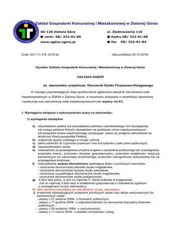 65-120 Zielona Góra ul. Zjednoczenia 110 centr. 68/ 322-91-00 Kadry 68/ 322-91-68 www.zgkim.zgora.pl fax Znak: DO.111.318 .2016 kp 68/ 322-91-84 data publikacji 20.12.2016r. Dyrektor Zakładu Gospodarki Komunalnej i Mieszkaniowej w Zielonej Górze OGŁASZA NABÓR na stanowisko urzędnicze: Kierownik Działu Finansowo-Księgowego W miesiącu poprzedzającym datę upublicznienia ogłoszenia wskaźnik zatrudnienia osób niepełnosprawnych w ZGKiM w Zielonej Górze, w rozumieniu przepisów o rehabilitacji zawodowej i społecznej oraz zatrudniania osób niepełnosprawnych jest wyższy niż 6% 1. Wymagania związane z wykonywaniem pracy na stanowisku: 1) wymagania niezbędne: a) obywatelstwo polskie lub obywatelstwo państwa członkowskiego Unii Europejskiej lub innego państwa których obywatelom na podstawie umów międzynarodowych lub przepisów prawa wspólnotowego przysługuje prawo do podjęcia zatrudnienia na terytorium Rzeczypospolitej Polskiej, b) znajomość języka polskiego w mowie i piśmie, c) pełna zdolność do czynności prawnych oraz korzystanie z pełni praw publicznych, d) nieposzlakowana opinia, e) niekaralność za przestępstwa umyślne ścigane z oskarżenia publicznego lub przestępstwa przeciwko mieniu, przeciwko obrotowi gospodarczemu, przeciwko działalności instytucji państwowych lub samorządu terytorialnego, przeciwko wiarygodności dokumentów lub za przestępstwa skarbowe, f) wykształcenie wyższe ekonomiczne spełniające jeden z poniższych warunków: - ukończone ekonomiczne jednolite studia magisterskie, - ukończone ekonomiczne wyższe studia zawodowe, - ukończone uzupełniające ekonomiczne studia magisterskie, - ukończone ekonomiczne studia podyplomowe, g) 5 letni staż pracy, w tym co najmniej 3 - letnia praktyka w księgowości (lub co najmniej 3 letni staż w działalności gospodarczej o charakterze zgodnym z wymaganiami na tym stanowisku), h) stan zdrowia pozwalający na zatrudnienie na ww. stanowisku, i) znajomość obowiązujących przepisów poniższych ustaw oraz aktów wykonawczych do wymienionych ustaw : - ustawy z 27 sierpnia 2009r. o finansach publicznych, - ustawy z 17 grudnia 2004r. o odpowiedzialności za naruszenie dyscypliny finansów publicznych, - ustawy z 29 września 1994r. o rachunkowości, - ustawy z 11 marca 2004r. o podatku od towarów i usług, - ustawy z 15 lutego 1992r. o podatku dochodowym od osób prawnych, - ustawy z 12 czerwca 2003r. o terminach zapłaty w transakcjach handlowych, - ustawy z 29 sierpnia 1997r. Ordynacja podatkowa, - ustawy z 10 września 1999r. Kodeks karny skarbowy, - ustawy z 29 stycznia 2004r. Prawo zamówień publicznych, - ustawy z 21 listopada 2008r. o pracownikach samorządowych, j) praktyczna umiejętność obsługi komputera w obszarze środowiska WINDOWS, obsługa poczty elektronicznej. 2) wymagania dodatkowe: a) b) c) d) e) f) g) h) umiejętność kierowania zespołem, komunikatywność, umiejętność interpretacji przepisów, samodzielność w pracy oraz własna inicjatywa, zdolności organizacyjne i interpersonalne, rzetelność , dokładność, terminowość w pracy, praktyczna znajomość programu finansowo-księgowego PCBIZNES PRO PRESTIŻ, wpis kandydata do rejestru biegłych rewidentów lub posiadanie przez kandydata certyfikatu księgowego /świadectwa kwalifikacyjnego księgowego uprawniającego do usługowego prowadzenia ksiąg rachunkowych. 2. Zakres zadań (czynności) wykonywanych na stanowisku Kierownika Działu Finansowo-Księgowego: 1) organizacja pracy Działu Finansowo-Księgowego, 2) bieżące i prawidłowe prowadzenie ewidencji księgowej Zakładu zgodnie z przepisami obowiązującymi dla samorządowych zakładów budżetowych, 3) nadzór nad uzgadnianiem kont syntetycznych z analityką, 4) prawidłowe, rzetelne i terminowe sporządzanie sprawozdawczości finansowej i budżetowej oraz w zakresie operacji finansowych dokonywanych w Zakładzie zgodnie z ewidencją księgową, 5) nadzór nad ewidencjonowaniem otrzymywanych przez Dział dowodów księgowych oraz nad ich obiegiem i kontrolą funkcjonującymi w Zakładzie, 6) organizowanie i nadzór inwentaryzacji majątku Zakładu oraz nadzór nad rozliczaniem różnic inwentaryzacyjnych, 7) nadzór nad gospodarką kasową Zakładu, 8) nadzór nad terminową i prawidłową windykacją należności ewidencjonowanych przez Dział, 9) nadzór nad terminowym regulowaniem zobowiązań Zakładu, 10) prawidłowe i terminowe sporządzanie deklaracji podatkowych do podatku dochodowego od osób prawnych i cząstkowych deklaracji podatku od towarów i usług, 11) nadzór nad terminowym przekazywaniem sprawozdań i deklaracji jw., 12) uaktualnianie instrukcji obowiązujących w Zakładzie w zakresie gospodarki finansowoksięgowej Zakładu, 13) nadzór nad właściwym przechowywaniem i archiwizowaniem dokumentów w Dziale, 14) zastępowanie Głównego Księgowego w czasie jego nieobecności. Warunki pracy: Warunki dotyczące charakteru pracy na stanowisku i sposobu wykonywania zadań - praca w pełnym wymiarze etatu, - praca w zespole. Miejsce i otoczenie organizacyjno-techniczne stanowiska pracy: - czynniki uciążliwe: stałe obciążenie statyczne związane z pracą siedzącą, praca przy komputerze pow. 4 godzin dziennie. - istnieją bariery architektoniczne w zakresie poruszania się po budynku – utrudniony dostęp osób niepełnosprawnych poruszających się na wózkach inwalidzkich. 3. Wymagane dokumenty i oświadczenia: 1) curriculum vitae (oryginał), 2) kwestionariusz osobowy dostępny na stronie www.zgkim.zgora.pl/druki/(oryginał), 3) kopie dokumentów potwierdzających wykształcenie, 4) w przypadku posiadania kopie certyfikatów/świadectw potwierdzających wymienione wyżej dodatkowe wymagania, 5) kopie dokumentów potwierdzających staż pracy, w tym dokumenty z których wynikać będzie staż pracy w księgowości, 6) oświadczenie o niekaralności, 7) oświadczenie o stanie zdrowia, 8) oświadczenie o wyrażeniu zg