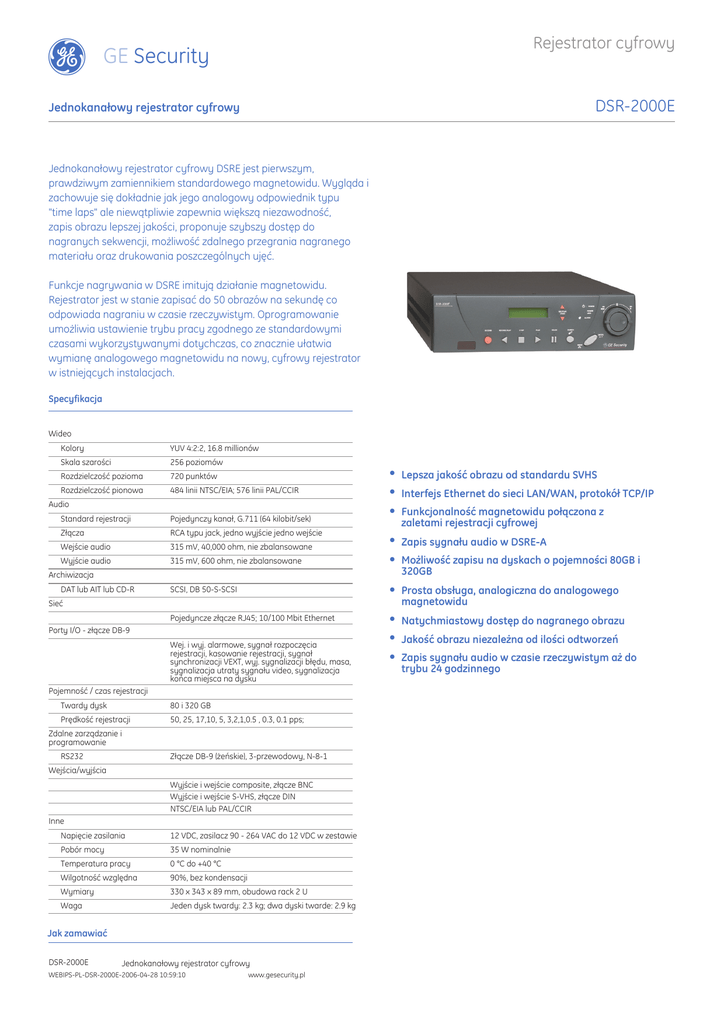 g Rejestrator cyfrowy GE Security DSR2000E Jednokana³owy rejestrator cyfrowy Jednokana³owy rejestrator cyfrowy DSRE jest pierwszym, prawdziwym zamiennikiem standardowego magnetowidu. Wygl±da i zachowuje siê dok³adnie jak jego analogowy odpowiednik typu "time laps" ale niew±tpliwie zapewnia wiêksz± niezawodno¶æ, zapis obrazu lepszej jako¶ci, proponuje szybszy dostêp do nagranych sekwencji, mo¿liwo¶æ zdalnego przegrania nagranego materia³u oraz drukowania poszczególnych ujêæ. Funkcje nagrywania w DSRE imituj± dzia³anie magnetowidu. Rejestrator jest w stanie zapisaæ do 50 obrazów na sekundê co odpowiada nagraniu w czasie rzeczywistym. Oprogramowanie umo¿liwia ustawienie trybu pracy zgodnego ze standardowymi czasami wykorzystywanymi dotychczas, co znacznie u³atwia wymianê analogowego magnetowidu na nowy, cyfrowy rejestrator w istniej±cych instalacjach. Specyfikacja Wideo Kolory YUV 4:2:2, 16.8 millionów Skala szaro¶ci 256 poziomów Rozdzielczo¶æ pozioma 720 punktów Rozdzielczo¶æ pionowa 484 linii NTSC/EIA; 576 linii PAL/CCIR Audio Standard rejestracji Pojedynczy kana³, G.711 (64 kilobit/sek) Z³±cza RCA typu jack, jedno wyj¶cie jedno wej¶cie Wej¶cie audio 315 mV, 40,000 ohm, nie zbalansowane Wyj¶cie audio 315 mV, 600 ohm, nie zbalansowane E Funkcjonalno¶æ magnetowidu po³±czona z zaletami rejestracji cyfrowej E Zapis sygna³u audio w DSREA E Mo¿liwo¶æ zapisu na dyskach o pojemno¶ci 80GB i 320GB Archiwizacja DAT lub AIT lub CDR SCSI, DB 50SSCSI E Prosta obs³uga, analogiczna do analogowego magnetowidu Sieæ Pojedyncze z³±cze RJ45; 10/100 Mbit Ethernet Porty I/O  z³±cze DB9 Wej. i wyj. alarmowe, sygna³ rozpoczêcia rejestracji, kasowanie rejestracji, sygna³ synchronizacji VEXT, wyj. sygnalizacji b³êdu, masa, sygnalizacja utraty sygna³u video, sygnalizacja koñca miejsca na dysku Pojemno¶æ / czas rejestracji Twardy dysk 80 i 320 GB Prêdko¶æ rejestracji 50, 25, 17,10, 5, 3,2,1,0.5 , 0.3, 0.1 pps; Zdalne zarz±dzanie i programowanie RS232 Z³±cze DB9 (¿eñskie), 3przewodowy, N81 Wej¶cia/wyj¶cia Wyj¶cie i wej¶cie composite, z³±cze BNC Wyj¶cie i wej¶cie SVHS, z³±cze DIN NTSC/EIA lub PAL/CCIR Inne Napiêcie zasilania 12 VDC, zasilacz 90  264 VAC do 12 VDC w zestawie Pobór mocy 35 W nominalnie Temperatura pracy 0 °C do +40 °C Wilgotno¶æ wzglêdna 90%, bez kondensacji Wymiary 330 x 343 x 89 mm, obudowa rack 2 U Waga Jeden dysk twardy: 2.3 kg; dwa dyski twarde: 2.9 kg Jak zamawiaæ DSR2000E E Lepsza jako¶æ obrazu od standardu SVHS E Interfejs Ethernet do sieci LAN/WAN, protokó³ TCP/IP Jednokana³owy rejestrator cyfrowy WEBIPSPLDSR2000E20060428 10:59:10 www.gesecurity.pl E Natychmiastowy dostêp do nagranego obrazu E Jako¶æ obrazu niezale¿na od ilo¶ci odtworzeñ E Zapis sygna³u audio w czasie rzeczywistym a¿ do trybu 24 godzinnego