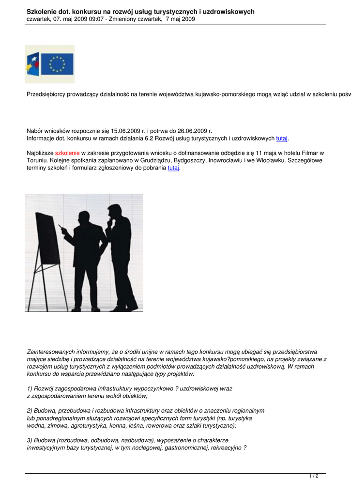 Szkolenie dot. konkursu na rozwój usług turystycznych i uzdrowiskowych czwartek, 07. maj 2009 09:07 - Zmieniony czwartek, 7 maj 2009 Przedsiębiorcy prowadzący działalność na terenie województwa kujawsko-pomorskiego mogą wziąć udział w szkoleniu pośw Nabór wniosków rozpocznie się 15.06.2009 r. i potrwa do 26.06.2009 r. Informacje dot. konkursu w ramach działania 6.2 Rozwój usług turystycznych i uzdrowiskowych tutaj. Najbliższe szkolenie w zakresie przygotowania wniosku o dofinansowanie odbędzie się 11 maja w hotelu Filmar w Toruniu. Kolejne spotkania zaplanowano w Grudziądzu, Bydgoszczy, Inowrocławiu i we Włocławku. Szczegółowe terminy szkoleń i formularz zgłoszeniowy do pobrania tutaj. Zainteresowanych informujemy, że o środki unijne w ramach tego konkursu mogą ubiegać się przedsiębiorstwa mające siedzibę i prowadzące działalność na terenie województwa kujawsko?pomorskiego, na projekty związane z rozwojem usług turystycznych z wyłączeniem podmiotów prowadzących działalność uzdrowiskową. W ramach konkursu do wsparcia przewidziano następujące typy projektów: 1) Rozwój zagospodarowa infrastruktury wypoczynkowo ? uzdrowiskowej wraz z zagospodarowaniem terenu wokół obiektów; 2) Budowa, przebudowa i rozbudowa infrastruktury oraz obiektów o znaczeniu regionalnym lub ponadregionalnym służących rozwojowi specyficznych form turystyki (np. turystyka wodna, zimowa, agroturystyka, konna, leśna, rowerowa oraz szlaki turystyczne); 3) Budowa (rozbudowa, odbudowa, nadbudowa), wyposażenie o charakterze inwestycyjnym bazy turystycznej, w tym noclegowej, gastronomicznej, rekreacyjno ? 1/2 Szkolenie dot. konkursu na rozwój usług turystycznych i uzdrowiskowych czwartek, 07. maj 2009 09:07 - Zmieniony czwartek, 7 maj 2009 sportowej; 4) Dostosowanie istniejącej infrastruktury obiektów turystycznych i rekreacyjno ? sportowych do potrzeb osób niepełnosprawnych, tylko w przypadku realizacji projektów wymienionych w pkt. 1?3; 5) Opracowanie, rozwój i promocja produktów turystycznych, uzdrowiskowych i tradycyjnych; 6) Integracja i rozbudowa regionalnego systemu informacji turystycznej (poprzez rozwój Regionalnej Organizacji Turystycznej oraz tworzenie i rozwój Lokalnych Organizacji Turystycznych zajmujących się m.in. promocją i informacją turystyczną) oraz jednolitego, ogólnopolskiego systemu informacji turystycznej w tym rozwój systemów informacyjnych, uruchamianie infokiosków i innych nowoczesnych rozwiązań, rozszerzenie oferty wydawnictw informacyjnych i promocyjnych; 7) Organizacja kampanii reklamowych promujących walory turystyczne województwa w kraju i poza jego granicami ściśle w powiązaniu z projektami wymienionymi w pkt.1 -3. 2/2