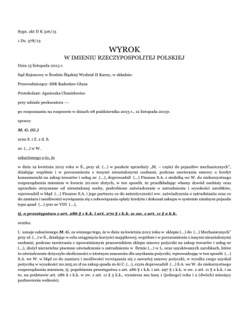 Sygn. akt II K 316/13 1 Ds. 378/13 WYROK W IMIENIU RZECZYPOSPOLITEJ POLSKIEJ Dnia 15 listopada 2013 r. Sąd Rejonowy w Środzie Śląskiej Wydział II Karny, w składzie: Przewodniczący: SSR Radosław Gluza Protokolant: Agnieszka Chmielowiec przy udziale prokuratora --po rozpoznaniu na rozprawie w dniach 08 października 2013 r., 12 listopada 2013r. sprawy M. G. (G.) syna S. i Z. z d. S. ur. (...) w W. oskarżonego o to, że w dniu 19 kwietnia 2012 roku w Ś., przy ul. (...) w punkcie sprzedaży „M. – części do pojazdów mechanicznych”, działając wspólnie i w porozumieniu z innymi nieustalonymi osobami, podczas zawierania umowy o kredyt konsumencki na zakup towarów i usług nr (...), doprowadził (...) Finanse S.A. z siedzibą we W. do niekorzystnego rozporządzenia mieniem w kwocie 20.000 złotych, w ten sposób, że przedkładając własny dowód osobisty oraz uprzednio otrzymane od nieustalonej osoby, podrobione zaświadczenie o zatrudnieniu i wysokości zarobków, wprowadził w błąd (...) Finanse S.A. i jego partnera co do autentyczności ww. zaświadczenia o zatrudnianiu oraz co do zamiaru i możliwości wywiązania się z zobowiązania spłaty kredytu i dokonał zakupu w systemie ratalnym pojazdu typu quad (...) 500 nr VIN (...), tj. o przestępstwo z art. 286 § 1 k.k. i art. 270 § 1 k.k. w zw. z art. 11 § 2 k.k. orzeka: I. uznaje oskarżonego M. G. za winnego tego, że w dniu 19 kwietnia 2012 roku w sklepie (...) do (...) Mechanicznych” przy ul. (...) w Ś., działając w celu osiągnięcia korzyści majątkowej, wspólnie i w porozumieniu z innymi nieustalonymi osobami, podczas zawierania z upoważnionym pracownikiem sklepu umowy pożyczki na zakup towarów i usług nr (...), złożył nierzetelne pisemne oświadczenie o zatrudnieniu w firmie (...) w L. oraz uzyskiwanych zarobkach, które to oświadczenie dotyczyło okoliczności o istotnym znaczeniu dla uzyskania pożyczki, wprowadzając w ten sposób (...) S.A. we W. w błąd co do zamiaru i możliwości wywiązania się z zawartej umowy pożyczki, w wyniku czego uzyskał pożyczkę w wysokości 20.205,10 zł na zakup quada m-ki C. (...), czym doprowadził (...) S.A. we W. do niekorzystnego rozporządzenia mieniem, tj. popełnienia przestępstwa z art. 286 § 1 k.k. i art. 297 § 1 k.k. w zw. z art. 11 § 2 k.k. i za to, na podstawie art. 286 § 1 k.k. w zw. z art. 11 § 3 k.k., wymierza mu karę 1 (jednego) roku i 2 (dwóch) miesięcy pozbawienia wolności; II. na podstawie art. 69 § 1 i § 2 k.k. oraz art. 70 § 1 pkt. 1 k.k. warunkowo zawiesza oskarżonemu wykonanie wymierzonej mu kary pozbawienia wolności na okres 3 (trzech) lat próby; III. na podstawie art. 46 § 1 k.k. orzeka wobec oskarżonego M. G. środek karny w postaci obowiązku naprawienia szkody wyrządzonej przestępstwem, poprzez zapłatę na rzecz (...) S.A. we W. kwoty 20.205,10 zł (dwadzieścia tysięcy dwieście pięć złotych dziesięć groszy); IV. na podstawie art. 230 § 2 k.p.k. zwraca (...) S.A. we W. dowód rzeczowy w postaci umowy o kredyt konsumencki na zakup towarów i usług nr (...), ujęty w wykazie dowodów rzeczowych Nr 1/129/13 pod poz. 1 , przechowywany w aktach sprawy, na k. 19; V. na podstawie art. 230 § 2 k.p.k. zwraca B. M. dowód rzeczowy w postaci protokołu przekazania pojazdu (...) 500 z dnia 19.04.2013r., ujęty w wykazie dowodów rzeczowych Nr I/129/13 pod poz. 2, k. 119 a.s., przechowywany w aktach sprawy, na k. 64; VI. na podstawie art. 230 § 2 k.p.k. zwraca M. B. dowód rzeczowy w postaci faktury VAT nr (...) z dnia 25.04.2012r., ujęty w wykazie dowodów rzeczowych Nr I/129/13 pod poz. 3, k. 119 a.s., przechowywany w aktach sprawy, na k. 68; VII. na podstawie art. 624 § 1 k.p.k. i art. 17 ust. 1 ustawy z dnia 23 czerwca 1973r. o opłatach w sprawach karnych zwalnia oskarżonego od ponoszenia kosztów sądowych w tym opłaty, zaliczając je na rachunek Skarbu Państwa. . UZASADNIENIE WYROKU Na podstawie przeprowadzonego przewodu sądowego ustalono następujący stan faktyczny: Oskarżony M. G. zamieszkuje w B.. Nie ma stałej pracy, trudni się słabo płatnymi pracami dorywczymi. Dowód: częściowo wyjaśnienia oskarżonego M. G. k. 102-103. W dniu 19 kwietnia 2012r. M. G. stał przy bramie wjazdowej na terenie byłego PGR w B. wraz z A. M. oraz innymi osobami. W pewnej chwili do stojących osób podjechał samochód. Będąca w pojeździe młoda kobieta przez uchyloną powiedziała obecnym, że jest do wykonania praca – sprzątanie na budowie. Ofertą kobiety zainteresował się M. G., który podejmował się tego typu prac dorywczych. Oskarżony wsiadł do samochodu i odjechał wraz z kobietą i towarzyszącym jej mężczyzną. Dowód: częściowo wyjaśnienia oskarżonego M. G. k. 102-103, zeznania świadka A. M. k. 37, zeznania świadka A. G. k. 38. M. G., po rozmowie z kobietą, zgodził się dokonać dla niej zakupu w systemie sprzedaży ratalnej, za co miał otrzymać kwotę 400 zł. W związku z powyższym udał się wraz kobietą i mężczyzną, na ulicę (...) w Ś. gdzie mieści się sklep motoryzacyjny „M. Części do (...) Mechanicznych”. Wcześniej otrzymał od nich wypisane na jego dane zaświadczenie o zatrudnieniu i zarobkach osiąganych w firmie (...) z siedzibą w L., w której w rzeczywistości nigdy nie pracował. Dowód: częściowo wyjaśnienia oskarżonego M. G. k. 102-103, zeznania świadka A. G. k. 38, zeznania świadka E. Ż. k. 39. Sklep motoryzacyjny „M. Części do (...) Mechanicznych” w Ś., należy do P. M., który prowadzi działalność gospodarczą jako osoba fizyczna. P. M. ma w ofercie swojej firmy m.in. sprzedaż ratalną pojazdów. W tym zakresie kooperuje on m.in. z (...) S.A. we W. (dalej jako (...) S.A.), z którą ma zawartą umowę o współpracy w zakresie sprzedaży ratalnej towarów. P. M. oraz jego brat B. M. posiadają pełnomocnictwo (...) S.A. do zawierania umów w jej imieniu. Dowód: zeznania świadka B. M. k. 26-27, 59-60, 151-152 zezna