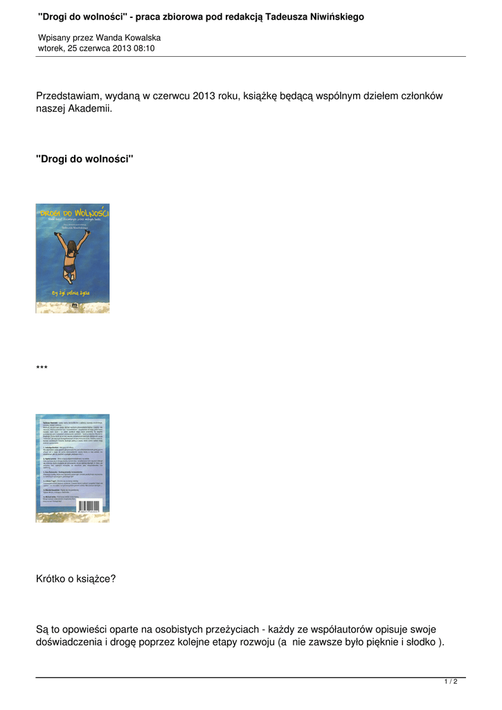 "Drogi do wolności" - praca zbiorowa pod redakcją Tadeusza Niwińskiego Wpisany przez Wanda Kowalska wtorek, 25 czerwca 2013 08:10 Przedstawiam, wydaną w czerwcu 2013 roku, książkę będącą wspólnym dziełem członków naszej Akademii. "Drogi do wolności" *** Krótko o książce? Są to opowieści oparte na osobistych przeżyciach - każdy ze współautorów opisuje swoje doświadczenia i drogę poprzez kolejne etapy rozwoju (a nie zawsze było pięknie i słodko ). 1/2 "Drogi do wolności" - praca zbiorowa pod redakcją Tadeusza Niwińskiego Wpisany przez Wanda Kowalska wtorek, 25 czerwca 2013 08:10 Różne starty, różne wybory i konsekwencje... po prostu życie :) Polecam ! 2/2