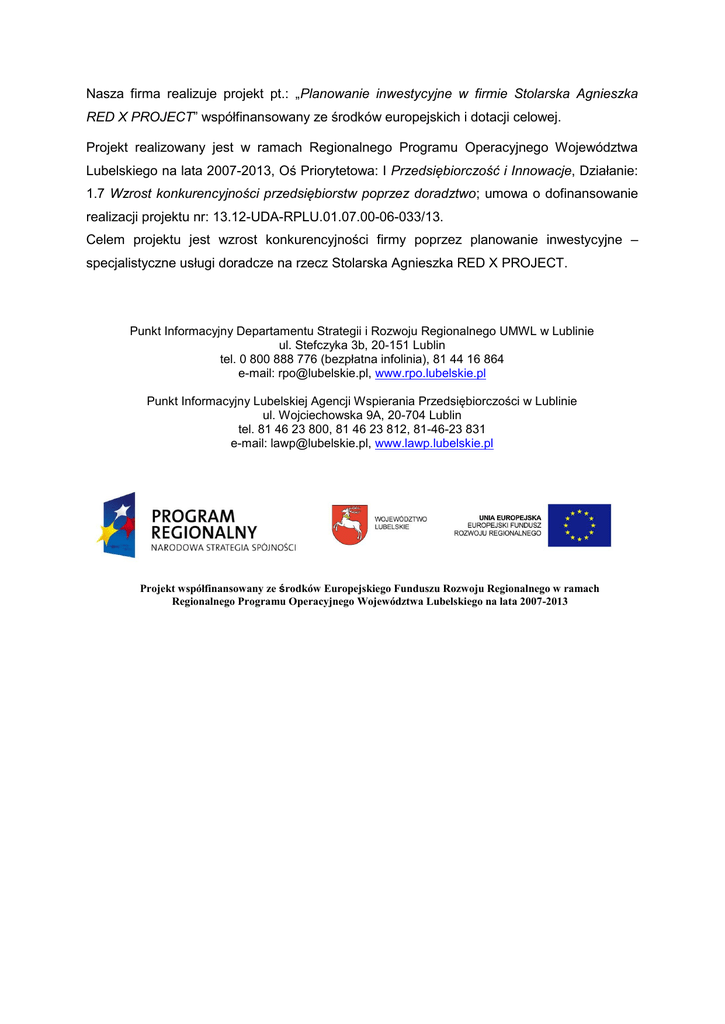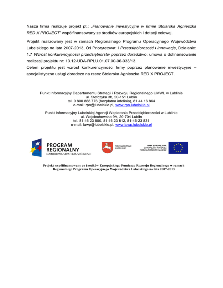 Nasza firma realizuje projekt pt.: „Planowanie inwestycyjne w firmie Stolarska Agnieszka RED X PROJECT” współfinansowany ze środków europejskich i dotacji celowej. Projekt realizowany jest w ramach Regionalnego Programu Operacyjnego Województwa Lubelskiego na lata 2007-2013, Oś Priorytetowa: I Przedsiębiorczość i Innowacje, Działanie: 1.7 Wzrost konkurencyjności przedsiębiorstw poprzez doradztwo; umowa o dofinansowanie realizacji projektu nr: 13.12-UDA-RPLU.01.07.00-06-033/13. Celem projektu jest wzrost konkurencyjności firmy poprzez planowanie inwestycyjne – specjalistyczne usługi doradcze na rzecz Stolarska Agnieszka RED X PROJECT. Punkt Informacyjny Departamentu Strategii i Rozwoju Regionalnego UMWL w Lublinie ul. Stefczyka 3b, 20-151 Lublin tel. 0 800 888 776 (bezpłatna infolinia), 81 44 16 864 e-mail: [email protected], www.rpo.lubelskie.pl Punkt Informacyjny Lubelskiej Agencji Wspierania Przedsiębiorczości w Lublinie ul. Wojciechowska 9A, 20-704 Lublin tel. 81 46 23 800, 81 46 23 812, 81-46-23 831 e-mail: [email protected], www.lawp.lubelskie.pl Projekt współfinansowany ze środków Europejskiego Funduszu Rozwoju Regionalnego w ramach Regionalnego Programu Operacyjnego Województwa Lubelskiego na lata 2007-2013