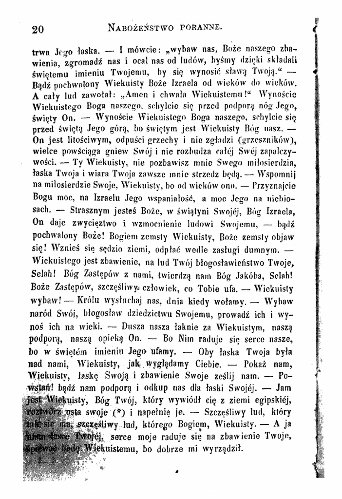 NABOZENSTWO 20 trwa Je׳׳0 laska. PORANNE. I movvcie: ״w y b a w nas, Boze naszego zba- — wienia, zgromadz nas i ocal nas od ludow, bysmy dzi«jki skladali s w i ^ t e m u ° i m i e n i u Twojemu, by SIQ wynostf slaw!! Twoj?j.— ״ B$dz pochwalony Wiekuisty Boze Izraela od wiekow do wiekow. A caly lud zawotal: ,,Amen i chwala Wiekuistemu ! a Wynoscie Wiekuistego Boga naszego, schylcie sie przed podpon! nog Jego, swi^ty On. — Wynoscie Wiekuistego Boga naszego, schylcie SIQ przed Sw'iQtf} Jego gorq, bo swi^tym jest Wiekuisty Bog nasz. — On jest lito^ciwym, odpusci grzechy i nio zgiadzi (grzesznikow), wielce powscigga gniew Swoj i nie rozhudza calej Swej zapalczywosci. — Ty Wiekuisty, nie pozbawisz mnie Swego milosierdzia, laska Twoja i wiara Twoja zawsze mnie strzedz b^dg.— Wspomnij na milosierdzie Swoje, Wiekuisty, bo od wiekow ono. — Przyznajcie Bogu moc, na Izraelu Jego wspanialosd, a moc Jego na niebio- sach. — Strasznym jestes Boze, w sw'ujtyni S wo jej, Bog Izraela, On daje zwycieztwo i wzmocnienie ludowi Swojemu, — b§dz pochwalony Boze! Bogiem zemsty Wiekuisty, Boze zemsty objaw siql Wznies sie s^dzio ziemi, odplatS wedle zaslugi dumnym. — Wiekuistego jest zbavvienie, na lud Twoj blogoslavvienstwo Tvvoje, Selah! Bog Zastepovv z nami, twierdzij nam Bog Jakoba, Selah! Boze Zastepow, szczesliwy, czlovviek, co Tobie ufa. — Wiekuisty wybaw! — K r o l u wysfuchaj nas, dnia kiedy wolamy. — Wybaw narod Swoj, blogoslaw dziedzictwu Swojemu, prowadz ich i w y nos ich na wieki. — Dusza nasza laknie za Wiekuistym, nasz!} podponj, nasz<] opiekij On. — Bo Nim raduje sie serce nasze, bo w swietem imieniu Jego ufamy. — Oby laska nad nami, Wiekuisty, Wiekuisty, laske j a k . Wyglgdamy Ciebie. — Twoja byla Pokaz nam, Swojg i zbavvienie Swoje zeslij nam. — P o - wstan! bijdz nam podporg i odkup nas dla laski S wo jej. — Jam jest Wiekuisty, Bog Twoj, ktory wyvviodl clq z ziemi egipskiej, roztworz u>ta swoje (*) i napehue je. — Szczesliwy lud, ktory ׳i a & s i e ma, szczesliwy lud, ktorego Bogiem, Wiekuisty. — t &fe& ־4&see Twpfej, A ja serce moje raduje sie na zbavvienie Tvvoje, # p i ^ w » § fc^d?. Wiekuistemu, bo dobrze mi wyrzgdzil.