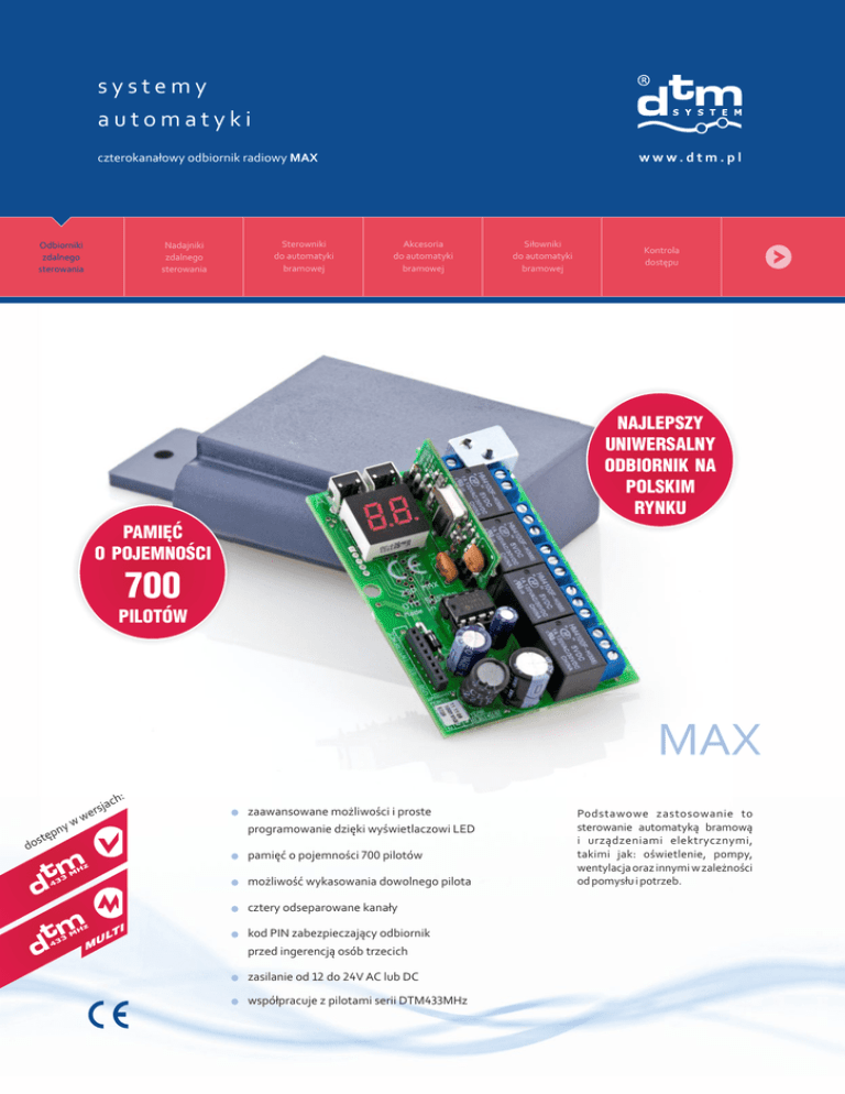 systemy automatyki www.dtm.pl czterokanałowy odbiornik radiowy MAX Odbiorniki zdalnego sterowania Nadajniki zdalnego sterowania Sterowniki do automatyki bramowej Akcesoria do automatyki bramowej Siłowniki do automatyki bramowej Kontrola dostępu NAJLEPSZY UNIWERSALNY ODBIORNIK NA POLSKIM RYNKU PAMIĘĆ O POJEMNOŚCI 700 PILOTÓW MAX ch: w zaawansowane możliwości i proste programowanie dzięki wyświetlaczowi LED p stę do w ny ja ers pamięć o pojemności 700 pilotów możliwość wykasowania dowolnego pilota cztery odseparowane kanały TI UL M kod PIN zabezpieczający odbiornik przed ingerencją osób trzecich zasilanie od 12 do 24V AC lub DC współpracuje z pilotami serii DTM433MHz Podstawowe zastosowanie to sterowanie automatyką bramową i urządzeniami elektrycznymi, takimi jak: oświetlenie, pompy, wentylacja oraz innymi w zależności od pomysłu i potrzeb. MAX czterokanałowy odbiornik radiowy Parametry podstawowe zasilanie: maksymalny pobór prądu: pojemność pamięci pilotów radiowych: temperatura pracy (min./max.): gabaryty zewnętrzne obudowy (szer. x głęb. x wys.): gabaryty zewnętrzne płytki odbiornika (szer. x głęb. x wys.): sposób montażu: 12–24V AC lub DC 120mA 700, każdy o indywidualnym numerze w pamięci -20°C /+55°C 80 (plus 40 uchwyt obudowy) x70x30 mm 74x50x18 mm bryzgoszczelna obudowa plastikowa lub w formie karty z samoprzylepnymi słupkami dystansowymi do zamontowania np. w obudowie centrali waga: 120g Elementy wykonawcze wyjścia przekaźnikowe (typ / ilość / maksymalne obciążenie): NO lub NC / 4 / 1A 24V AC lub DC tryby pracy wyjść: monostabilny, bistabilny lub chwilowy regulacja czasu podtrzymania wyjścia w trybie monostabilnym: 0,1 sek. do 102 min (z dokładnością do 0,1 sek.) Parametry radiowe moduł radiowy: zintegrowany, superheterodynowy, zapewniający wysoką niezawodność, powtarzalność i odporność na zakłócenia radiowe zabezpieczenie transmisji: 64 - bitowy kod dynamicznie zmienny Keeloq® rodzaj modulacji / częstotliwość: ASK / 433,92Mhz impedancja wejściowa anteny: 50 Ω antena: antena prętowa, zaciski do podłączenia anteny zewnętrznej Pozostałe parametry komórka pamięci: zawiera dane na temat każdego pilota i jego konfiguracji (przypisanie funkcji do przycisków) pamięć konfiguracji urządzenia: nieulotna, układ scalony EEPROM mocowany w podstawce (udogodnienie przy serwisowaniu) ochrona przed krytycznymi zdarzeniami: Watch Dog, Brown Out Detect, Power On Reset Funkcjonalność standardowy interfejs użytkownika: sprzętowy interfejs zrealizowany na dwucyfrowym siedmiosegmentowym wyświetlaczu LED i dwóch przyciskach, obsługujących proste menu o strukturze drzewiastej komputerowy interfejs użytkownika: przyjazne oprogramowanie działające w środowisku Windows, połączenie z komputerem za pomocą interfejsu USB funkcje dostępne z poziomu komputera PC: pełna funkcjonalność odbiornika, a dodatkowo możliwość tworzenia kopii bezpieczeństwa i używania odbiornika jako rejestratora zdarzeń blokada dostępu do menu programu: tak, kod PIN konfiguracja pilota: możliwość przypisania dowolnego z czterech kanałów odbiornika do dowolnego przycisku możliwość kasowania całej pamięci: tak możliwość kasowania pojedynczego pilota: tak zablokowanie dostępu dla pojedynczego pilota: tak możliwość wpisania pilota bez konieczności dostępu do przycisków odbiornika: tak, funkcja zdalnego dopisywania pilota zabezpieczenie przed przypadkowym uruchomieniem przy pomocy pilota: tak, funkcja podwójnego wciśnięcia zablokowanie funkcji zdalnego dopisywania: tak funkcja kopiowania nastaw pilota od pilota o nr 001: tak kopiowanie pamięci: moduł B700 do kopiowania pamięci Dostępne akcesoria:przewód USB do podłączenia odbiornik do komputera PC, wraz z oprogramowaniem oraz moduł B700 do kopiowania pamięci systemy automatyki DTM System, ul. Brzeska 7, 85-145 Bydgoszcz, tel./fax +48 52 340 15 83, e-mail: [email protected] www.dtm.pl