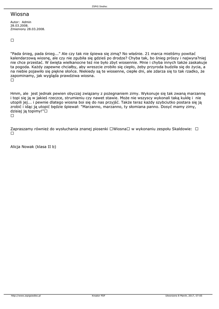 ZSPiG Siedlec Wiosna Autor: Admin 28.03.2008. Zmieniony 28.03.2008. "Pada śnieg, pada śnieg..." Ale czy tak nie śpiewa się zimą? No właśnie. 21 marca mieliśmy powitać kalendarzową wiosnę, ale czy nie zgubiła się gdzieś po drodze? Chyba tak, bo śnieg prószy i najwyra?niej nie chce przestać. W święta wielkanocne też nie było zbyt wiosennie. Mnie i chyba innych także zaskakuje ta pogoda. Każdy zapewne chciałby, aby wreszcie zrobiło się ciepło, żeby przyroda budziła się do życia, a na niebie pojawiło się piękne słońce. Niekiedy są te wiosenne, ciepłe dni, ale zdarza się to tak rzadko, że zapominamy, jak wygląda prawdziwa wiosna. Hmm, ale jest jednak pewien obyczaj związany z pożegnaniem zimy. Wykonuje się tak zwaną marzannę i topi się ją w jakieś rzeczce, strumieniu czy nawet stawie. Może nie wszyscy wykonali taką kukłę i nie utopili jej... i pewnie dlatego wiosna boi się do nas przyjść. Także teraz każdy szybciutko postara się ją zrobić i idąc ją utopić będzie śpiewał: "Marzanno, marzanno, ty słomiana panno. Dosyć mamy zimy, dzisiaj ją topimy!" Zapraszamy również do wysłuchania znanej piosenki Wiosna w wykonaniu zespołu Skaldowie: Alicja Nowak (klasa II b) http://www.zspigsiedlec.pl Kreator PDF Utworzono 8 March, 2017, 07:05