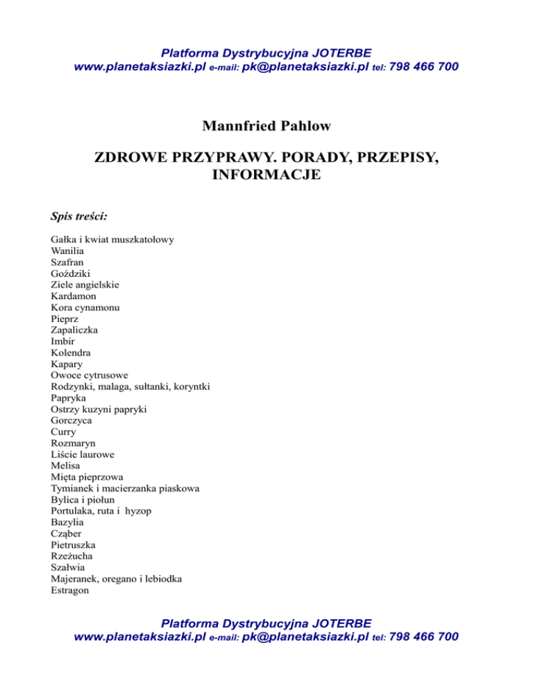 Platforma Dystrybucyjna JOTERBE www.planetaksiazki.pl e-mail: [email protected] tel: 798 466 700 Mannfried Pahlow ZDROWE PRZYPRAWY. PORADY, PRZEPISY, INFORMACJE Spis treści: Gałka i kwiat muszkatołowy Wanilia Szafran Goździki Ziele angielskie Kardamon Kora cynamonu Pieprz Zapaliczka Imbir Kolendra Kapary Owoce cytrusowe Rodzynki, malaga, sułtanki, koryntki Papryka Ostrzy kuzyni papryki Gorczyca Curry Rozmaryn Liście laurowe Melisa Mięta pieprzowa Tymianek i macierzanka piaskowa Bylica i piołun Portulaka, ruta i hyzop Bazylia Cząber Pietruszka Rzeżucha Szałwia Majeranek, oregano i lebiodka Estragon Platforma Dystrybucyjna JOTERBE www.planetaksiazki.pl e-mail: [email protected] tel: 798 466 700 Platforma Dystrybucyjna JOTERBE www.planetaksiazki.pl e-mail: [email protected] tel: 798 466 700 Ogórecznik Lubczyk Trybula Koper Młode, dziko rosnące zioła przyprawowe Koper włoski jako przyprawa i warzywo Anyż Kminek Owoce jałowca Owoce dziko rosnące Seler Cebule Czosnek i czosnek niedźwiedzi Chrzan i rzodkiew Grzyby jako szczególne przyprawy Spis przyprawowe Niektóre przyprawy i ich działanie Platforma Dystrybucyjna JOTERBE www.planetaksiazki.pl e-mail: [email protected] tel: 798 466 700