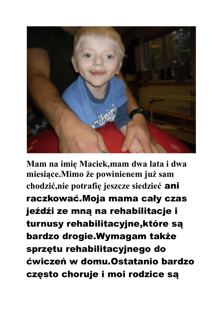 Mam na imię Maciek,mam dwa lata i dwa miesiące.Mimo że powinienem już sam chodzić,nie potrafię jeszcze siedzieć ani raczkować.Moja mama cały czas jeźdźi ze mną na rehabilitacje i turnusy rehabilitacyjne,które są bardzo drogie.Wymagam także sprzętu rehabilitacyjnego do ćwiczeń w domu.Ostatanio bardzo często choruje i moi rodzice są zmuszeni do prywatnej rehabilitacji w domu. Bardzo proszę o przekazanie darowizn i wpłat z 1% podatku. KRS 0000308316 z dopiskiem Maciej Niebrzydowski N/13 Wpłaty z darowizn bardzo proszę wpłacać na konto Fundacji w Spółdzielczym Banku Ludowym w Zakrzewie pod nazwą Fundacja Złotowianka 77-400 Złotów,Widokowa 1 NR konta 25 89 44 0003 0002 7430 2000 0010 Z dopiskiem:darowizna na rzecz,Macieja Niebrzydowskiego N/13 Wszystkim którzy chcą mi pomóc być zdrowym bardzo serdecznie dziękuje w swoim imieniu i moich rodziców.