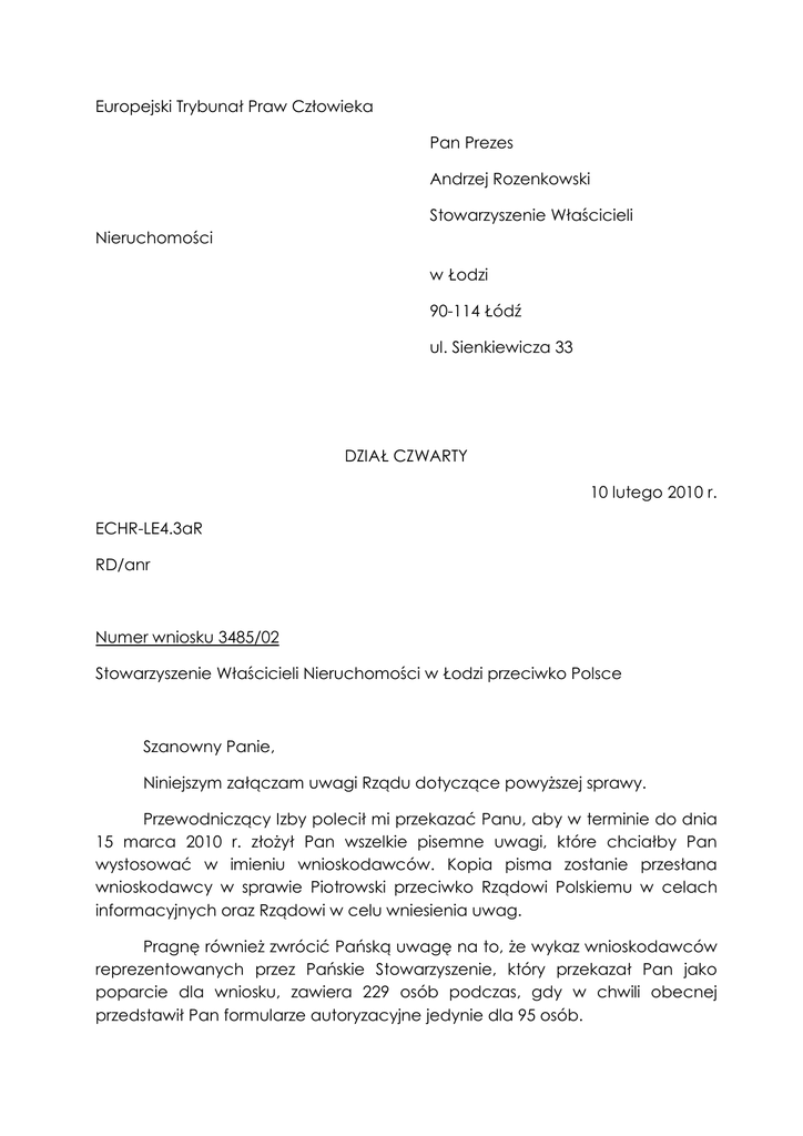 Europejski Trybunał Praw Człowieka Pan Prezes Andrzej Rozenkowski Stowarzyszenie Właścicieli Nieruchomości w Łodzi 90-114 Łódź ul. Sienkiewicza 33 DZIAŁ CZWARTY 10 lutego 2010 r. ECHR-LE4.3aR RD/anr Numer wniosku 3485/02 Stowarzyszenie Właścicieli Nieruchomości w Łodzi przeciwko Polsce Szanowny Panie, Niniejszym załączam uwagi Rządu dotyczące powyższej sprawy. Przewodniczący Izby polecił mi przekazać Panu, aby w terminie do dnia 15 marca 2010 r. złożył Pan wszelkie pisemne uwagi, które chciałby Pan wystosować w imieniu wnioskodawców. Kopia pisma zostanie przesłana wnioskodawcy w sprawie Piotrowski przeciwko Rządowi Polskiemu w celach informacyjnych oraz Rządowi w celu wniesienia uwag. Pragnę również zwrócić Pańską uwagę na to, że wykaz wnioskodawców reprezentowanych przez Pańskie Stowarzyszenie, który przekazał Pan jako poparcie dla wniosku, zawiera 229 osób podczas, gdy w chwili obecnej przedstawił Pan formularze autoryzacyjne jedynie dla 95 osób. Ponadto dwa formularze zostały podpisane przez osoby, które nie są uwzględnione na pierwotnym wykazie wnioskodawców – Pani Ludwiczak i Pani Kukiełka. Zwracam się do Pana z prośbą o wyjaśnienie niezgodności oraz o przesłanie pozostałych formularzy autoryzacyjnych wraz z Pańskim stanowiskiem w odniesieniu do uwag Rządu. W przeciwnym wypadku Trybunał może przyjąć, że wnioskodawcy, o których mowa nie są już zainteresowani dochodzeniem swych roszczeń i nie zamierzają kontynuować postępowań skargowych. Z poważaniem, T. L. Early Wydział Rejestracji Załączniki: - Uwagi Rządu Dane adresowe: Rada Europy 67075 Strasburg, Cedex Francja nr tel. 33 0 3 88 41 20 18 nr fax 33 0 88 41 27 30 www.echr.coe.int STOWARZYSZENIE WŁAŚCICIELI NIERUCHOMOŚCI W ŁODZI przeciwko POLSCE Numer wniosku 3485/02 UWAGI DOTYCZĄCE DOPUSZCZALNOŚCI ORAZ ZAKRESU MERYTORYCZNEGO wniesione przez Rząd Polski Rzeczpospolita Polska Ministerstwo Spraw Zagranicznych Pełnomocnik Ministra Spraw Zagranicznych ds. postępowań i procedur przed Europejskim Trybunałem Praw Człowieka Przedstawiciel Rządu Polskiego BPOM 243-270-2009 Warszawa, 29 stycznia 2010 r. Pan T. L. Early Wydział Rejestracji Działu Czwartego Europejski Trybunał Praw Człowieka Rada Europy DROGĄ PRZEKAZU ELEKTRONICZNEGO Numer wniosku 3485/02 Stowarzyszenie Właścicieli Nieruchomości w Łodzi przeciwko Polsce Szanowny Panie, W nawiązaniu do wyżej wymienionego wniosku niniejszym przesyłam Panu kopię uwag Rządu Polskiego dotyczących dopuszczalności oraz zakresu merytorycznego. Z poważaniem, Jakub Wołąsiewicz Przedstawiciel Rządu Polska, 00-580 Warszawa, al. Szucha 23, tel. (004822)5238-164, fax (004822)5239-512 email: [email protected] SPIS TREŚCI IWPROWADZENIE …………………..........................………………………. 4 IISTANFAKTYCZNY …………………...............................………………… 7 IIISTANPRAWNY ………………………............................………………… 8 A WYMOGI FORMALNE DOPUSZCZALNOŚCI WNIOSKU…................... 8 1. Zgodność przesłanki ratione temporis (właściwość czasowa) z przepisamiKonwencj ...................................................………. 8 B WYMOGI MATERIALNE DOPUSZCZALNOŚCI WNIOSKU ………………….. 8 1. Wyczerpanie środków prawa krajowego ……………………….. 8 2. Z uwzględnieniem pytania I Trybunału ………………………… 9 2.1. Ustawa z dnia 15 grudnia 2006 r. zmieniająca ustawę o ochronie praw lokatorów, gminnych zasobach mieszkaniowych i ustawę Kodeks cywilny oraz związane przepisy orzecznictwa sądów krajowych ………………… 10 2.2. Ustawa z dnia 24 sierpnia 2007 r. zmieniająca ustawę o administracji nieruchomościami i innych ustaw oraz Rozporządzenie Ministra Infrastruktury z dnia 27 grudnia 2007 r. w sprawie szczegółowego opracowania danych dotyczących najmu lokali niestanowiących publicznego zasobu mieszkaniowego, a położonych na terenach gminnych lub części tych terenów ……………......... 12 2.3. Ustawa z dnia 17 grudnia 2009 r. zmieniająca ustawę o ochronie praw lokatorów, gminnych zasobach mieszkaniowych i ustawę Kodeks cywilny oraz innych ustaw .. 13 2.4. Ustawa z dnia 8 grudnia 2006 r. o finansowym wsparciu tworzenia lokali socjalnych, mieszkań chronionych, noclegowni i domów dla bezdomnych i ustawa z dnia 12 lutego 2009 r. zmieniająca ustawę o finansowym wsparciu tworzenia lokali socjalnych, mieszkań chronionych, noclegowni i domów dla bezdomnych oraz ustawę o szczególnych formach wpierania budownictwa mieszkaniowego ….......................................................… 15 2.5. Ustawa z dnia 21 listopada 2008 r. o wspieraniu termomodernizacji i remontów …………......……………. 16 1 Premie termomodernizacji …………..…………… 17 2 Premie remontowe ………………………………….. 18 3 Premie wyrównawcze …….……………………….. 19 3. Z uwzględnieniem pytania II Trybunału …………………… 24 3.1. Omówienie wzoru wylicz. premii wyrównawczych .. 24 3.2. Uzasadnienie wskazania daty 25 kwietnia 2005 r. jako terminu ostatecznego przyznawania premii wyrówn. …. 26 3.3. Omówienie warunków przyznawania premii wyrównawczych ...........................................................28 3.4. Kalkulacje …….....................…………………………. 32 1 Sytuacja A …………………………………………………. 32 A. 1. Dane dodatkowe konieczne do wyliczenia premii wyrównawczej ……………………………. 32 - wskaźnik kosztowy projektu dla potrzeb wyliczenia premii wyrównawczej ……......................………. 32 - wskaźnik konwersji …………………………………… 34 A. 2. Kalkulacje ………………………………………. 35 A. 3. Spr. wyników kalkulacji przy pomocy wzoru . 38 2 Sytuacja B ……………………….......