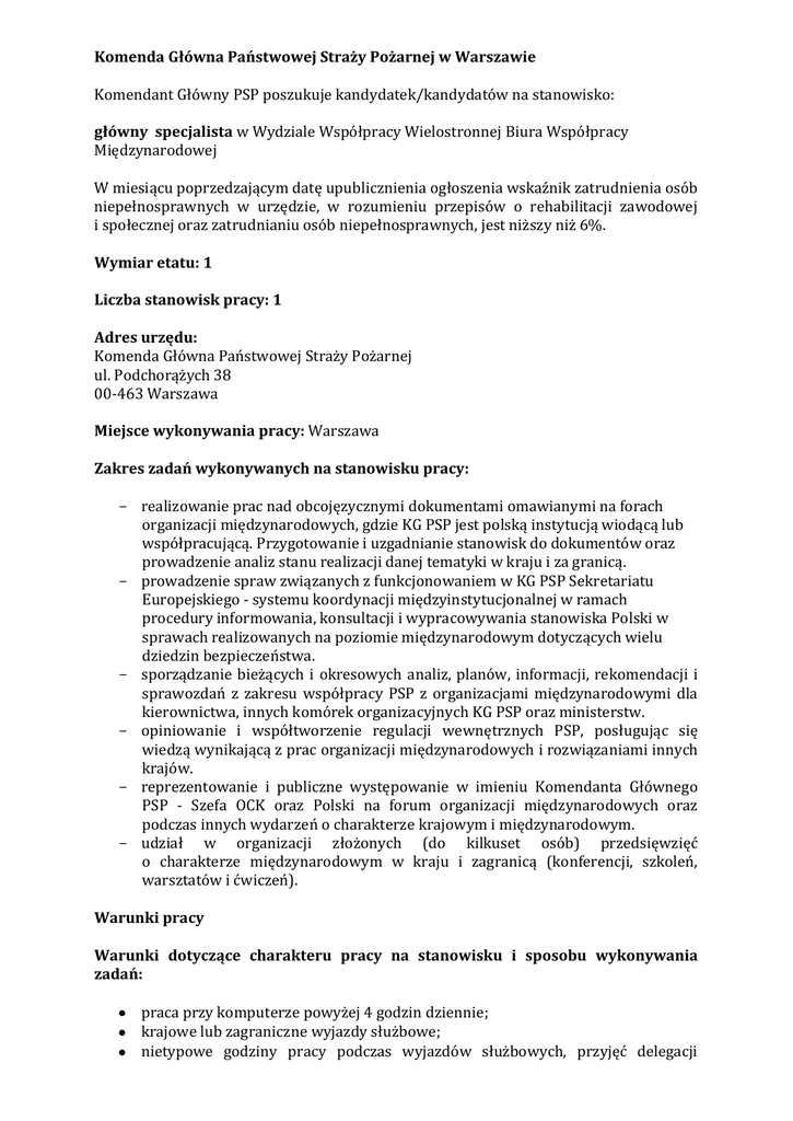 Komenda Główna Państwowej Straży Pożarnej w Warszawie Komendant Główny PSP poszukuje kandydatek/kandydatów na stanowisko: główny specjalista w Wydziale Współpracy Wielostronnej Biura Współpracy Międzynarodowej W miesiącu poprzedzającym datę upublicznienia ogłoszenia wskaźnik zatrudnienia osób niepełnosprawnych w urzędzie, w rozumieniu przepisów o rehabilitacji zawodowej i społecznej oraz zatrudnianiu osób niepełnosprawnych, jest niższy niż 6%. Wymiar etatu: 1 Liczba stanowisk pracy: 1 Adres urzędu: Komenda Główna Państwowej Straży Pożarnej ul. Podchorążych 38 00-463 Warszawa Miejsce wykonywania pracy: Warszawa Zakres zadań wykonywanych na stanowisku pracy: - realizowanie prac nad obcojęzycznymi dokumentami omawianymi na forach organizacji międzynarodowych, gdzie KG PSP jest polską instytucją wiodącą lub współpracującą. Przygotowanie i uzgadnianie stanowisk do dokumentów oraz prowadzenie analiz stanu realizacji danej tematyki w kraju i za granicą. - prowadzenie spraw związanych z funkcjonowaniem w KG PSP Sekretariatu Europejskiego - systemu koordynacji międzyinstytucjonalnej w ramach procedury informowania, konsultacji i wypracowywania stanowiska Polski w sprawach realizowanych na poziomie międzynarodowym dotyczących wielu dziedzin bezpieczeństwa. - sporządzanie bieżących i okresowych analiz, planów, informacji, rekomendacji i sprawozdań z zakresu współpracy PSP z organizacjami międzynarodowymi dla kierownictwa, innych komórek organizacyjnych KG PSP oraz ministerstw. - opiniowanie i współtworzenie regulacji wewnętrznych PSP, posługując się wiedzą wynikającą z prac organizacji międzynarodowych i rozwiązaniami innych krajów. - reprezentowanie i publiczne występowanie w imieniu Komendanta Głównego PSP - Szefa OCK oraz Polski na forum organizacji międzynarodowych oraz podczas innych wydarzeń o charakterze krajowym i międzynarodowym. - udział w organizacji złożonych (do kilkuset osób) przedsięwzięć o charakterze międzynarodowym w kraju i zagranicą (konferencji, szkoleń, warsztatów i ćwiczeń). Warunki pracy Warunki dotyczące charakteru pracy na stanowisku i sposobu wykonywania zadań: praca przy komputerze powyżej 4 godzin dziennie; krajowe lub zagraniczne wyjazdy służbowe; nietypowe godziny pracy podczas wyjazdów służbowych, przyjęć delegacji zagranicznych, w okresie bezpośrednio poprzedzającym organizowane wydarzenia oraz w czasie zintensyfikowanych prac negocjacyjnych nad dokumentami międzynarodowymi; częste reprezentowanie urzędu na zewnątrz. Miejsce i otoczenie organizacyjno-techniczne stanowiska pracy: budynek i pomieszczenia urzędu niedostosowane do potrzeb osób niepełnosprawnych poruszających się na wózkach inwalidzkich w trakcie wyjazdów służbowych warunki świadczenia pracy są zróżnicowane, mogą nie być dostosowane do wymagań osób niepełnosprawnych. Wymagania związane ze stanowiskiem pracy niezbędne wykształcenie: wyższe magisterskie lub równorzędne (preferowane kierunki: stosunki międzynarodowe, europeistyka, politologia, filologie obce, socjologia, prawo, bezpieczeństwo) doświadczenie zawodowe: powyżej 3 lat doświadczenia we współpracy międzynarodowej, w organizacji przedsięwzięć o charakterze krajowym i międzynarodowym i/lub doświadczenie w administracji publicznej, w obszarze ratownictwa i ochrony ludności; ew. 1 rok doświadczenia w zarządzaniu projektami pozostałe wymagania niezbędne: znajomość języka angielskiego na poziomie bardzo dobrym komunikatywność umiejętność negocjowania wiedza z zakresu funkcjonowania organizacji międzynarodowych umiejętność analitycznego myślenia umiejętności redakcyjne biegła znajomość obsługi komputera, w tym pakietu MS Office lub równoważnego znajomość ustawy o służbie cywilnej dodatkowe studia podyplomowe (preferowane: polityka międzynarodowa, prawo europejskie, bezpieczeństwo) znajomość innego języka urzędowego UE na poziomie dobrym poświadczenie bezpieczeństwa upoważniające do dostępu do informacji niejawnych oznaczonych klauzula „TAJNE” oraz SECRET UE/EU SECRET i NATO SECRET oraz przeszkolenie z zakresu ochrony informacji niejawnych umiejętność kierowania zespołem wiedza z zakresu funkcjonowania administracji publicznej prawo jazdy kategorii B Wymagane dokumenty i oświadczenia: życiorys i list motywacyjny oświadczenie o wyrażeniu zgody na przetwarzanie danych osobowych do celów rekrutacji kopie dokumentów potwierdzających wykształcenie kopia dokumentu potwierdzającego posiadanie polskiego obywatelstwa lub oświadczenie o posiadaniu obywatelstwa polskiego oświadczenie o nieskazaniu prawomocnym wyrokiem za umyślne przestępstwo lub umyślne przestępstwo skarbowe oświadczenie o korzystaniu z pełni praw publicznych oświadczenie o wyrażeniu zgody na przeprowadzenie postępowania sprawdzającego uprawniającego do dostępu do informacji niejawnych oznaczonych klauzulą „TAJNE” oraz SECRET UE/EU SECRET i NATO SECRET (w przypadku nieposiadania ww. poświadczeń bezpieczeństwa) kopie dokumentów potwierdzających zatrudnienie, Inne dokumenty i oświadczenia: - kopia dokumentu potwierdzającego niepełnosprawność – w przypadku kandydatek/kandydatów, którzy zamierzają skorzystać z pierwszeństwa w zatrudnieniu w przypadku, gdy znajda się w gronie najlepszych kandydatek/kandydatów, - kopie dokumentów potwierdzających spełnienie wymagań dodatkowych. Termin składania dokumentów: 30.09.2015 r. Miejsce składania dokumentów: Przesłać na adres: Komenda Główna Państwowej Straży Pożarnej Biuro Kadr i Organizacji ul. Podchorążych 38 00-463 Warszawa Składać osobiście: w siedzibie urzędu przy ul. Podchorążych 38 w kancelarii ogólnej w godz. pracy 8.15 -16.15. Inne informacje: Komendant Główny PSP zaprasza do udziału w naborze również osoby niepełnosprawne (z uwzględnieniem informacji dotyczących miejsca i otoczenia
