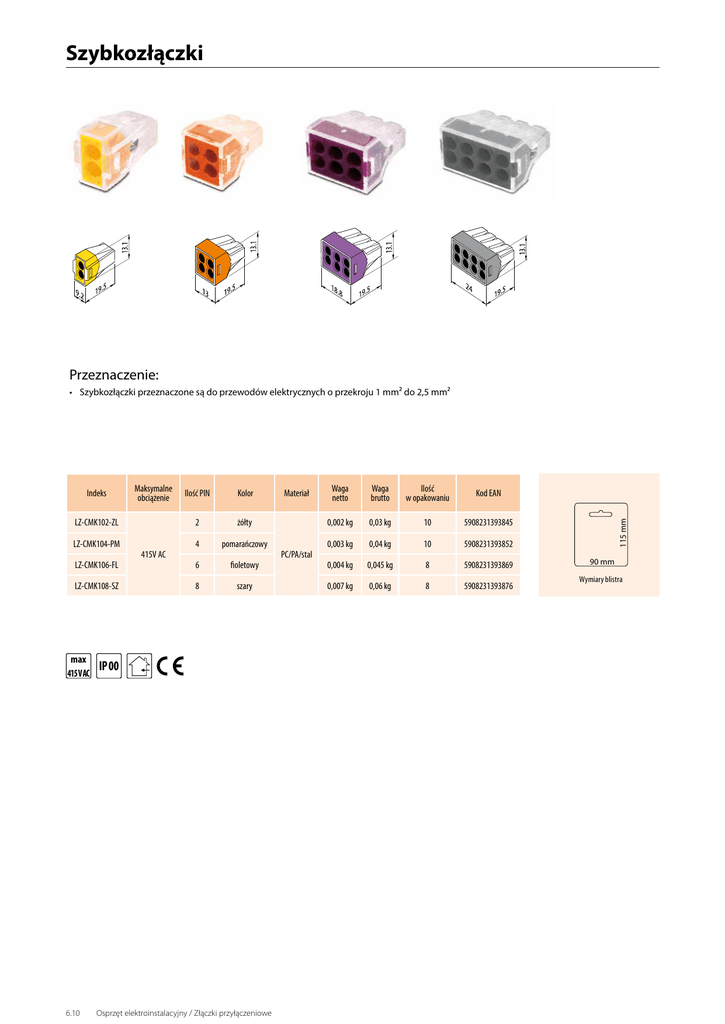 Szybkozłączki Przeznaczenie: Indeks Maksymalne obciążenie LZ-CMK102-ZL LZ-CMK104-PM LZ-CMK106-FL LZ-CMK108-SZ max 415 V AC 6.10 415V AC Ilość PIN Kolor 2 żółty 4 pomarańczowy 6 fioletowy 8 szary IP 00 Osprzęt elektroinstalacyjny / Złączki przyłączeniowe Materiał PC/PA/stal Waga netto Waga brutto Ilość w opakowaniu Kod EAN 0,002 kg 0,03 kg 10 5908231393845 0,003 kg 0,04 kg 10 5908231393852 0,004 kg 0,045 kg 8 5908231393869 0,007 kg 0,06 kg 8 5908231393876 115 mm • Szybkozłączki przeznaczone są do przewodów elektrycznych o przekroju 1 mm2 do 2,5 mm2 90 mm Wymiary blistra
